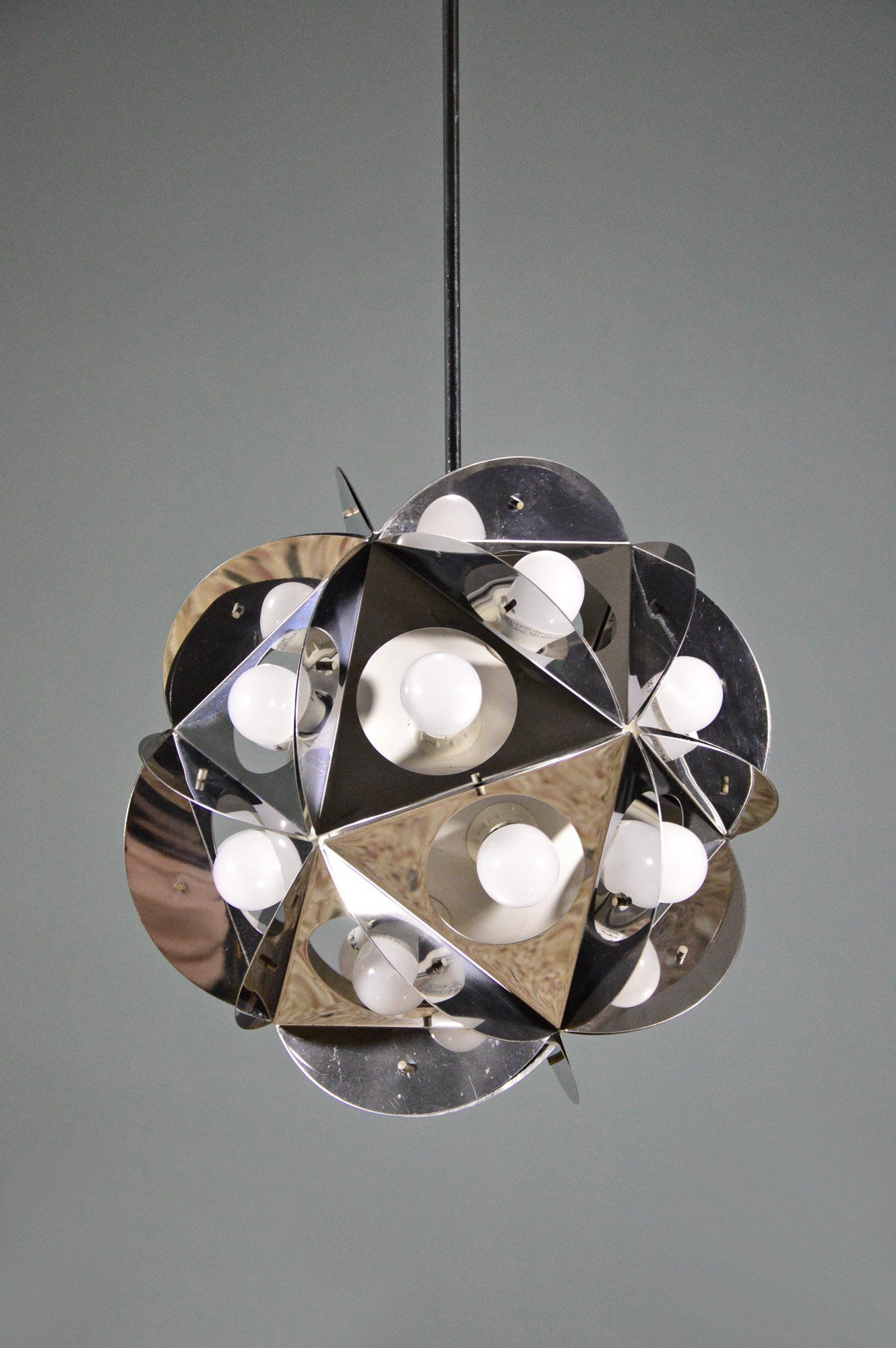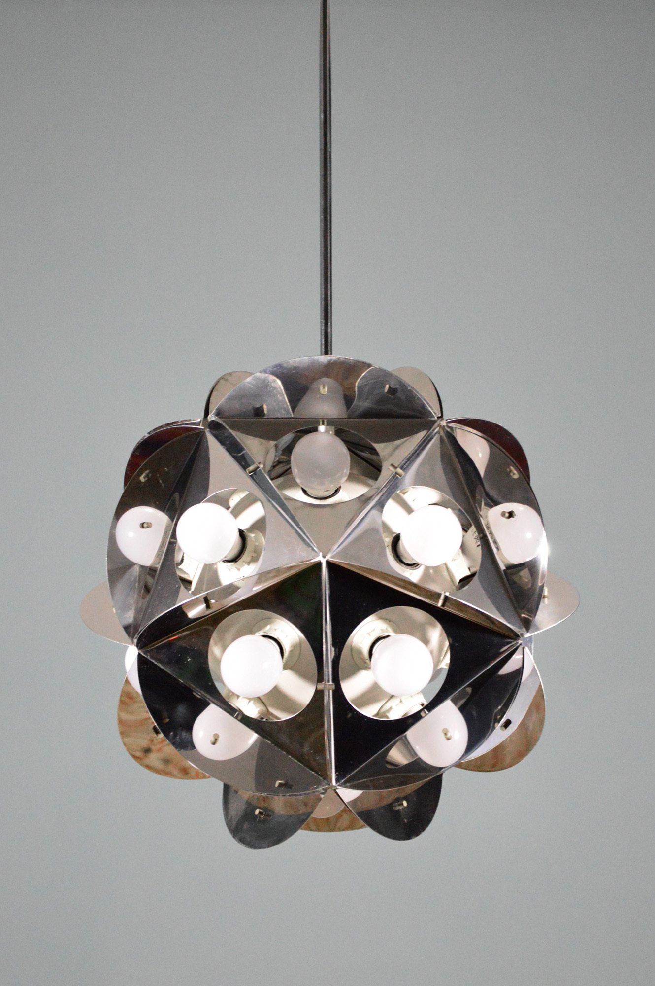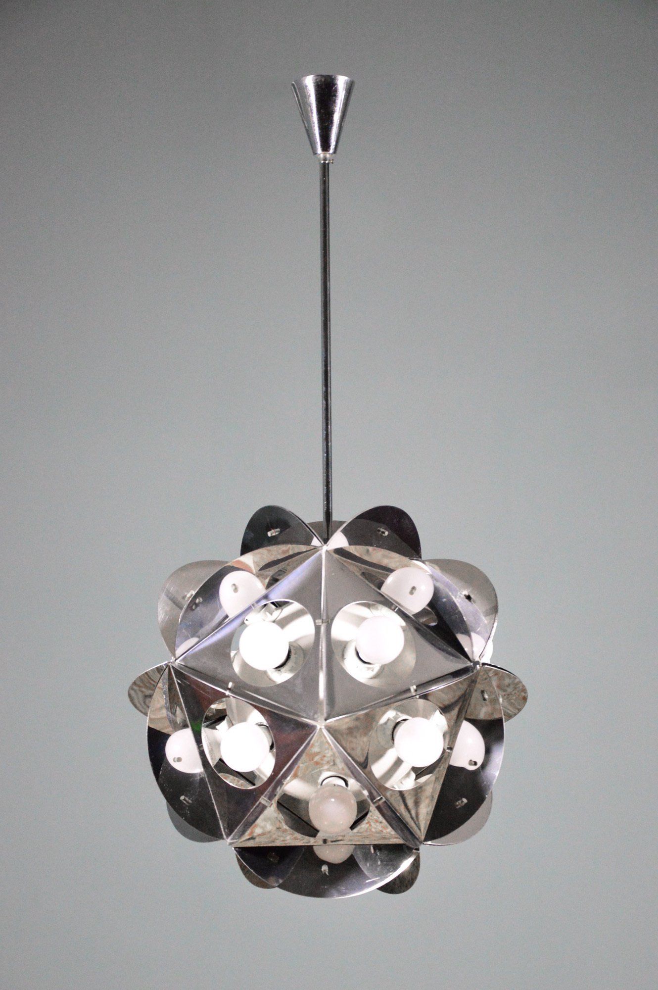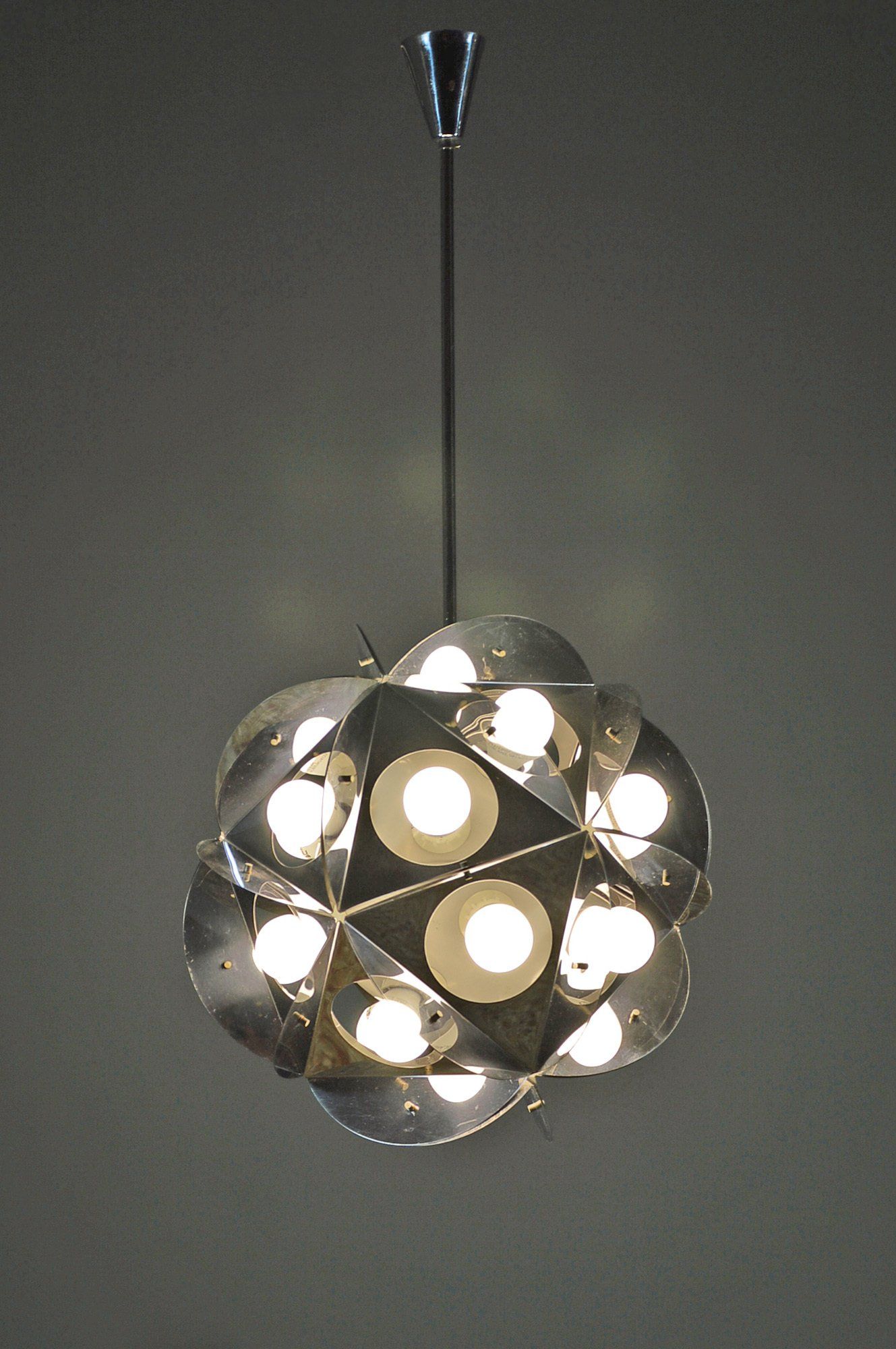 Angelo Lelii founded the Arredoluce company in the post-war period, producing and designing lamps of high design and construction quality. The chandelier is in excellent original condition. The ceiling attachment cup is oxidised in an irregular manner - cm 60øx127h -