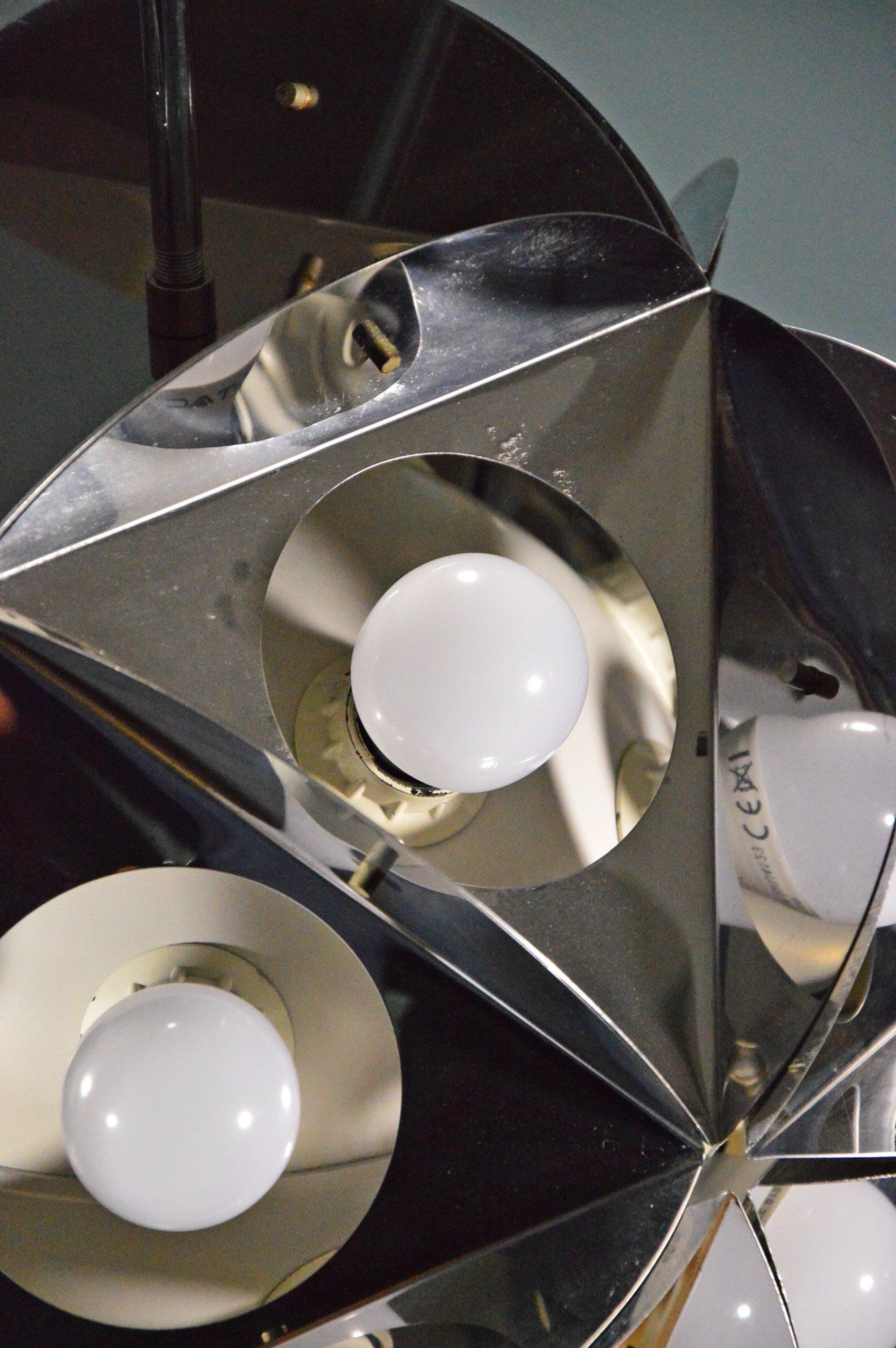 It carries 3 bulbs with an E27 socket, 2 on the sides that illuminate the lampshade and 1 in the upper bowl that sends light upwards, the bulbs can be switched on separately.