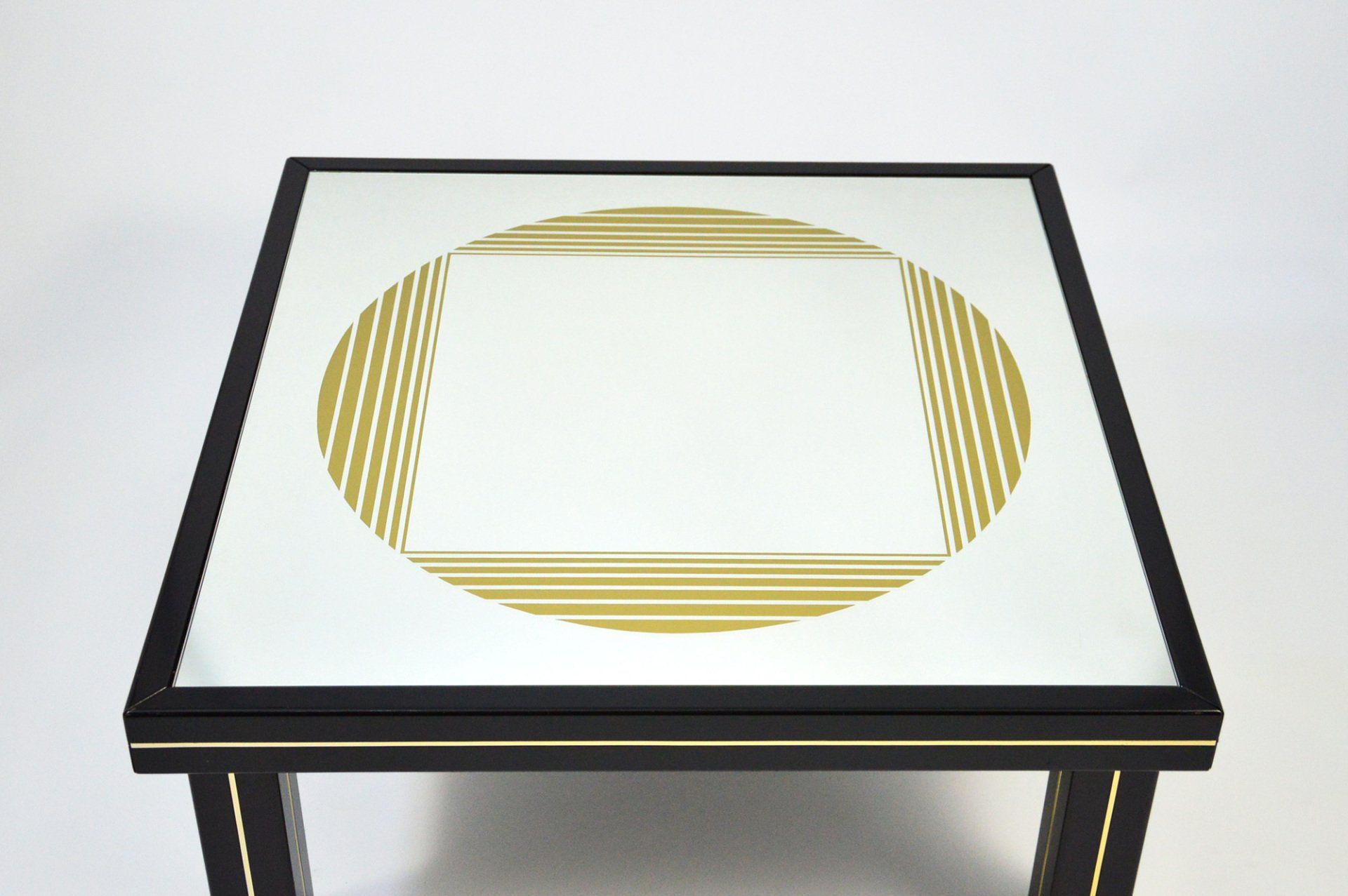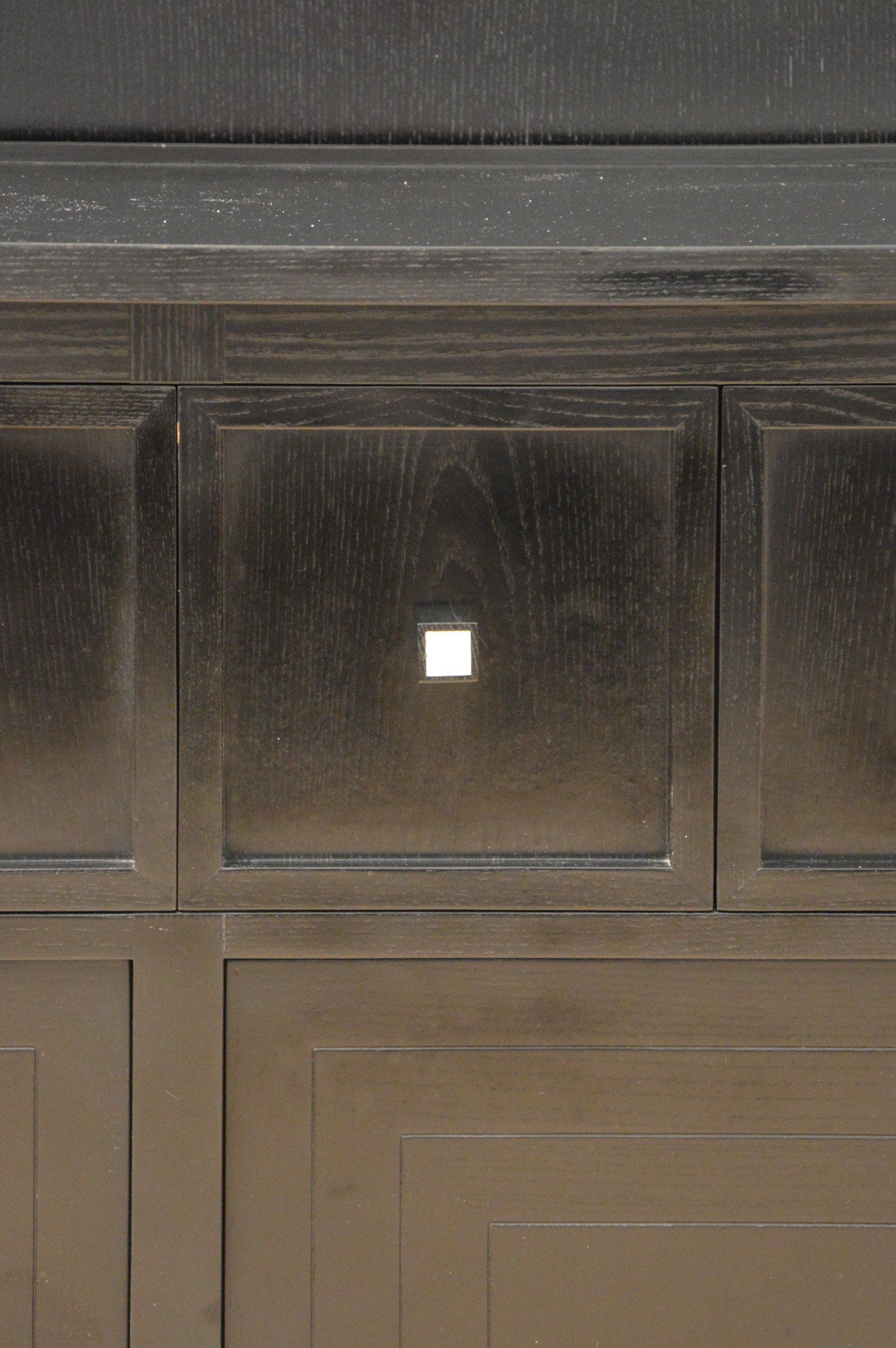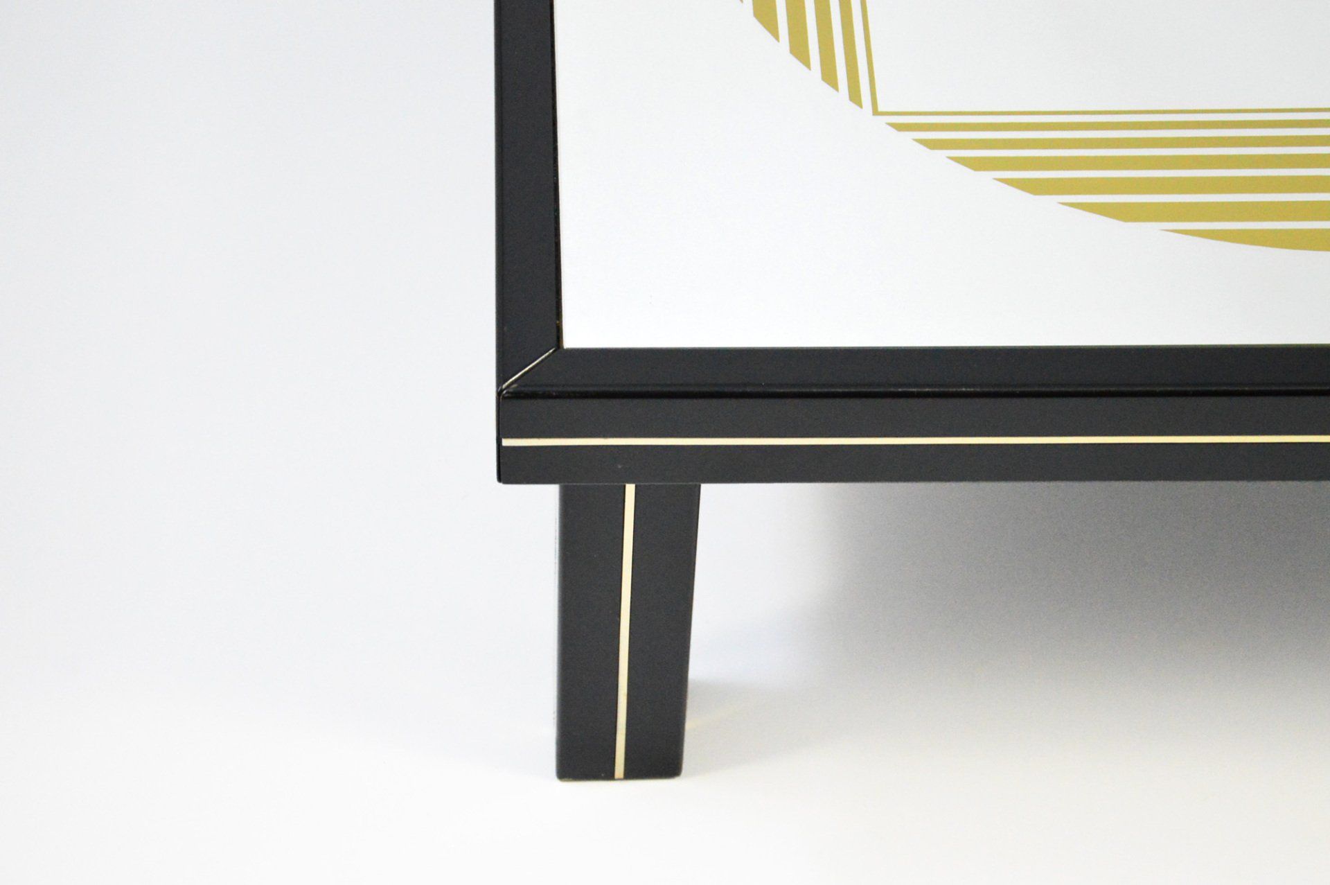 The drawers are in mahogany and black lacquered wood. The handles are in burnished brass.