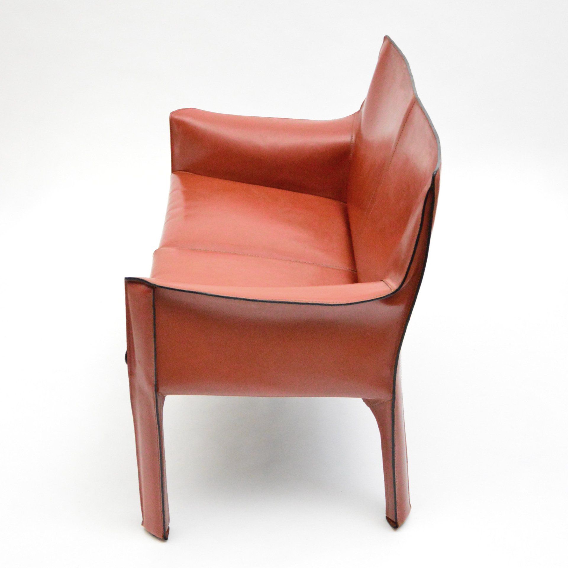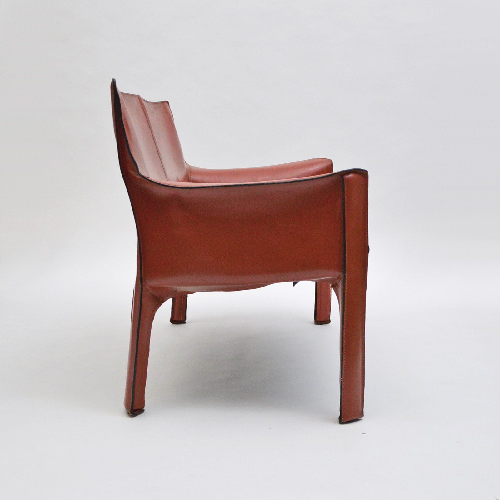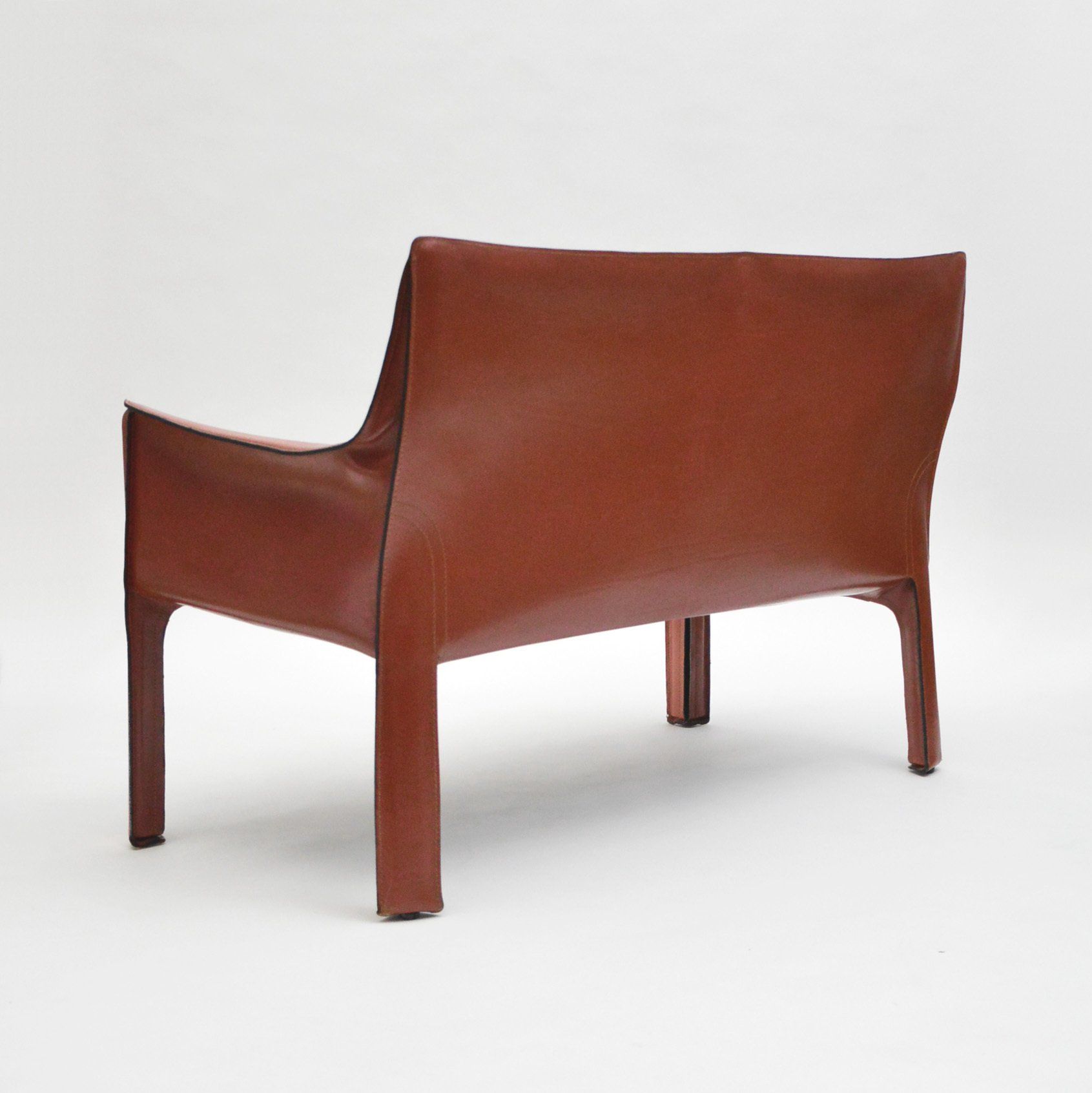 The Cab series, designed by Mario Bellini for Cassina in 1977, was conceived in a completely original way, subsequently imitated by many designers and companies. The sofa has a steel frame, covered with a leather "dress" made up of different parts sewn together, which close around the frame through zips, just like a dress. Its particularly small dimensions make it a truly versatile piece of furniture, suitable for the most diverse contexts. The sofa is in very good condition, with slight signs of time and use, commensurate with its age. Of note is a rectangular shaped incision on the right cushion. Not being deep, this is only visible in certain light conditions. - cm 117x79hx65