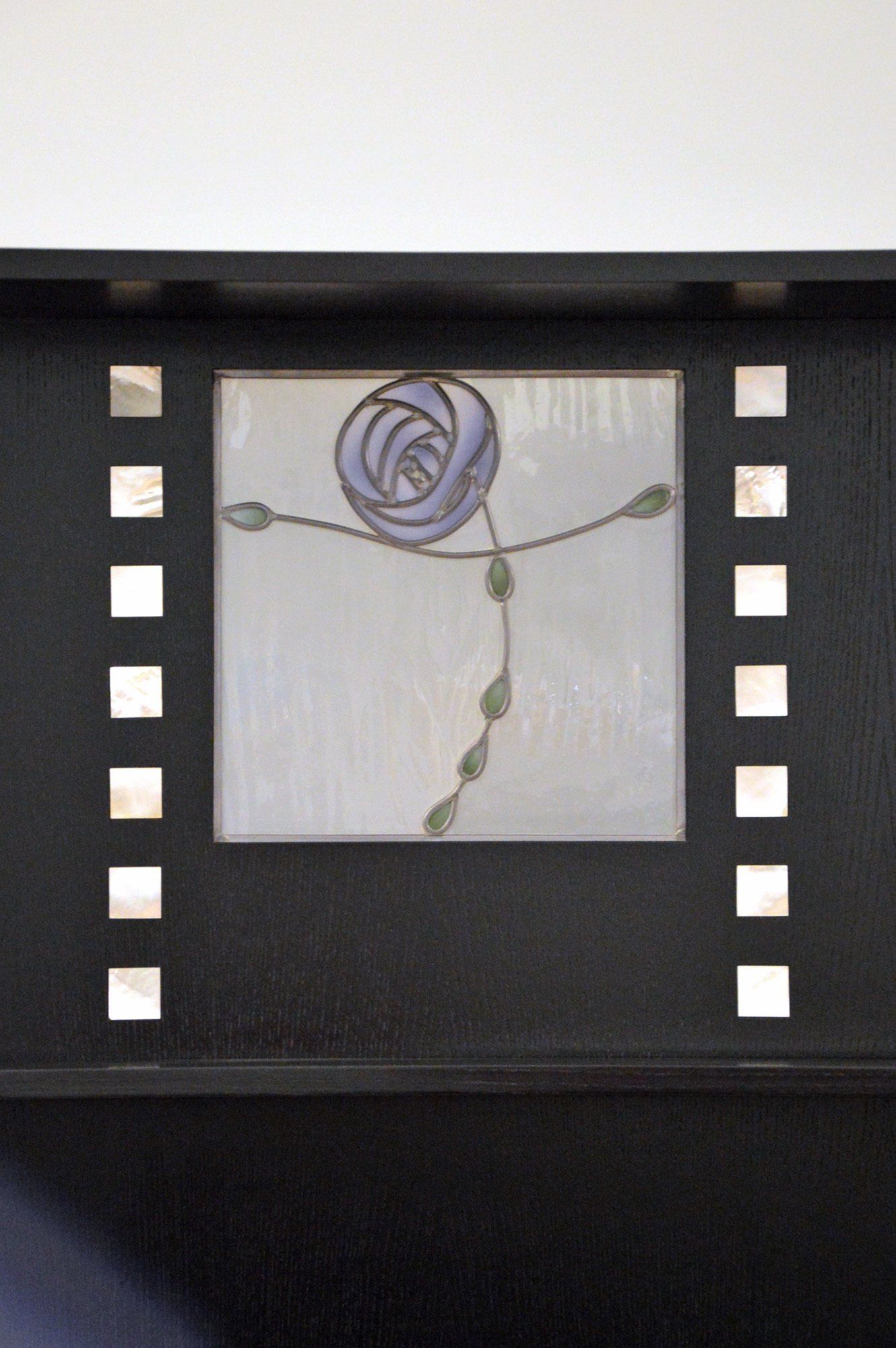 Sideboard in open pore black stained ash, with mother-of-pearl inserts, decorated with lead crystal panels. Designed by the Scottish designer Charles Rennie Mackintosh in 1918 and produced in Italy by Cassina starting from 1975.