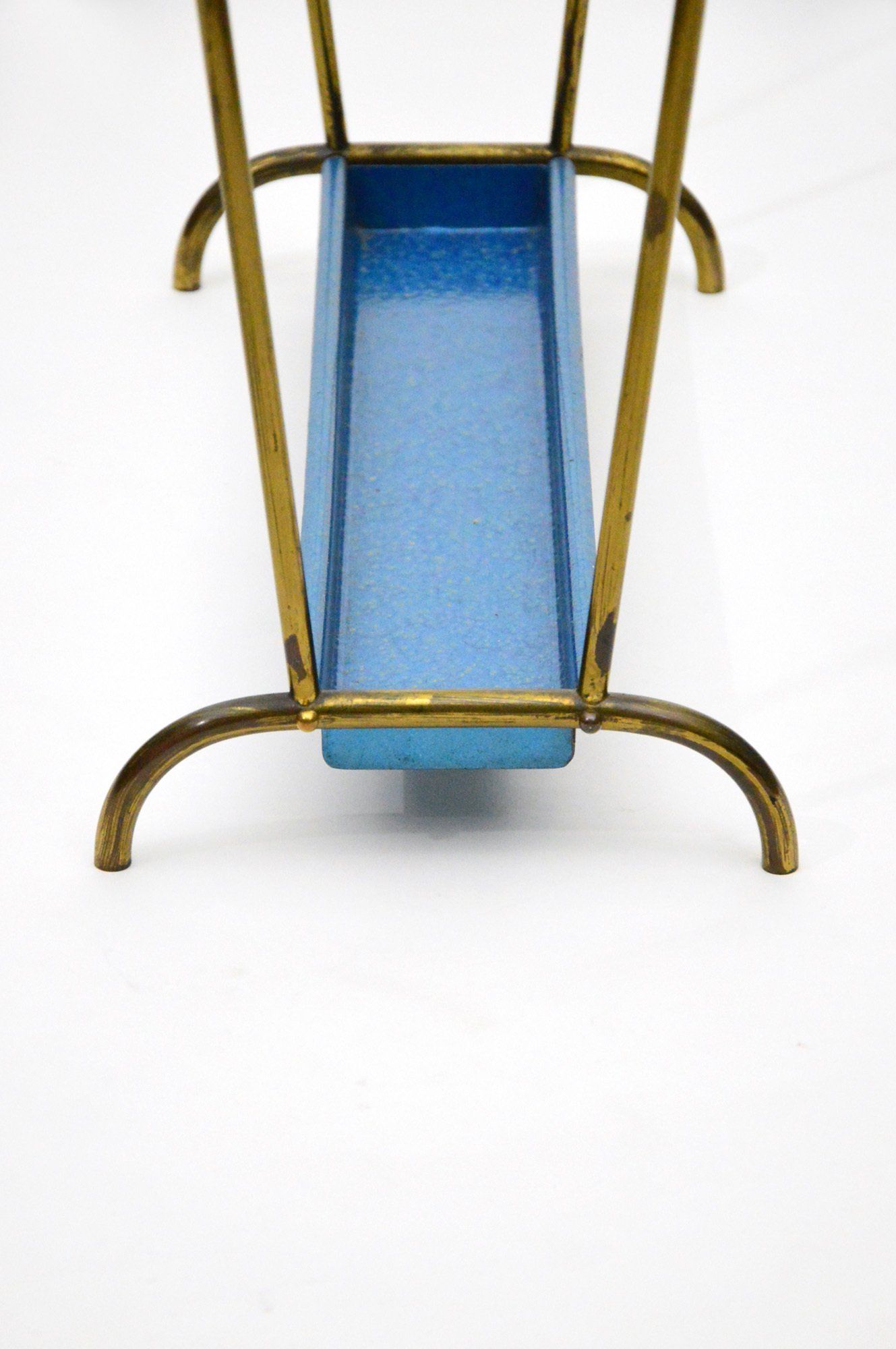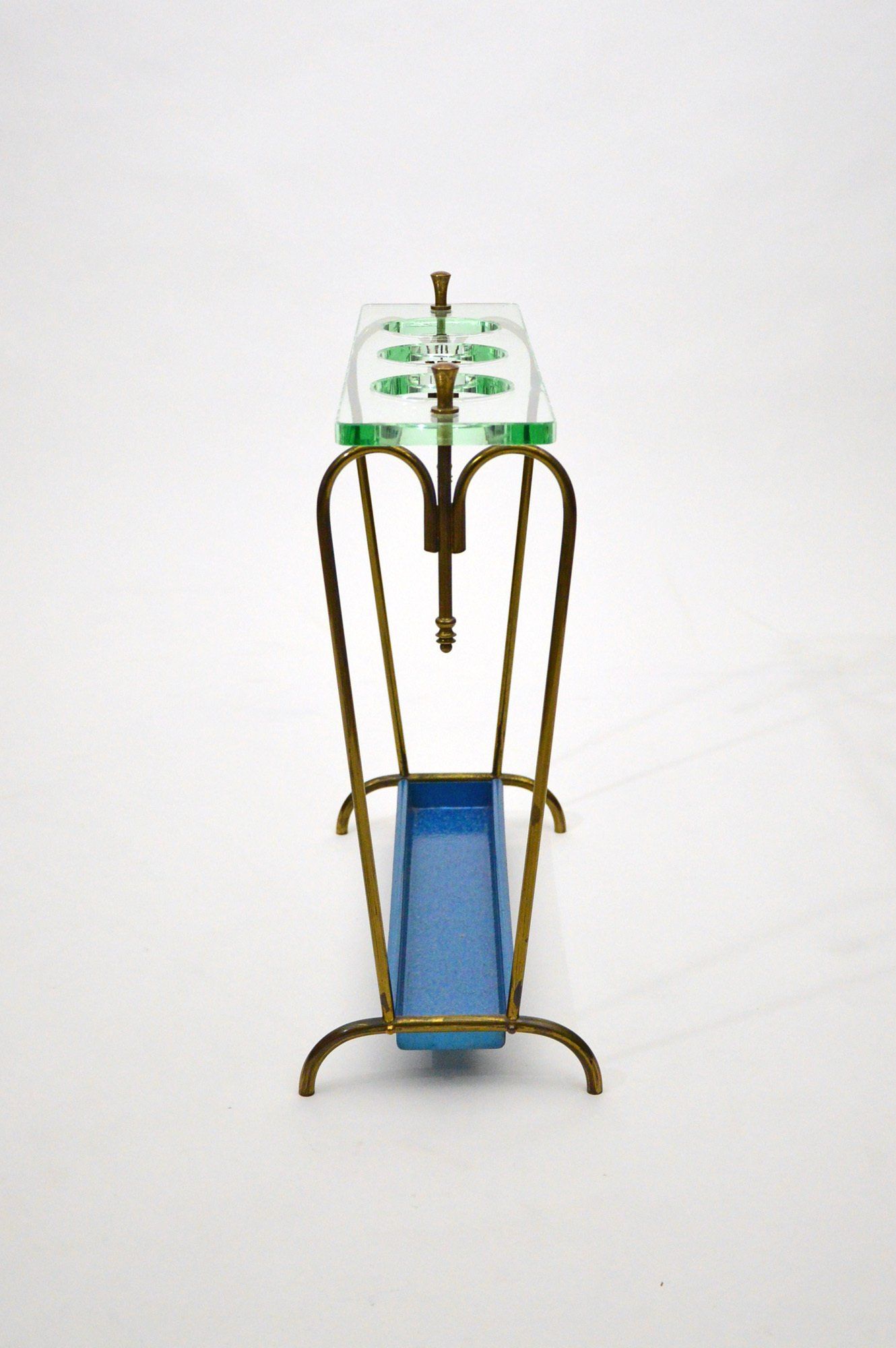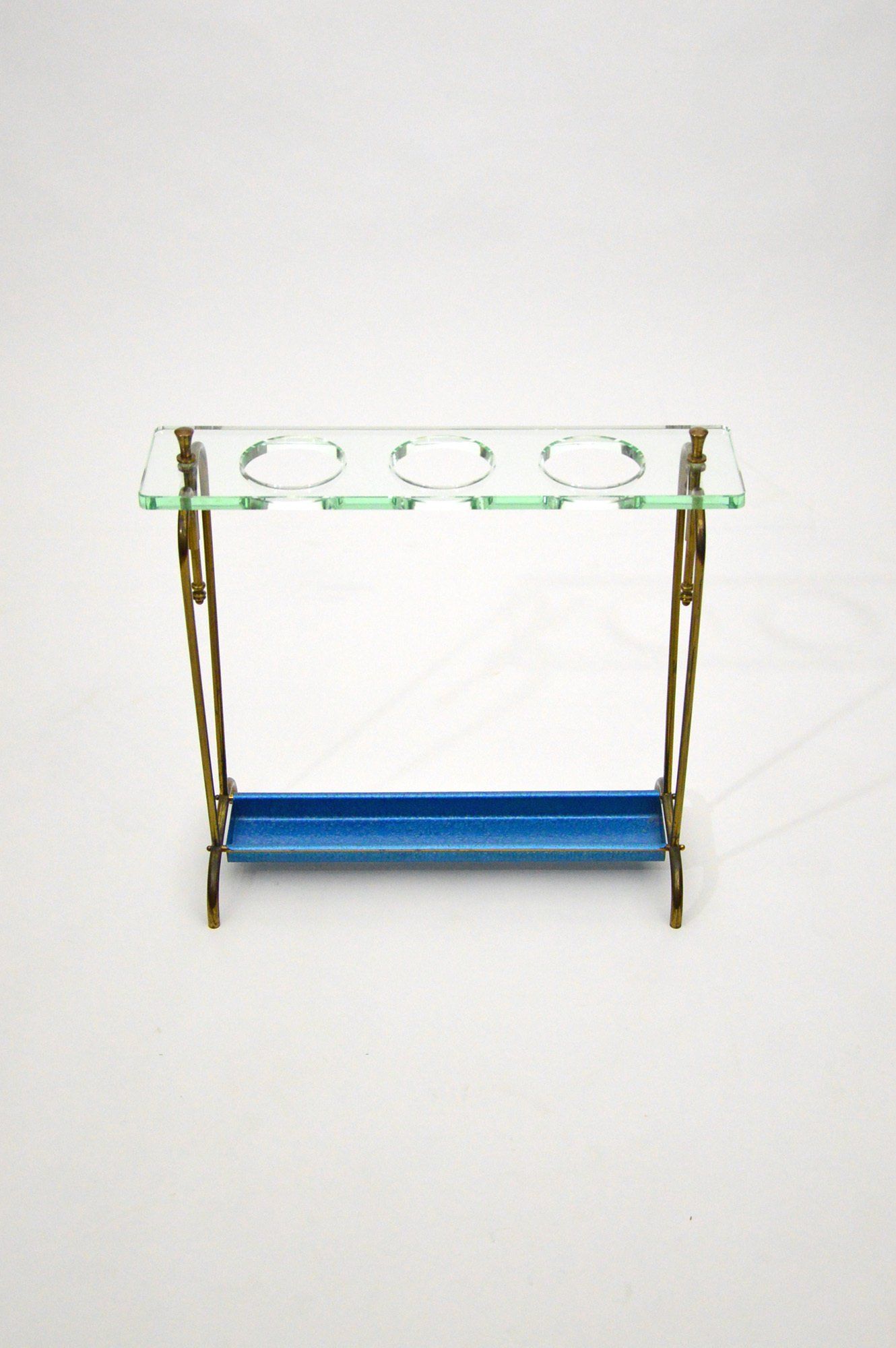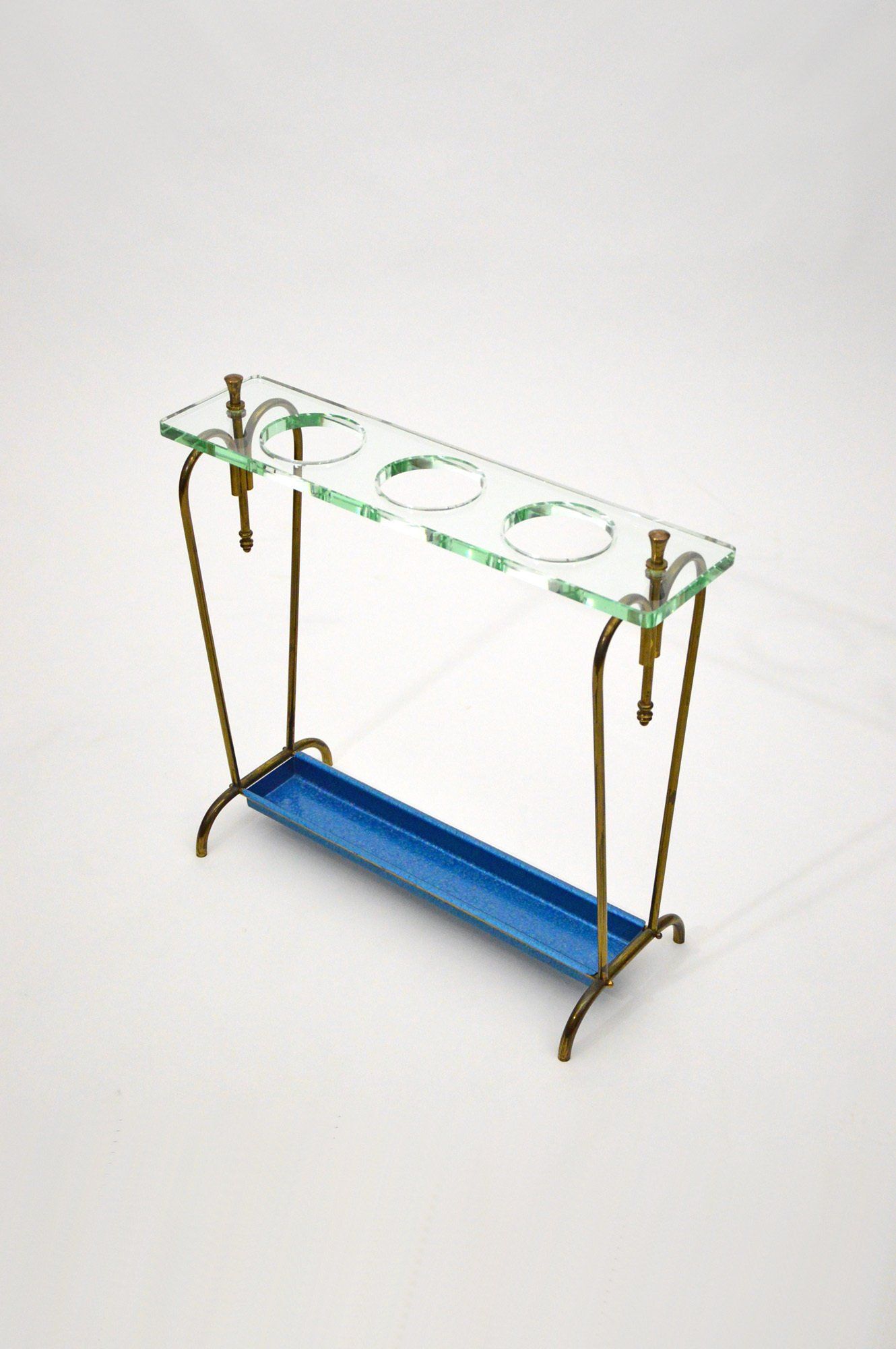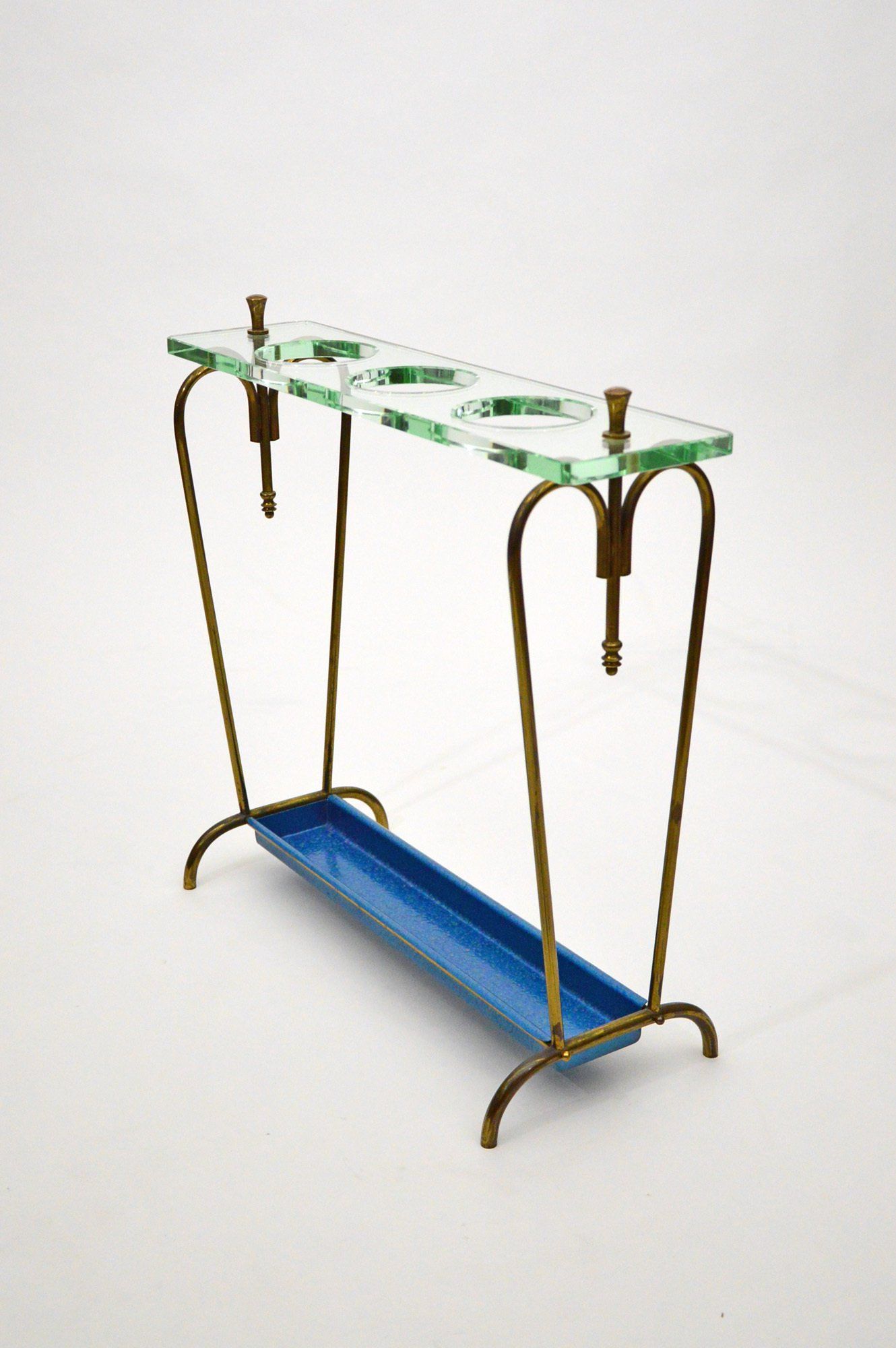 Umbrella stand in crystal and brass, with blue painted metal tray with hammered finish, typical of the period.