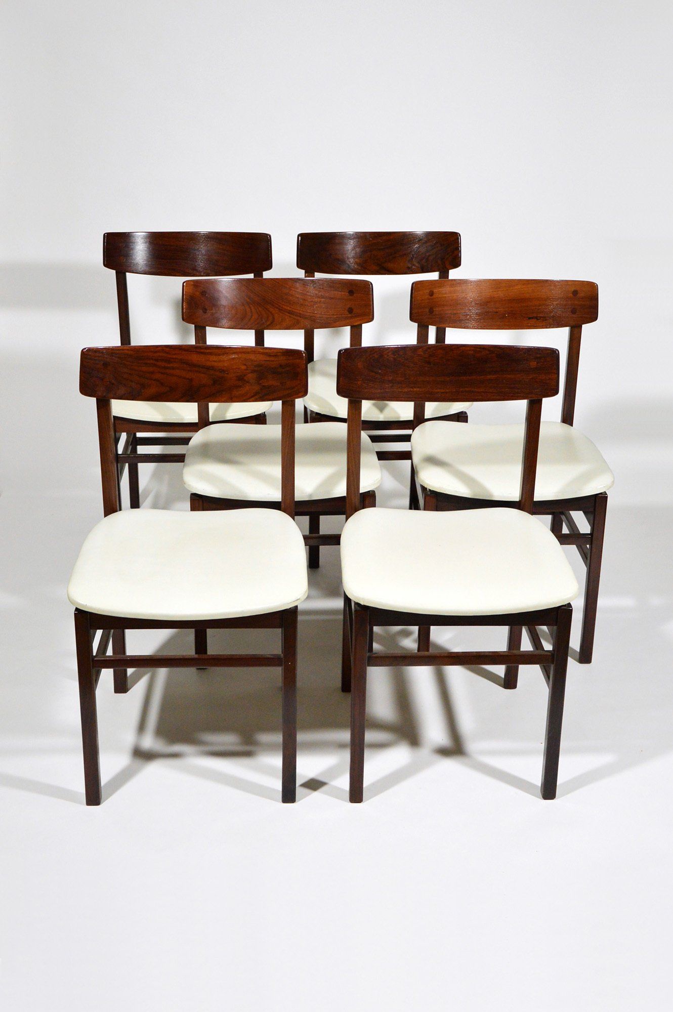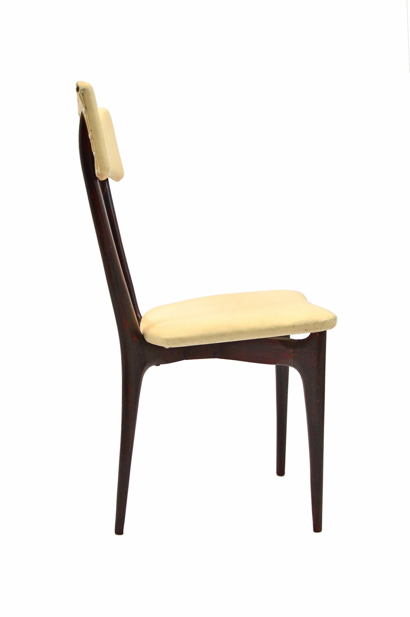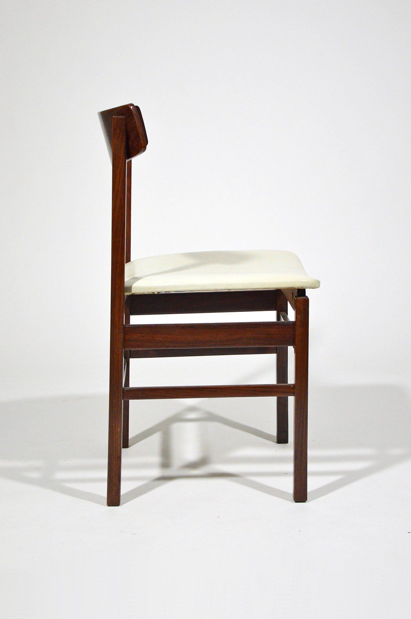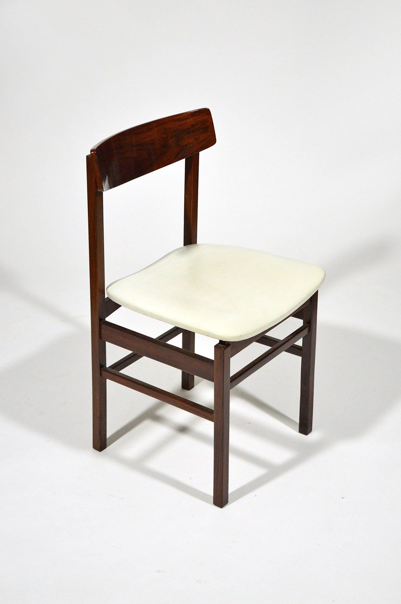 Set of 6 dining chairs in rosewood and ivory leatherette, probably made in italy in the 1960s, with essential and elegant lines, solid and sturdy. In very good original condition, the leatherette upholstery shows some normal signs of time, but the chairs are ready to use.