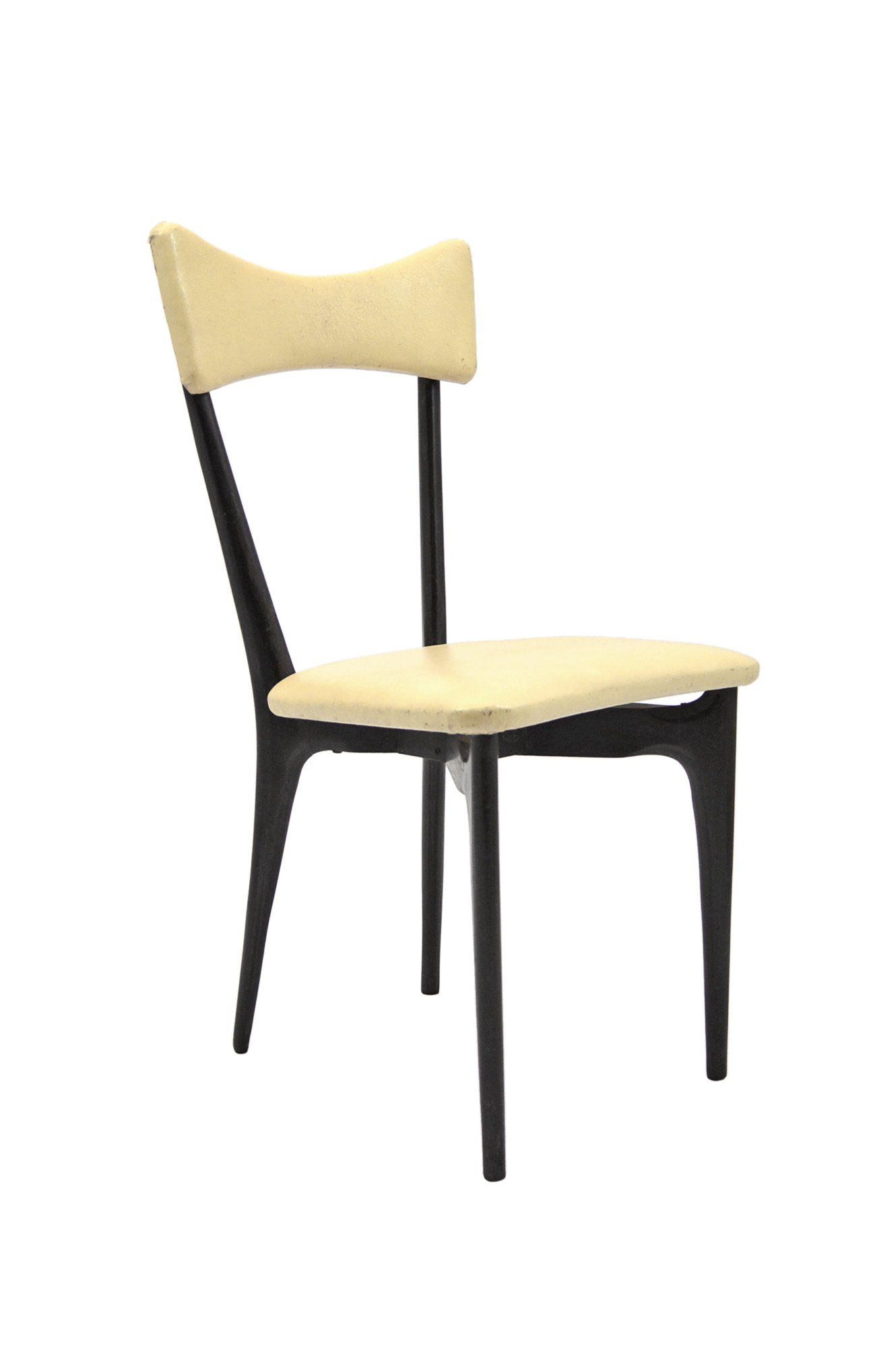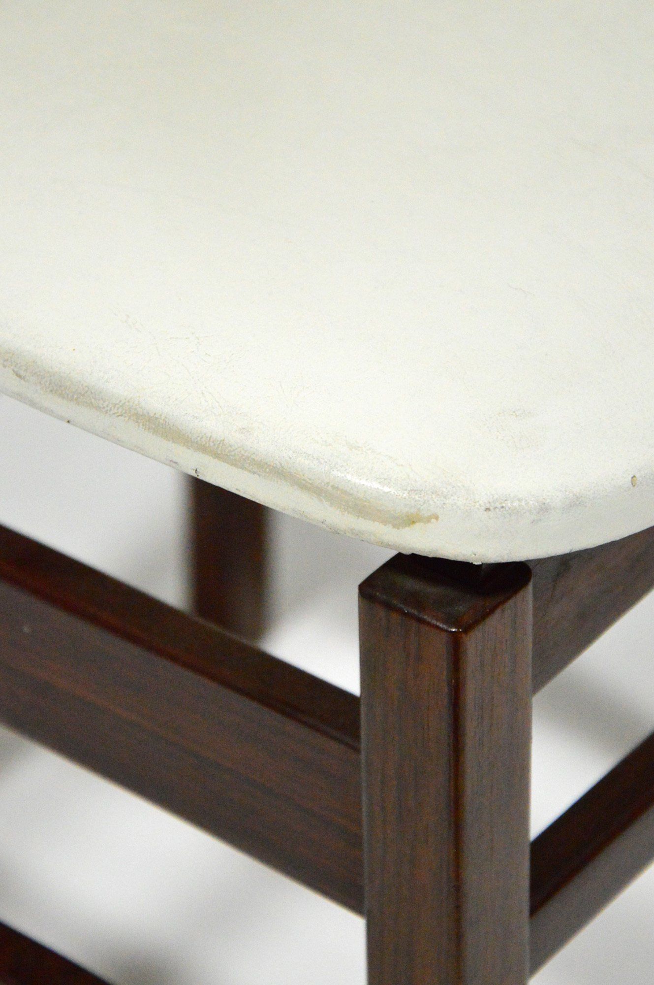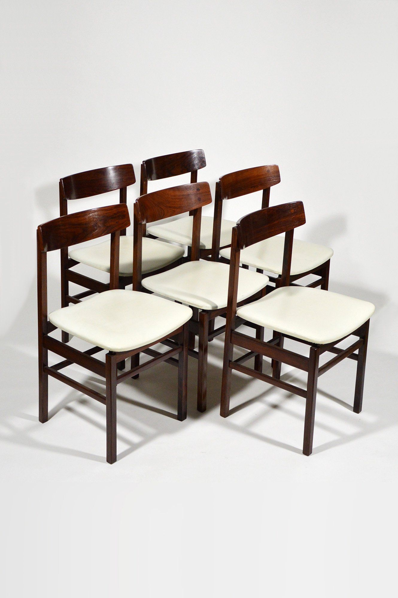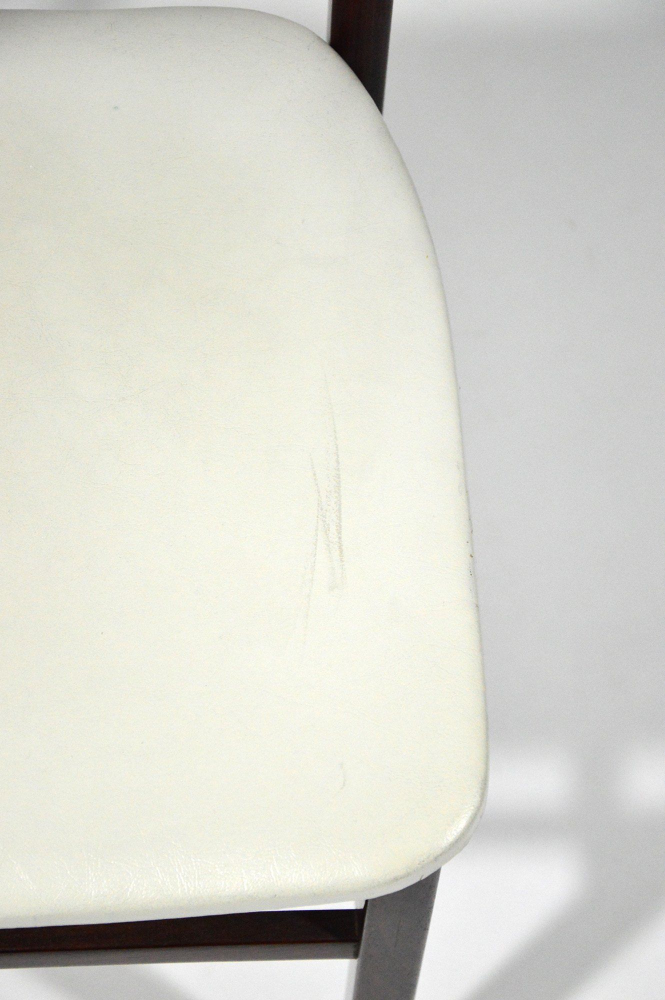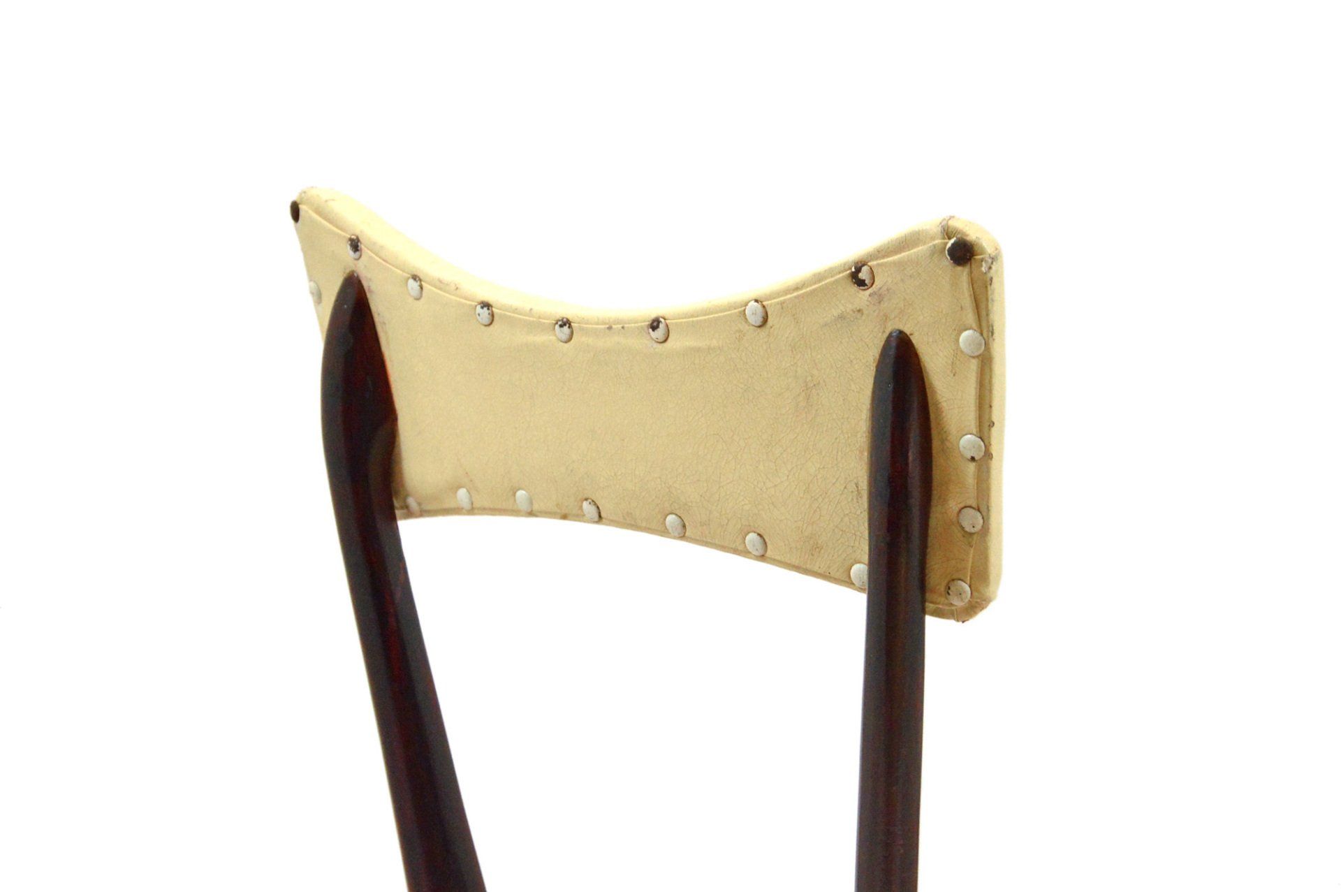 Set of 6 dining chairs in rosewood and ivory leatherette, probably made in italy in the 1960s, with essential and elegant lines, solid and sturdy. In very good original condition, the leatherette upholstery shows some normal signs of time, but the chairs are ready to use.