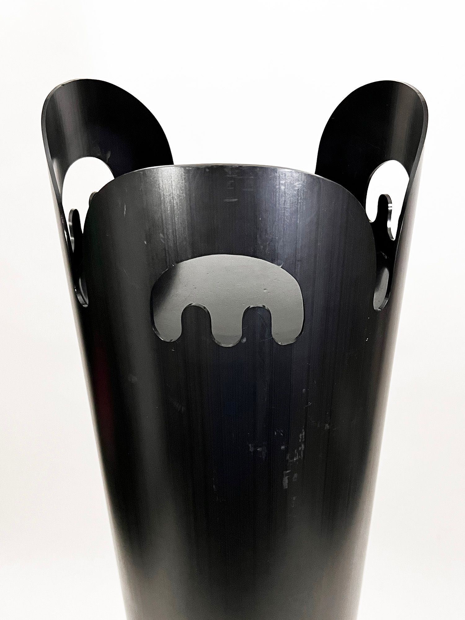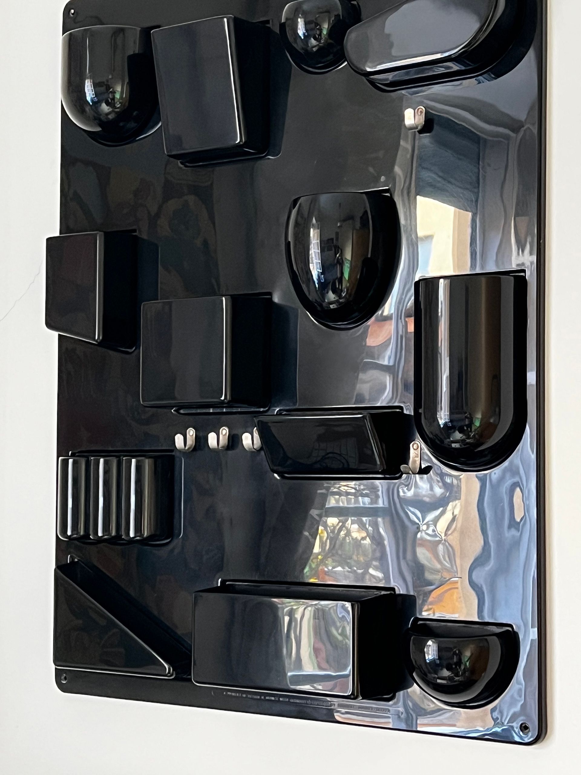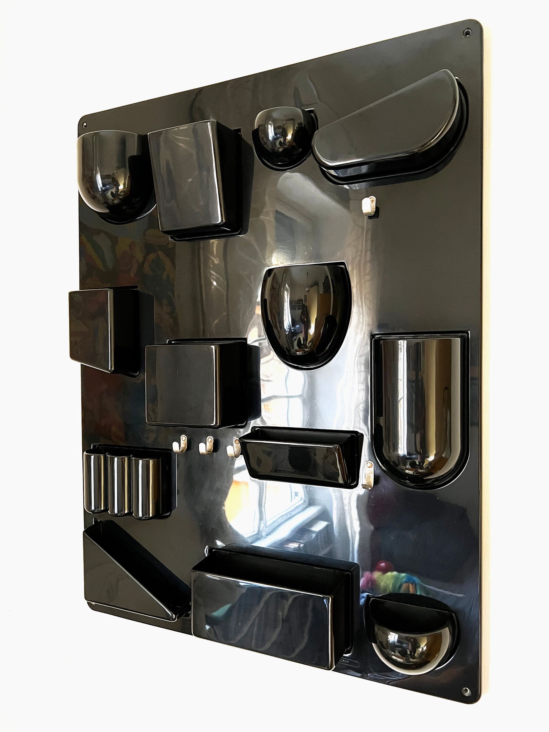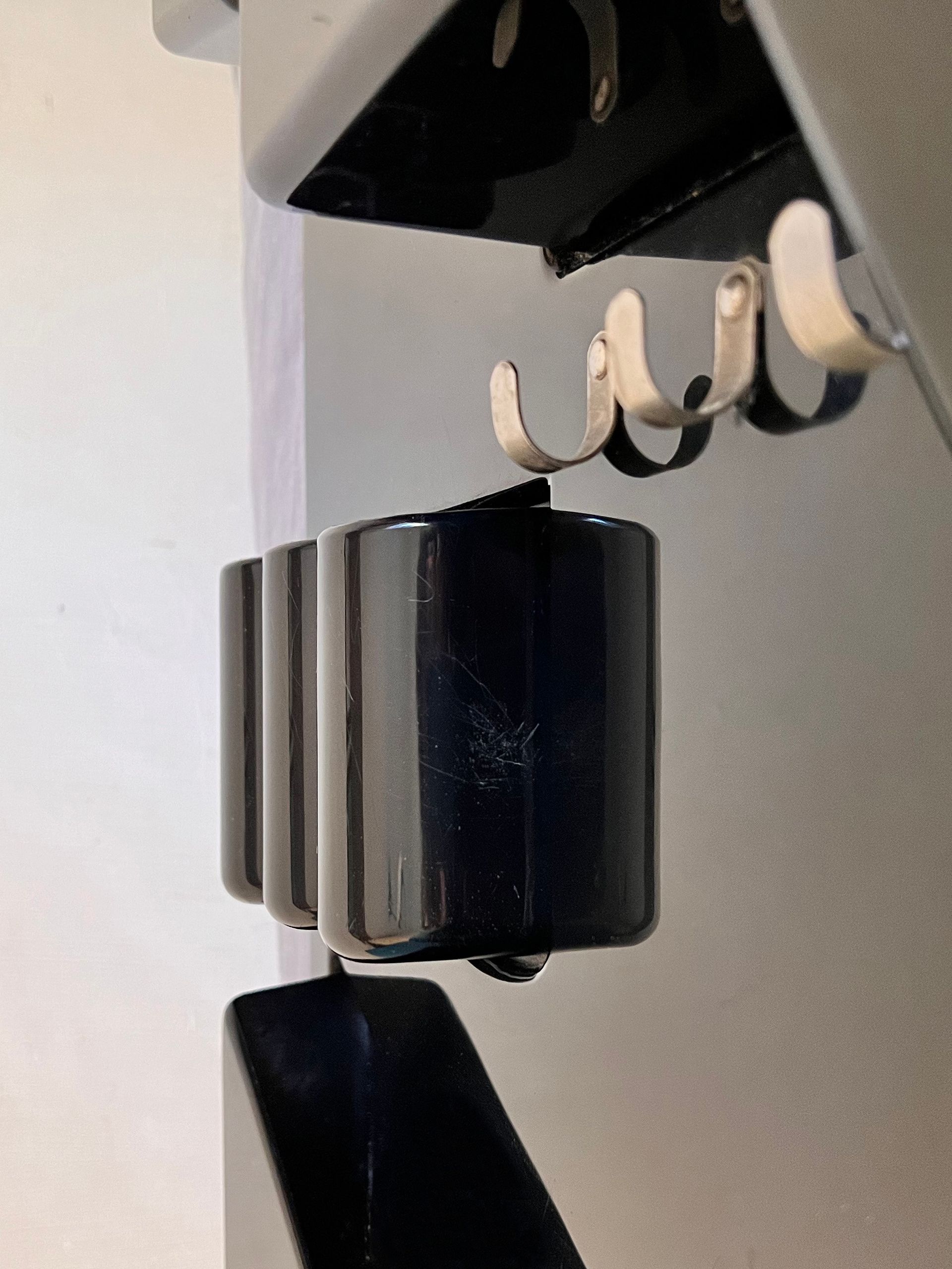 Uten.Silo is an object designed by Dorotee Becker and produced together with her husband Ingo Maurer by studio M. This object has become an innovative 1960s design icon both for a new vision of how to live in the home and the workplace, as well as for the overall approach to design from project to production carried out by the two designers. It was in fact with studio m that Ingo Maurer began his activity as a publisher. The item is in very good condition apart from a couple of scratches on the top edge and a few marks on the pen holder element. In the photos the marks look more substantial than they are in reality. The insides of the pockets are dulled.