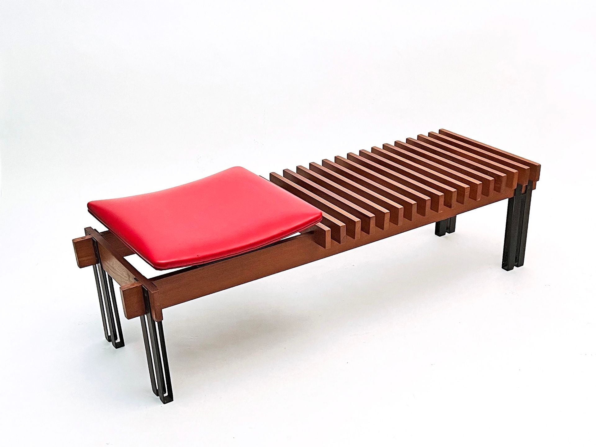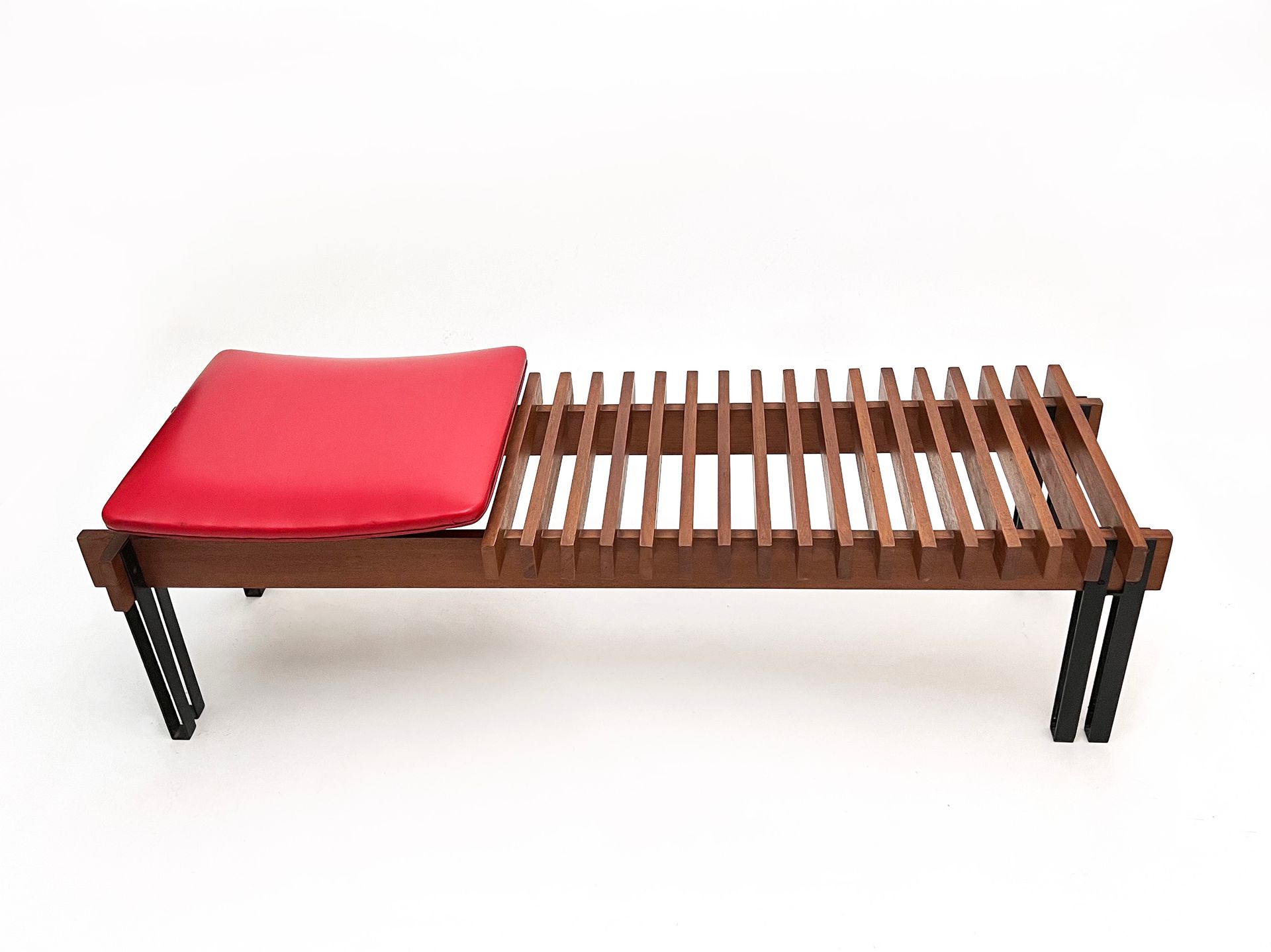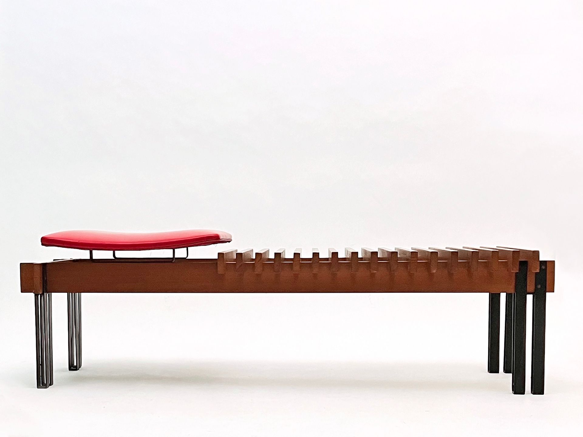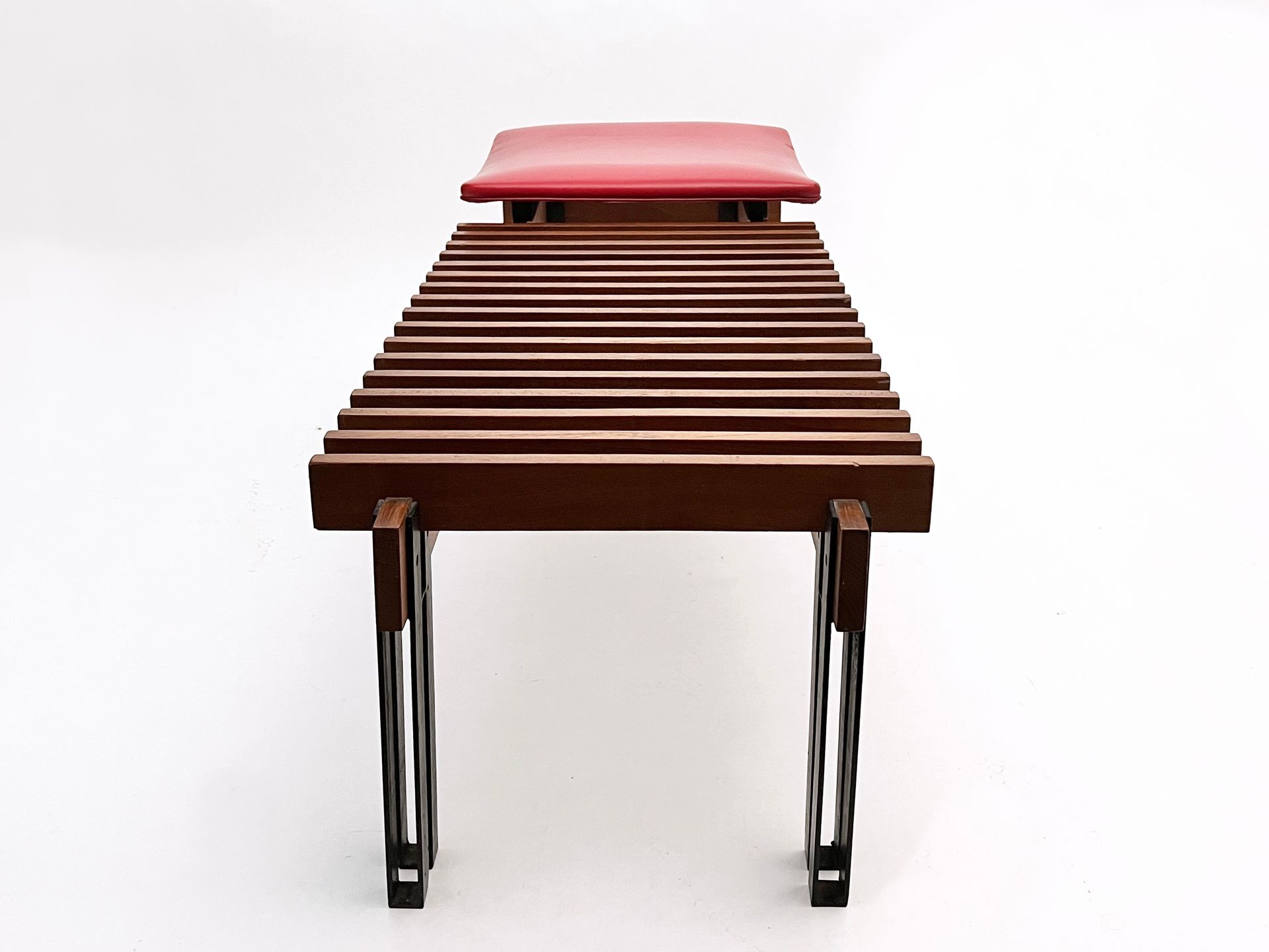 The bench consists of a teak and black painted steel frame to which a red upholstered skai seat is attached. The design is clean and the details are studied to be functional and essential but at the same time decoratively characterising.