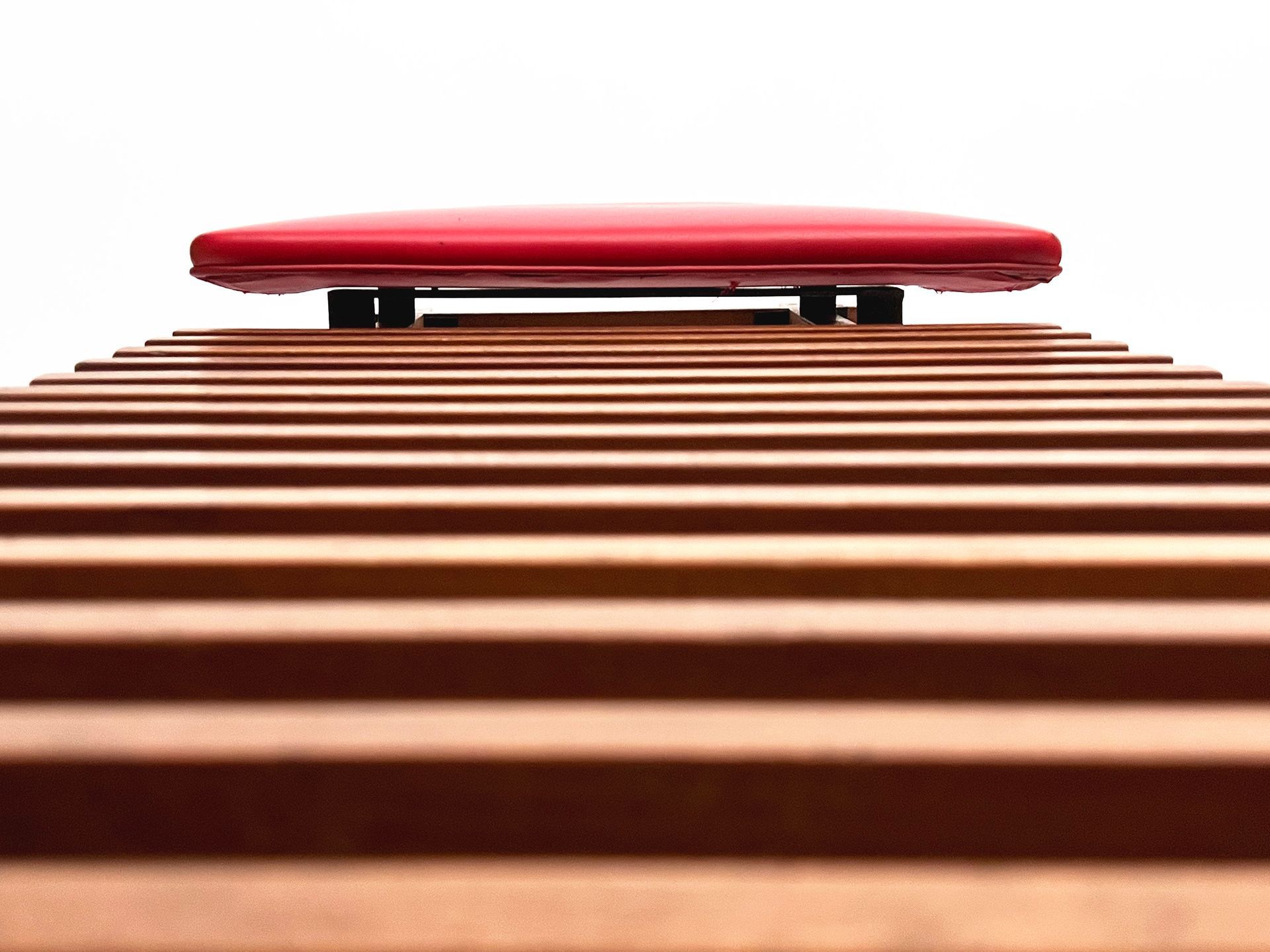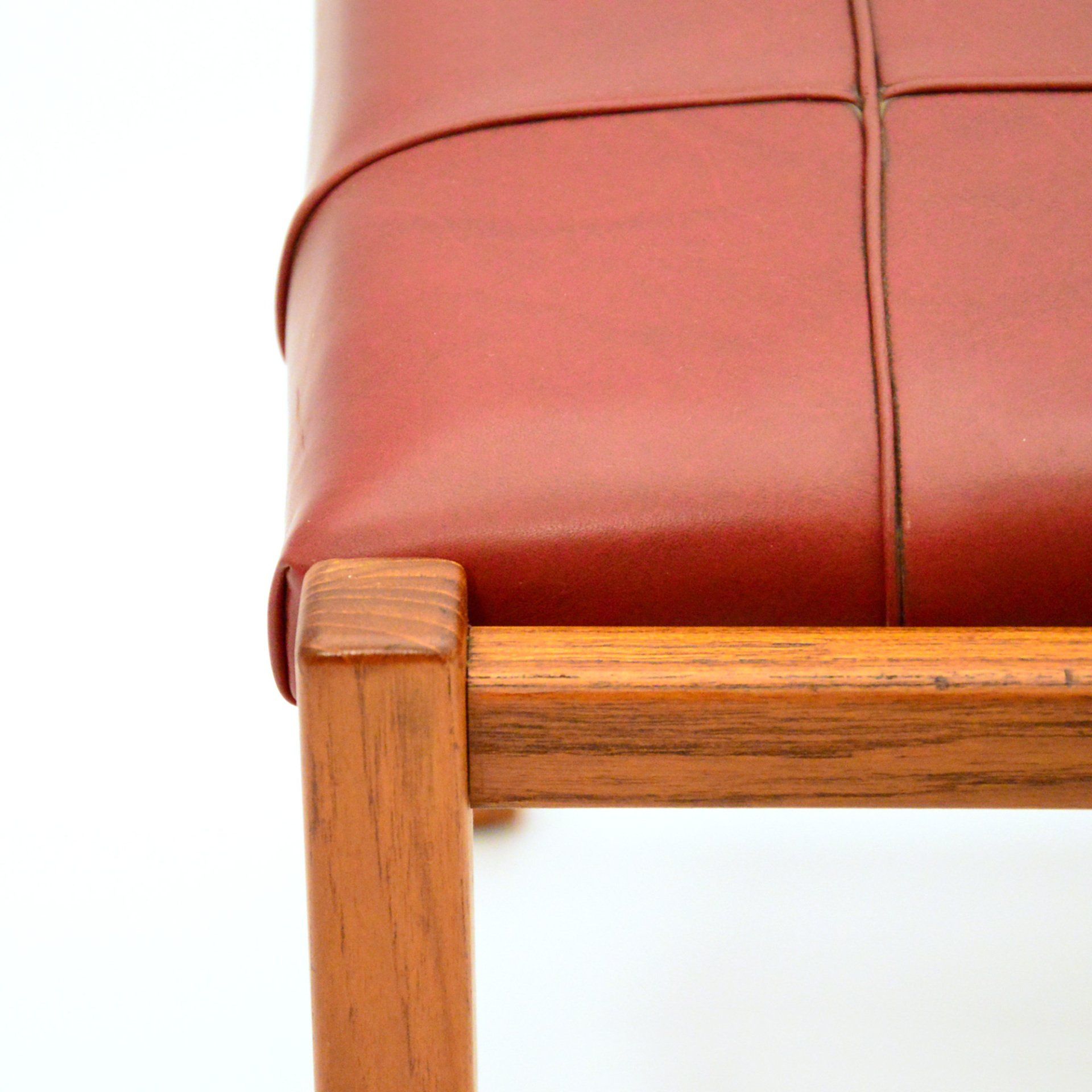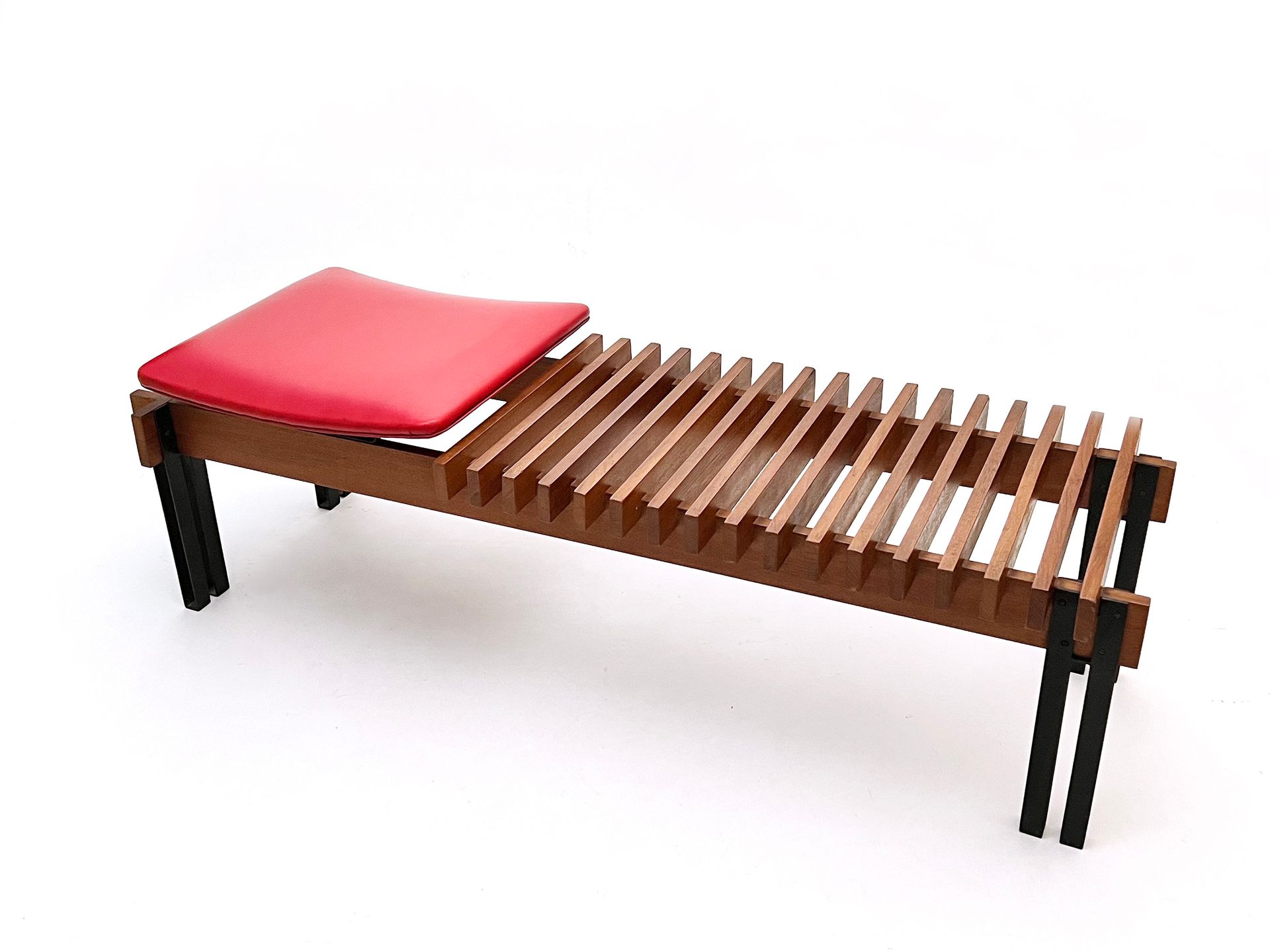 The bench consists of a teak and black painted steel frame to which a red upholstered skai seat is attached. The design is clean and the details are studied to be functional and essential but at the same time decoratively characterising.