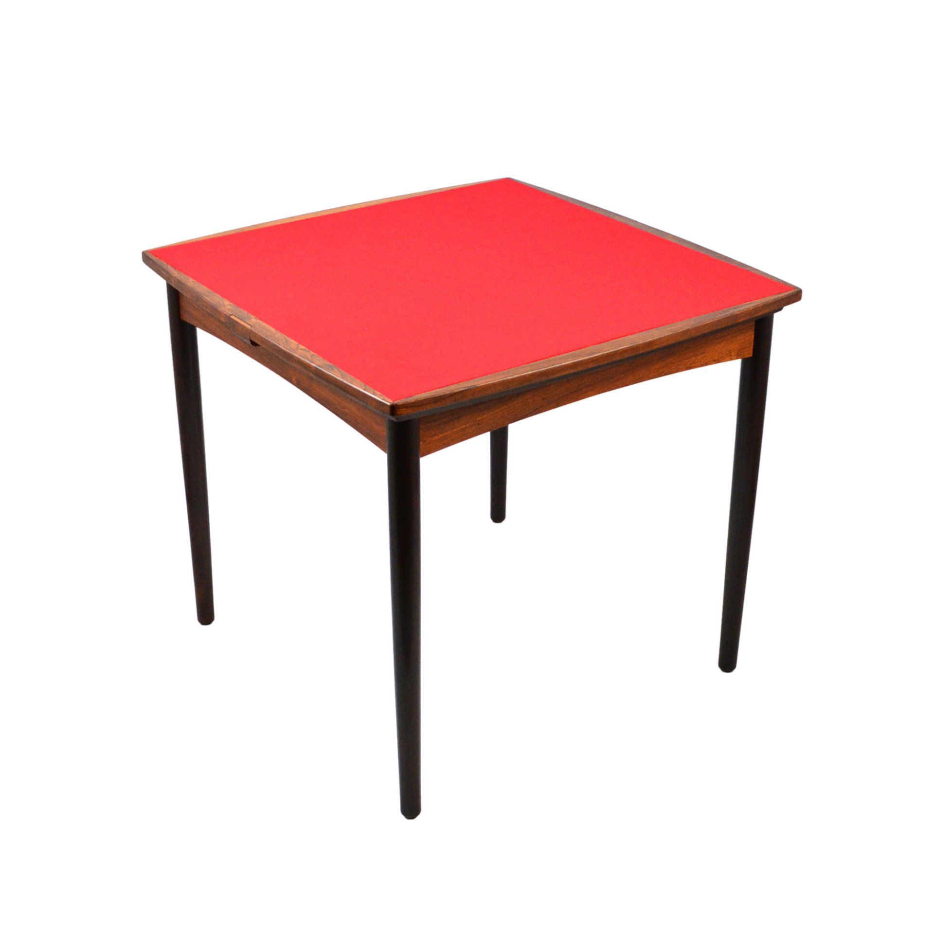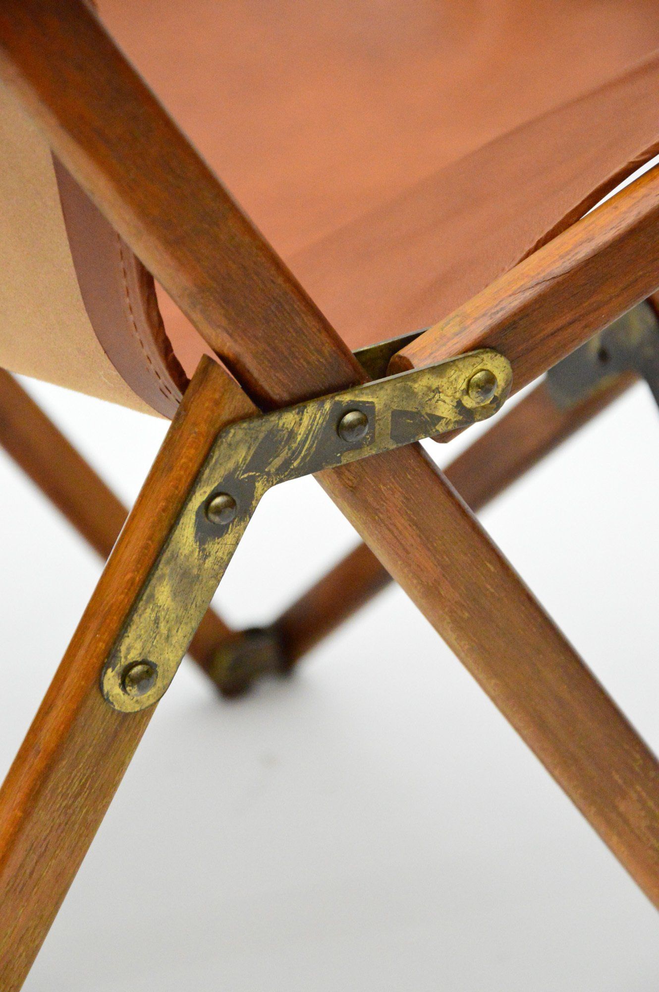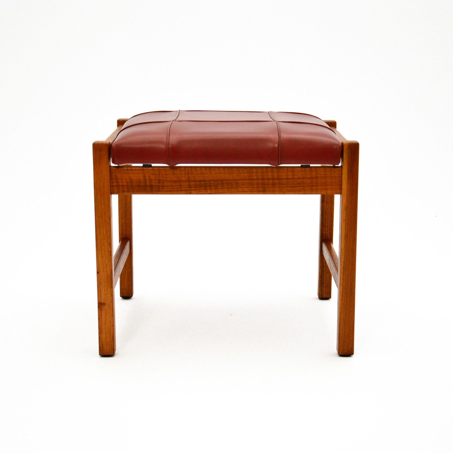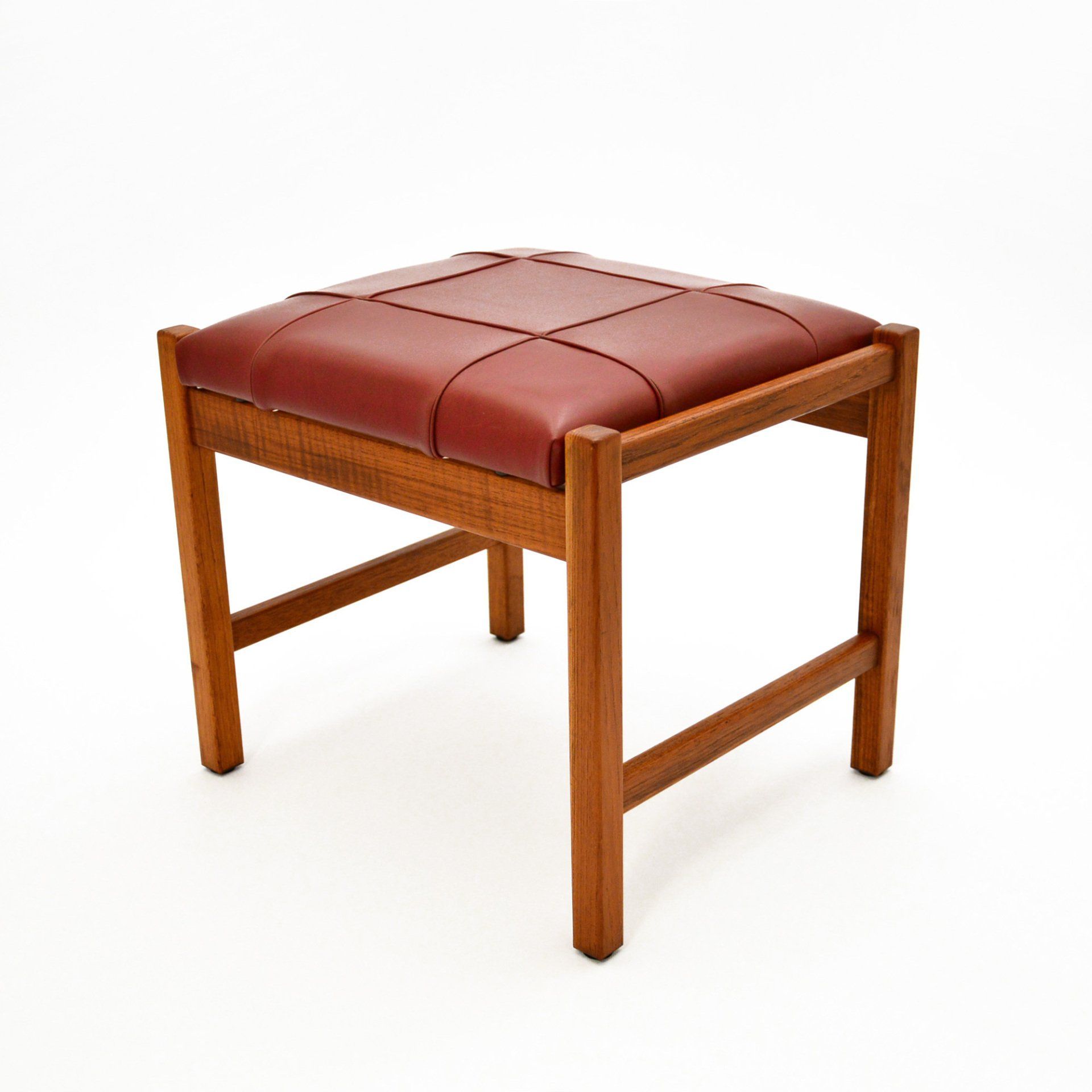 The bench consists of a teak and black painted steel frame to which a red upholstered skai seat is attached. The design is clean and the details are studied to be functional and essential but at the same time decoratively characterising.