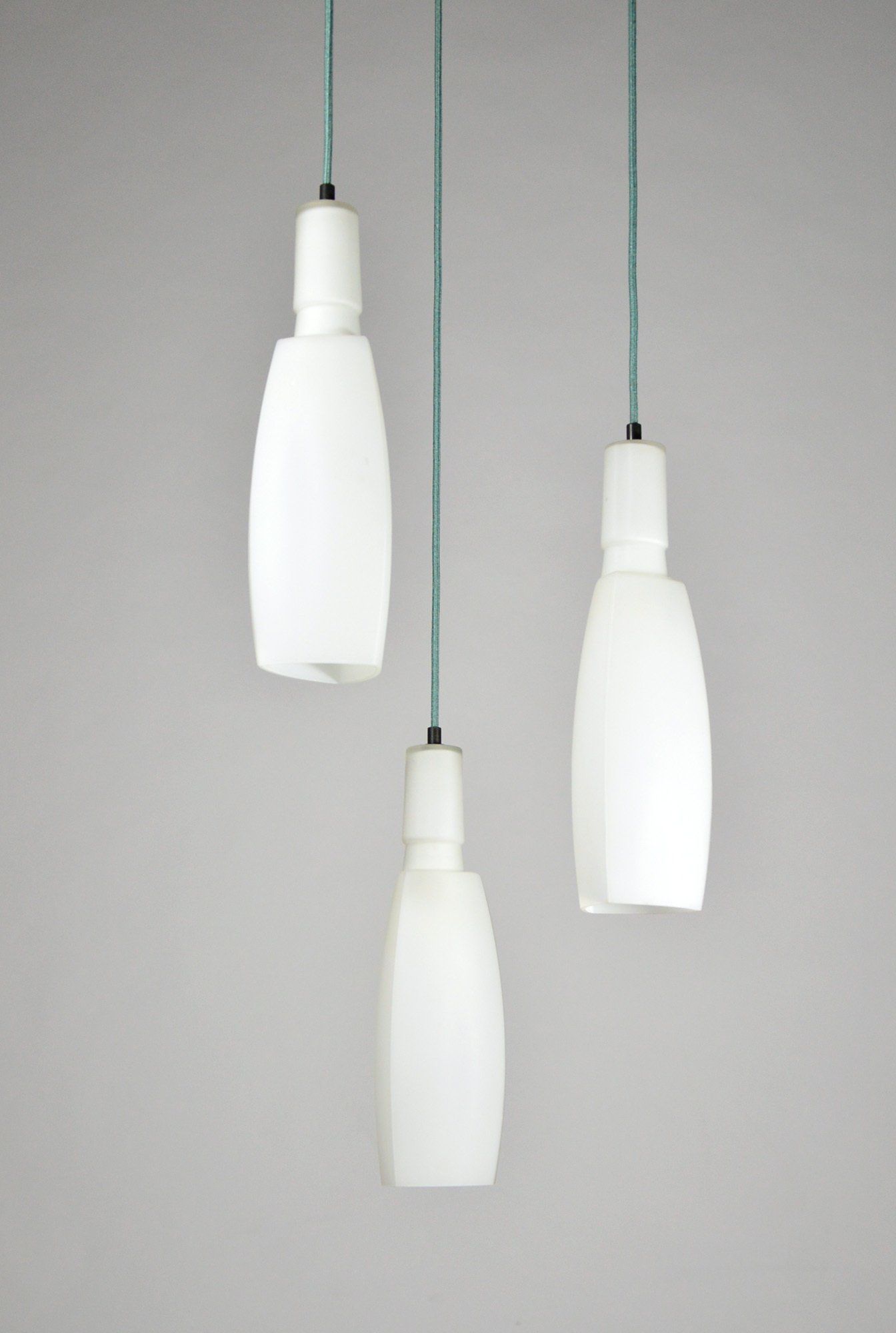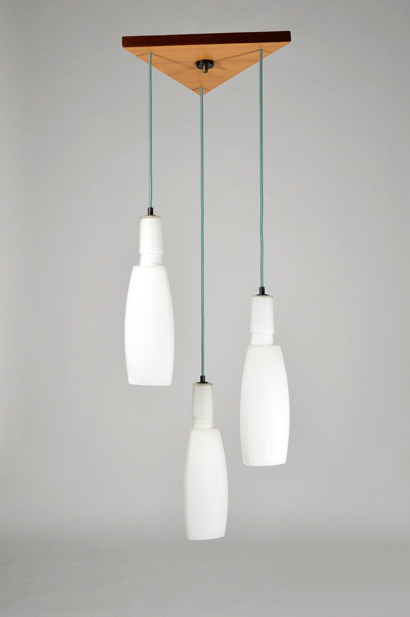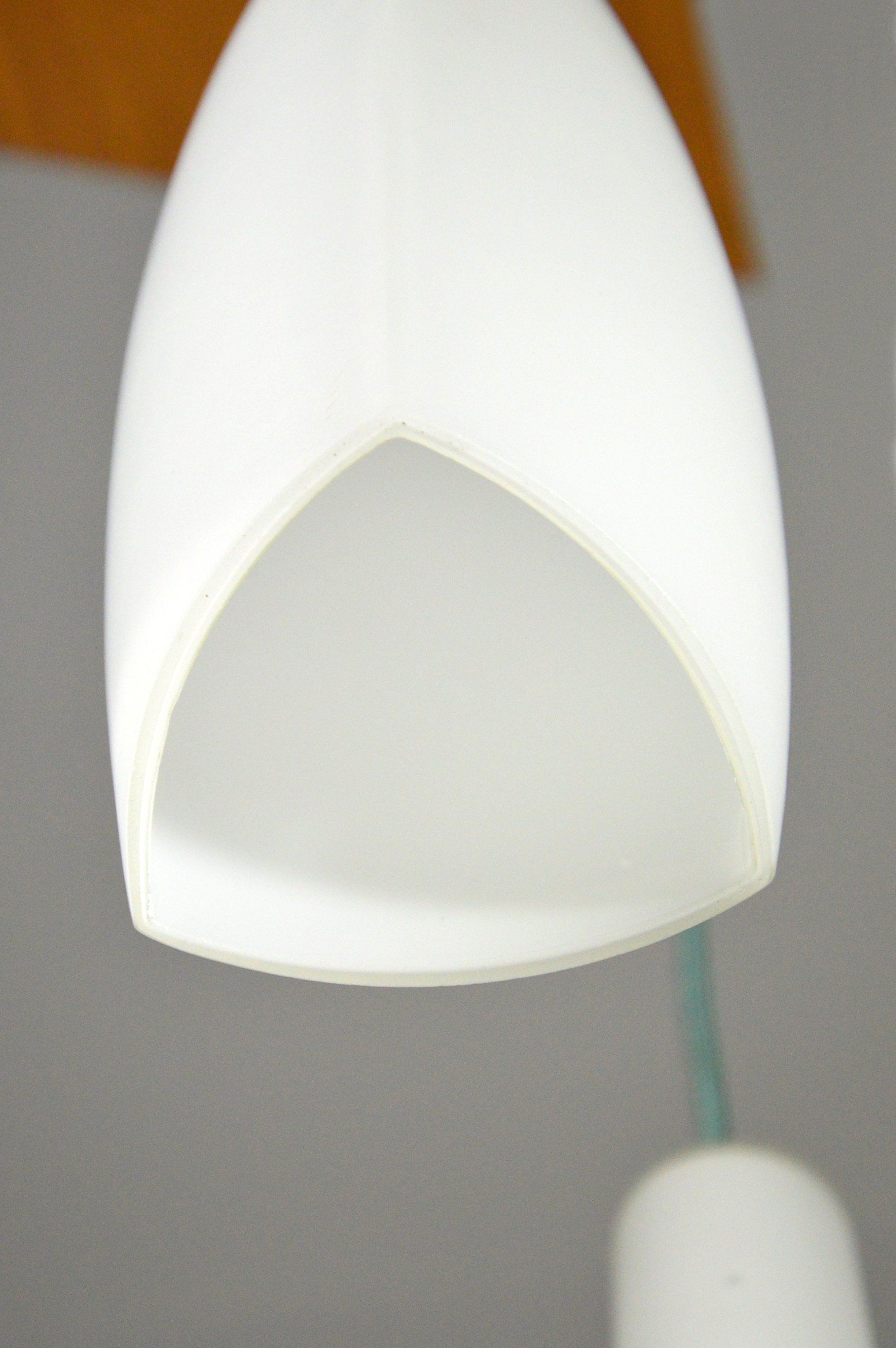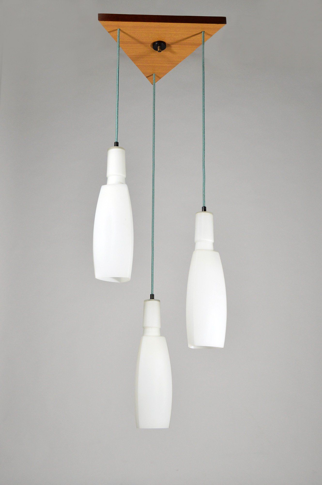 Ceiling lamp with three triangular section white satin glass pendants.