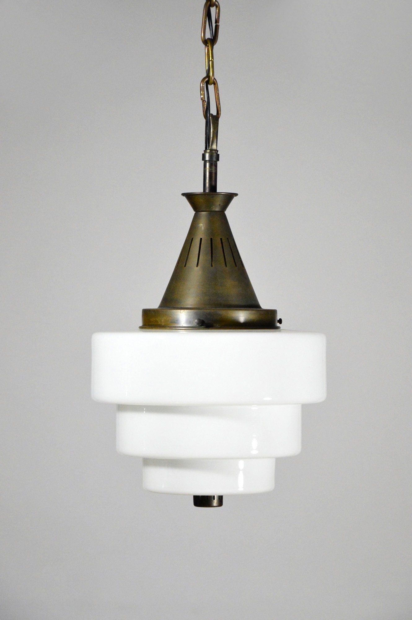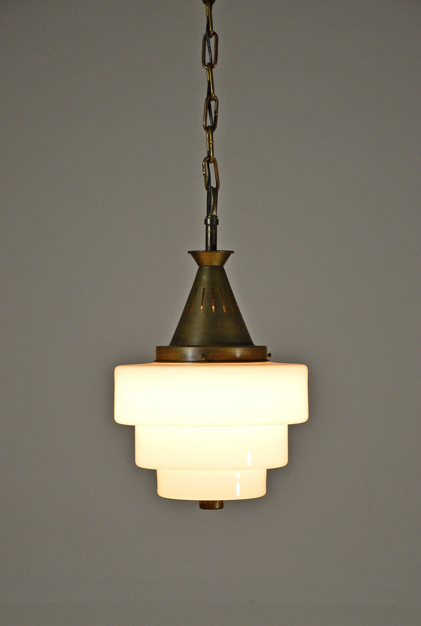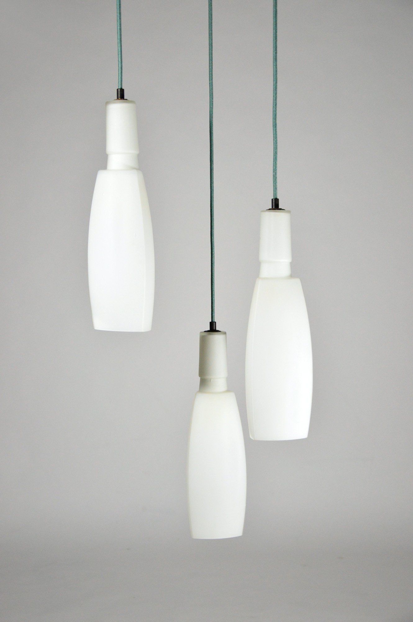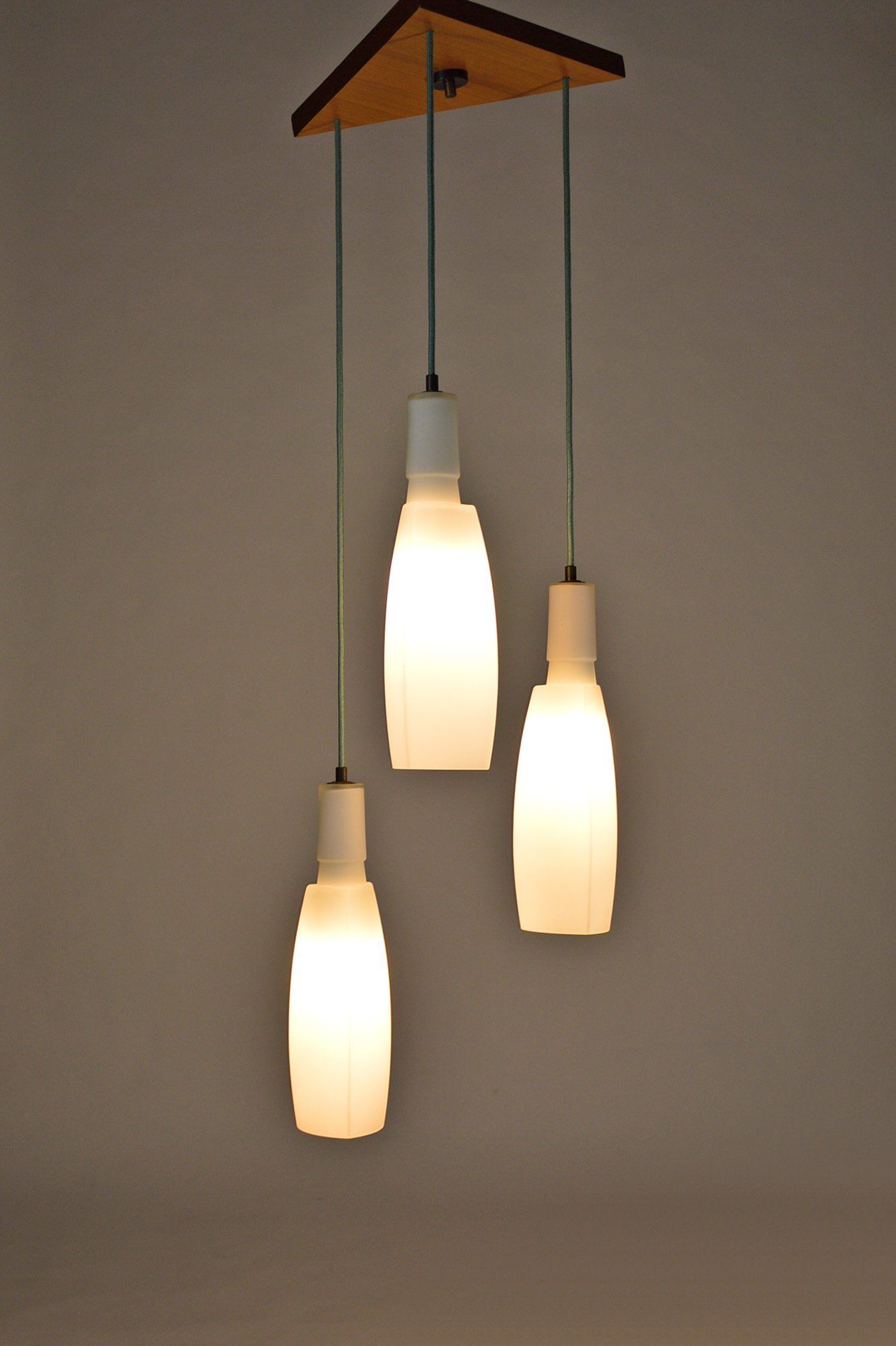 Ceiling lamp with three triangular section white satin glass pendants.