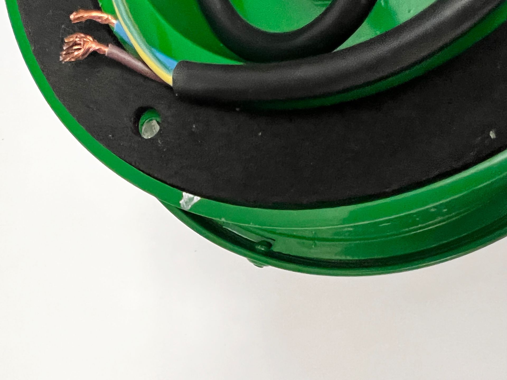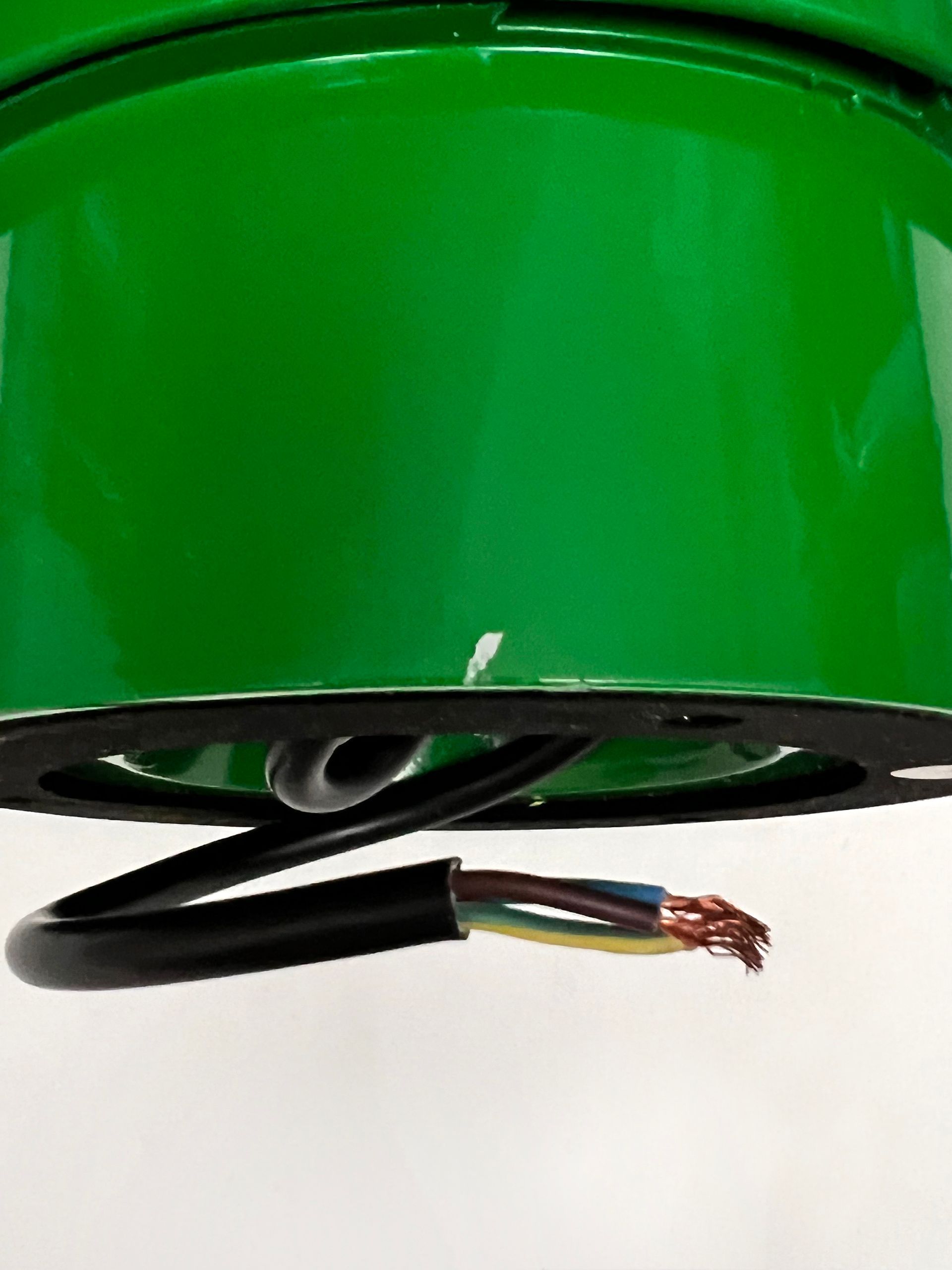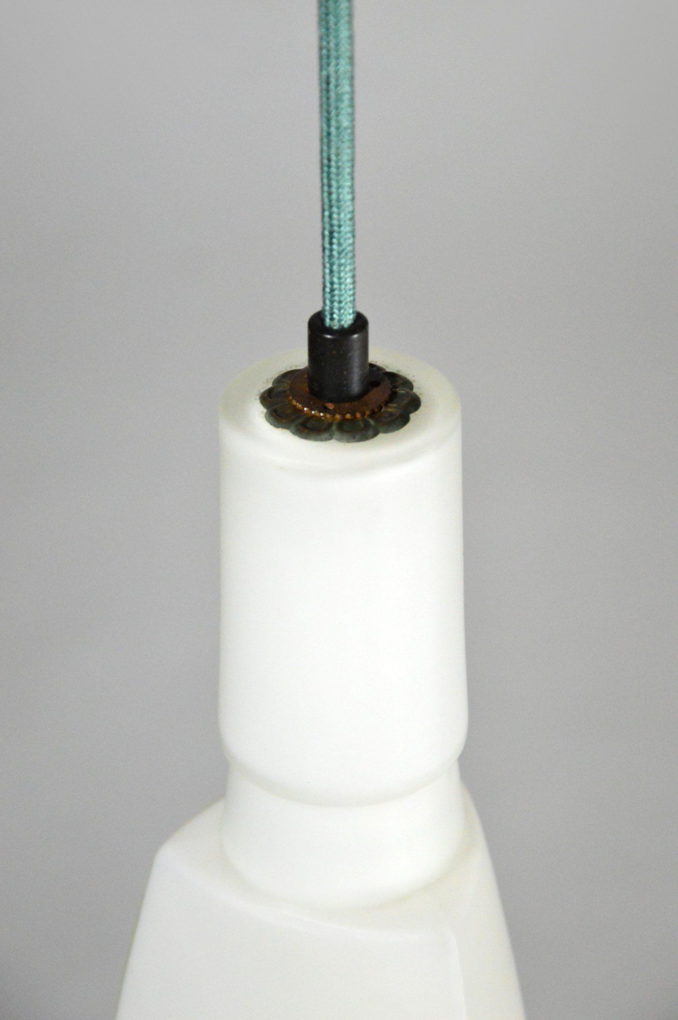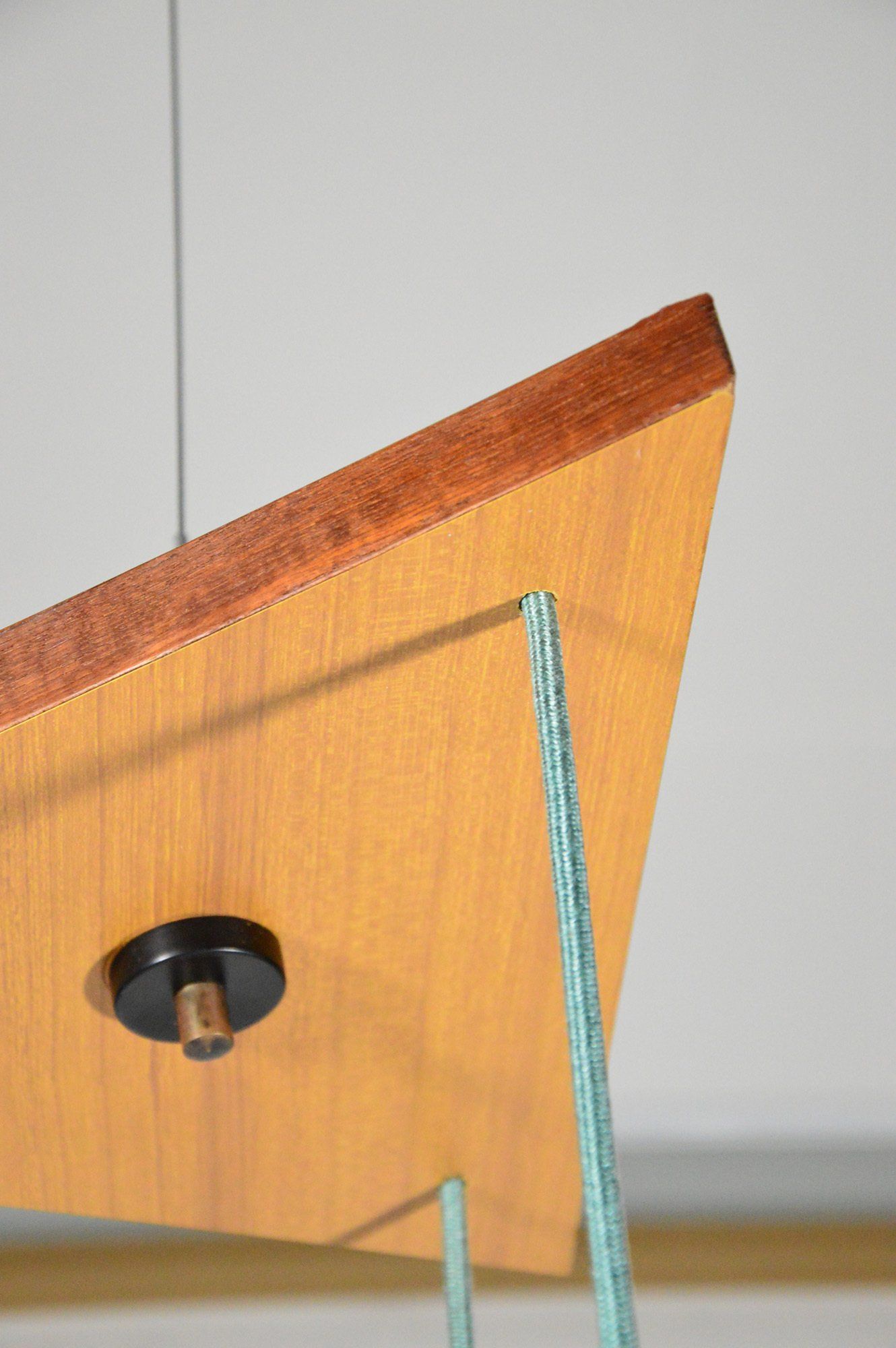 Triangular plaque for attachment to the ceiling in wood and plastic laminate, new electric cables in aqua green fabric.