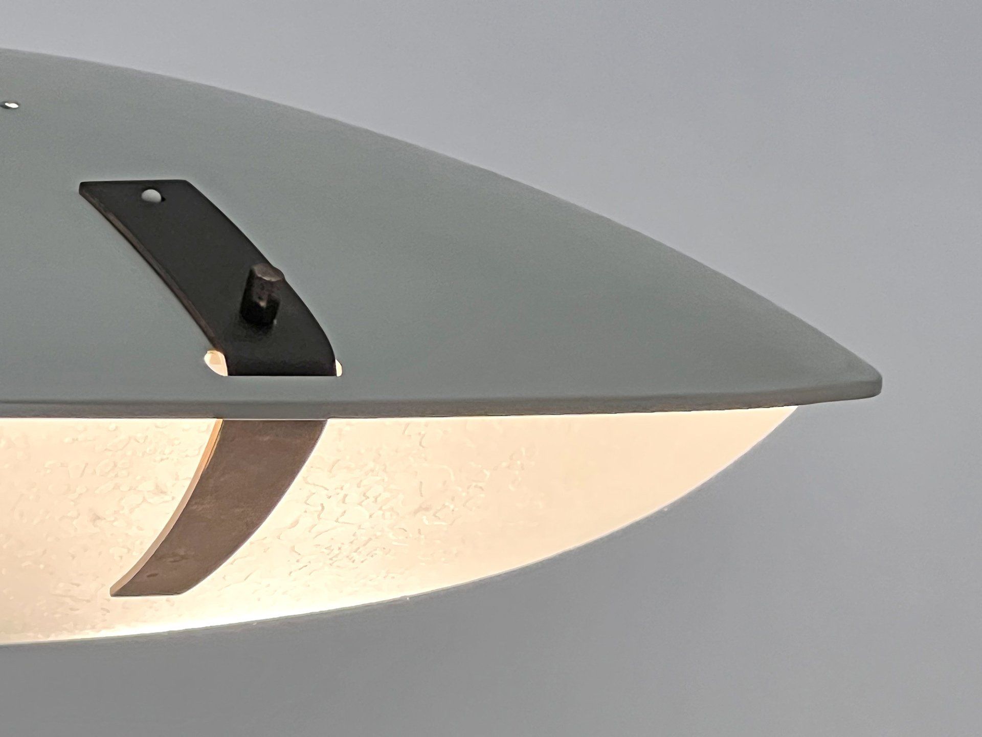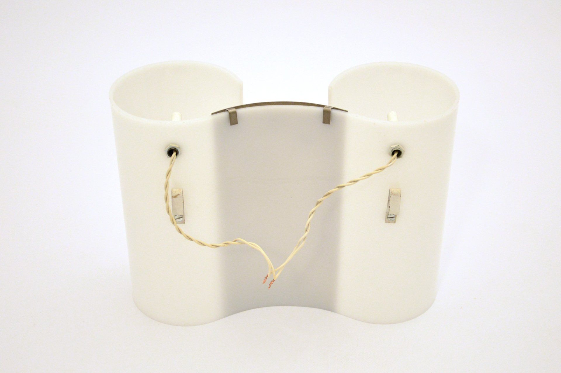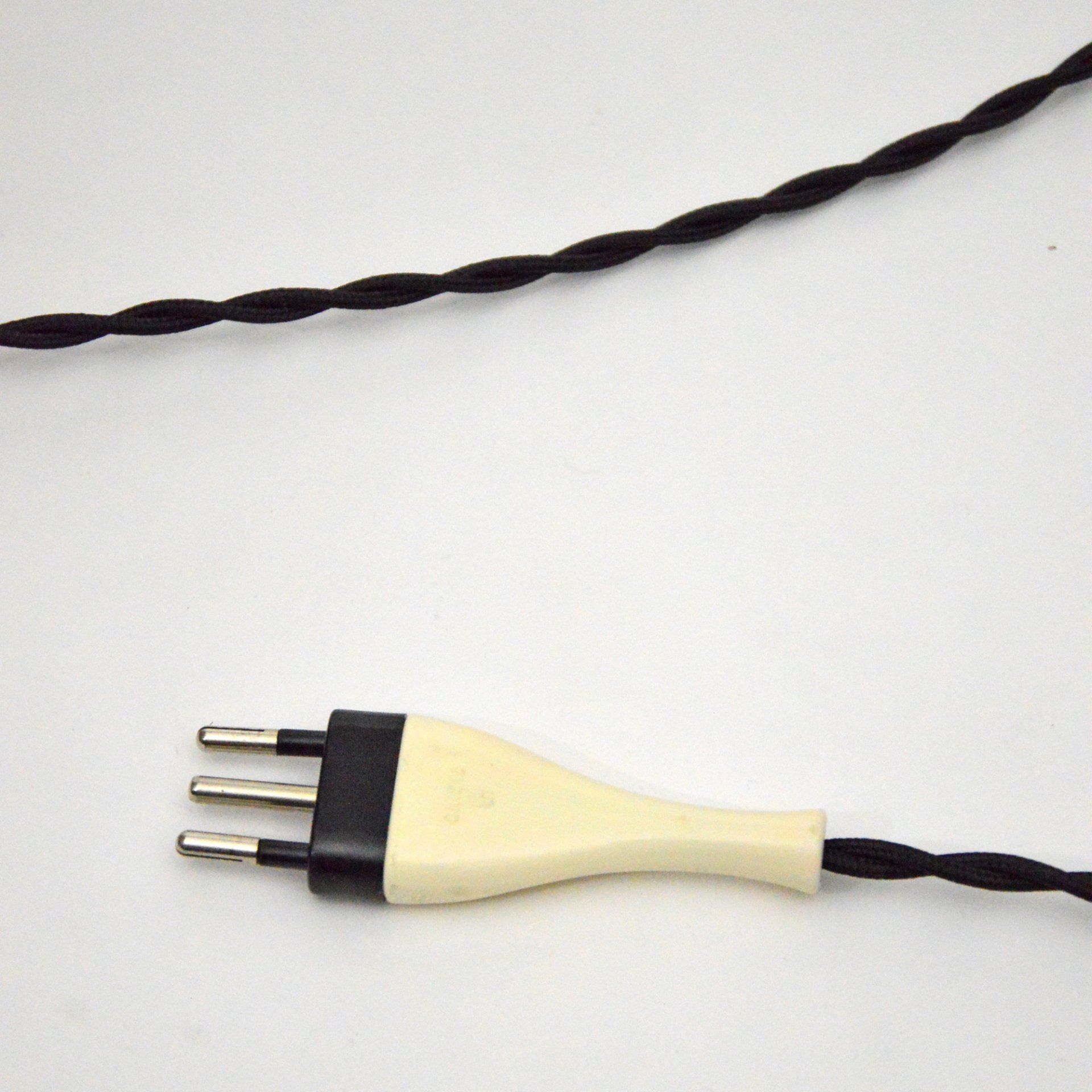 Triangular plaque for attachment to the ceiling in wood and plastic laminate, new electric cables in aqua green fabric.