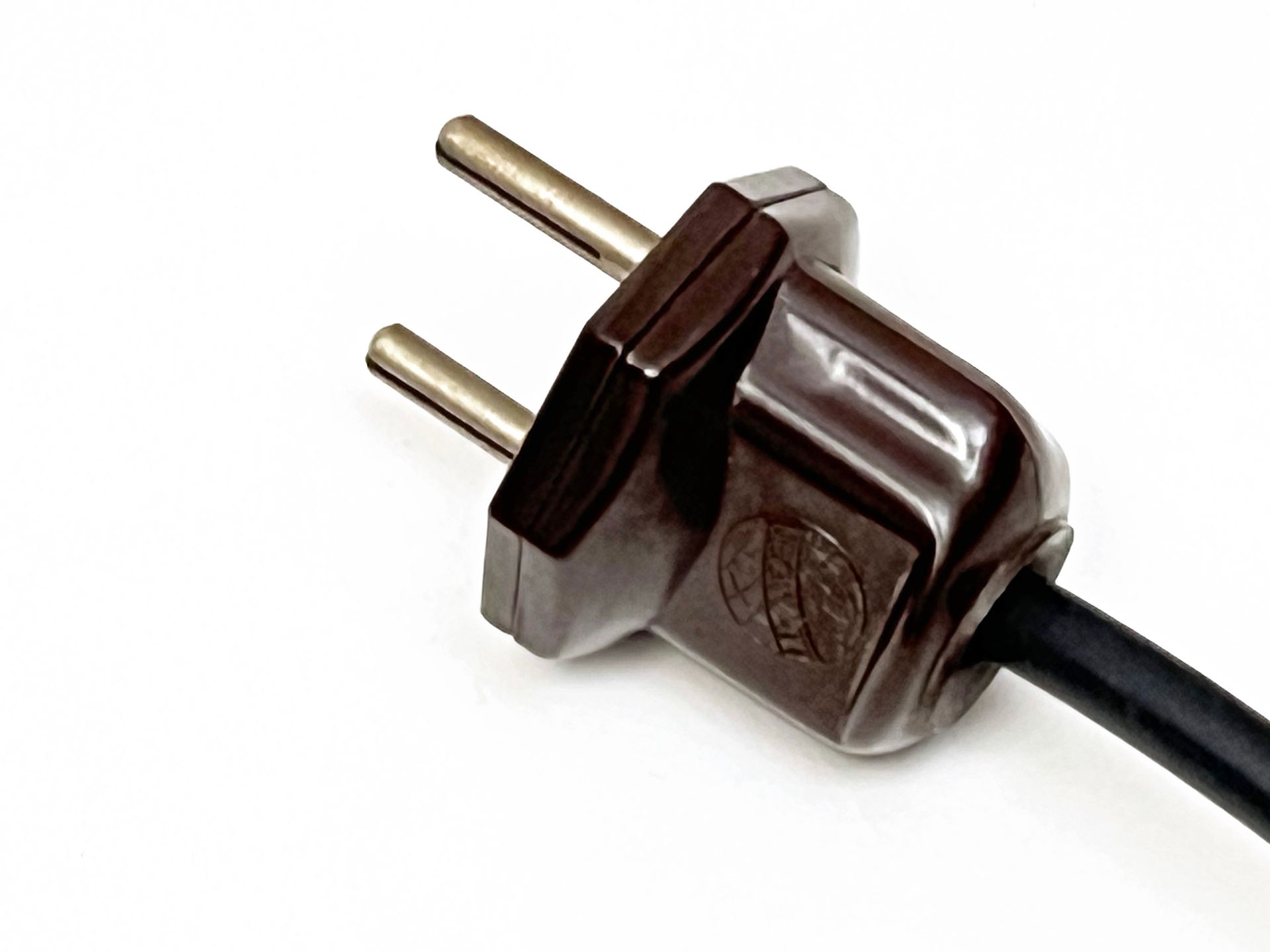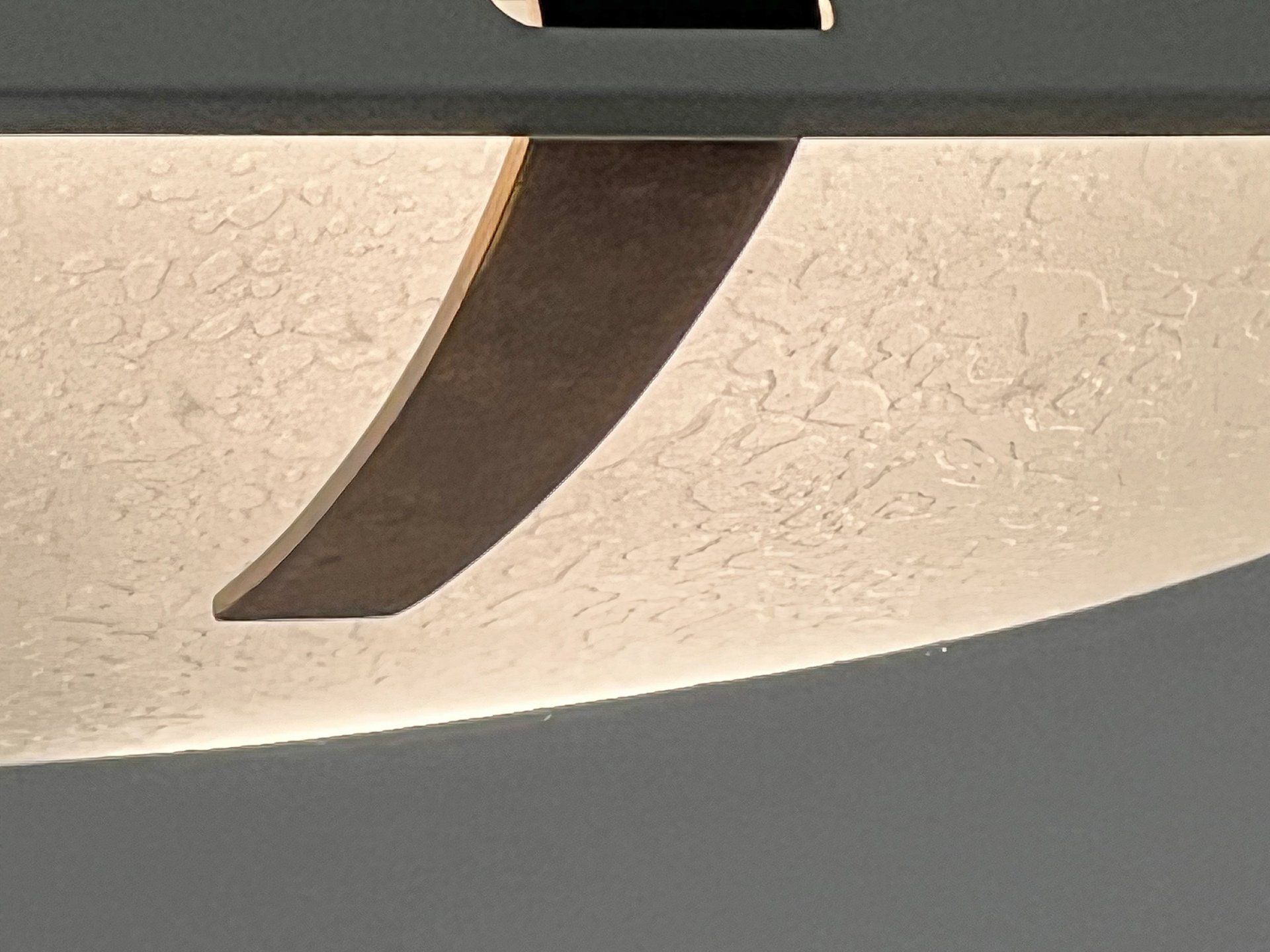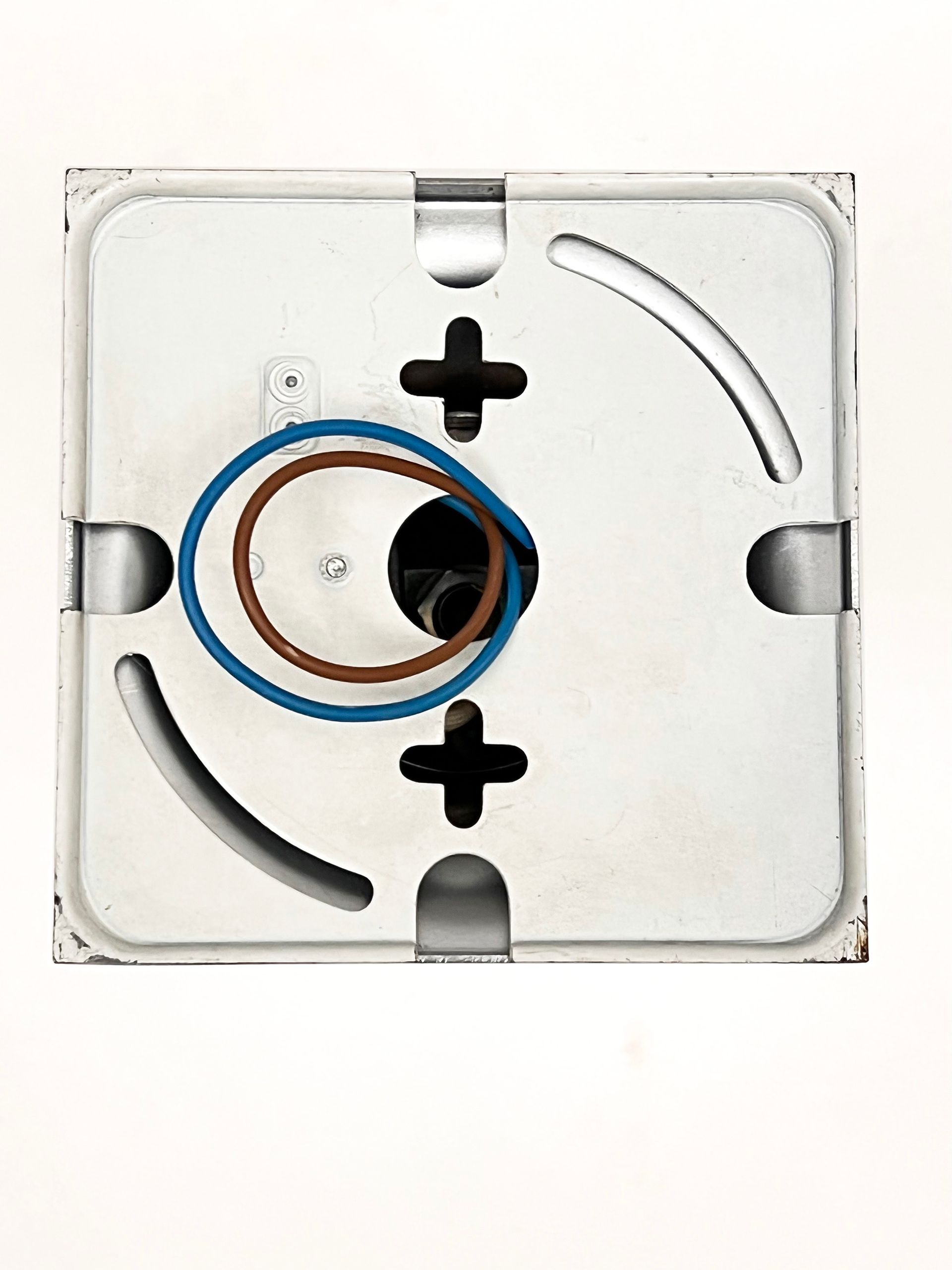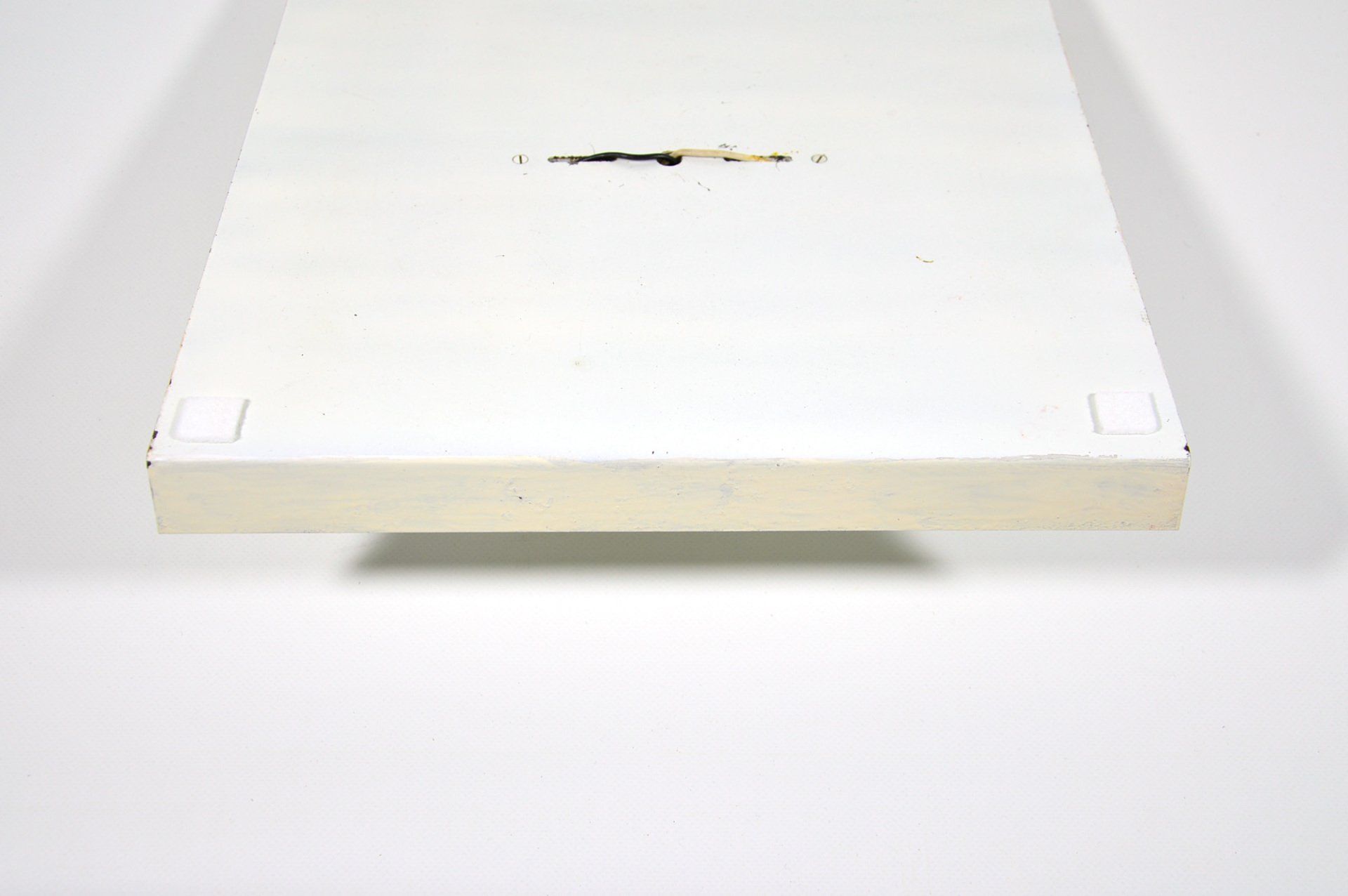 Triangular plaque for attachment to the ceiling in wood and plastic laminate, new electric cables in aqua green fabric.