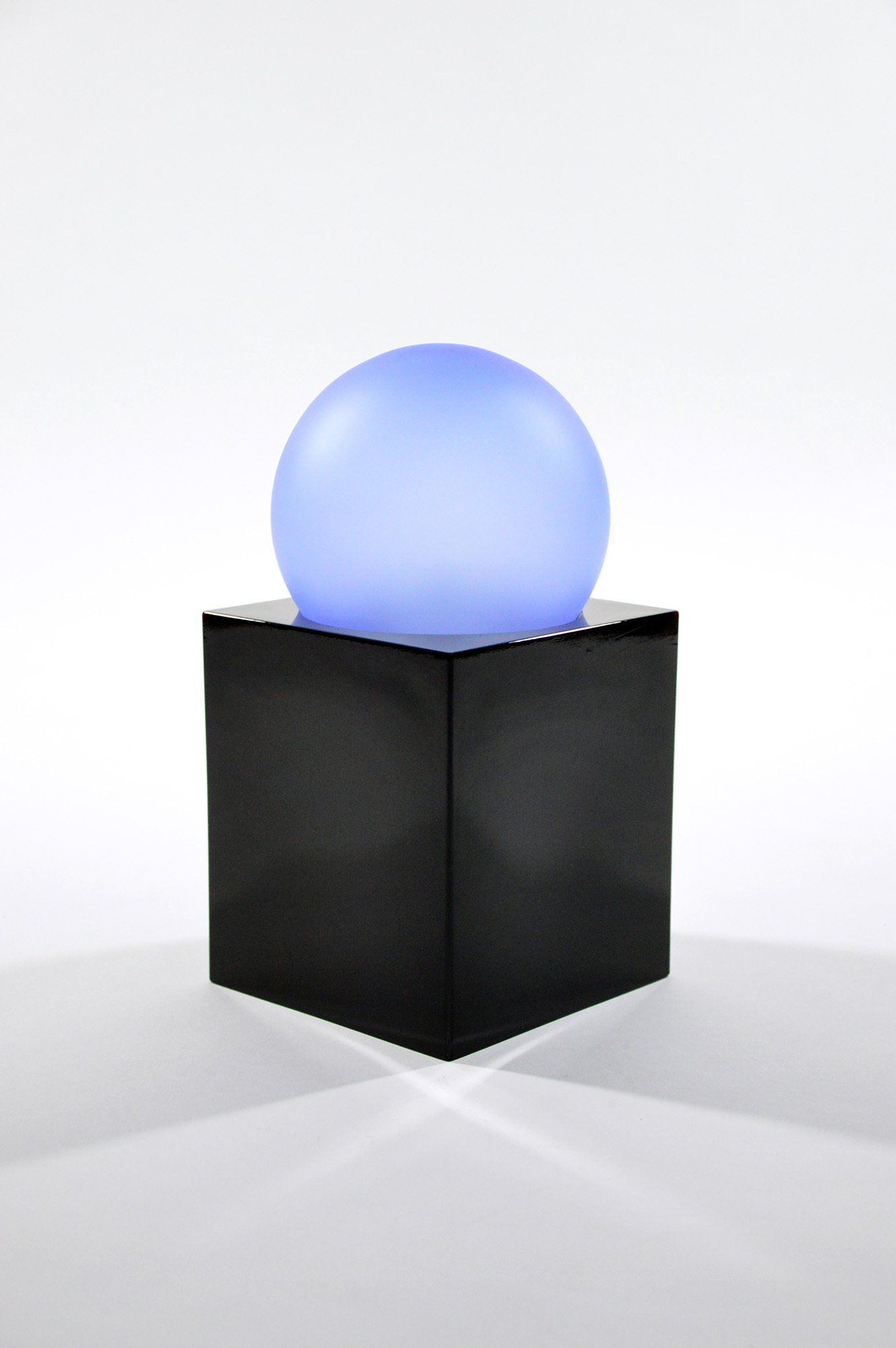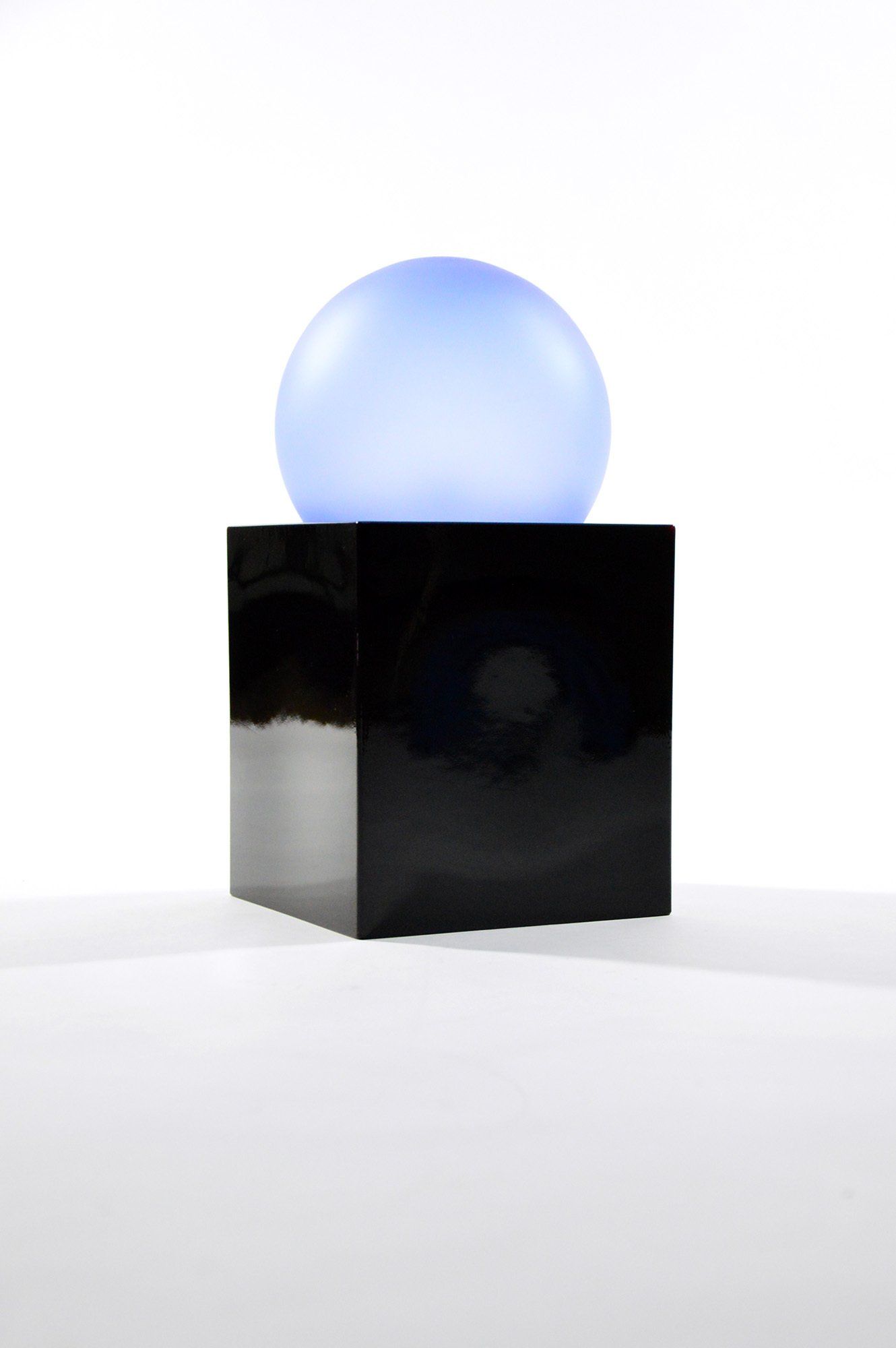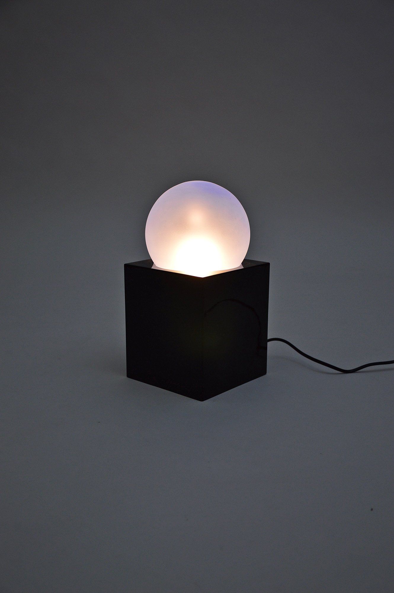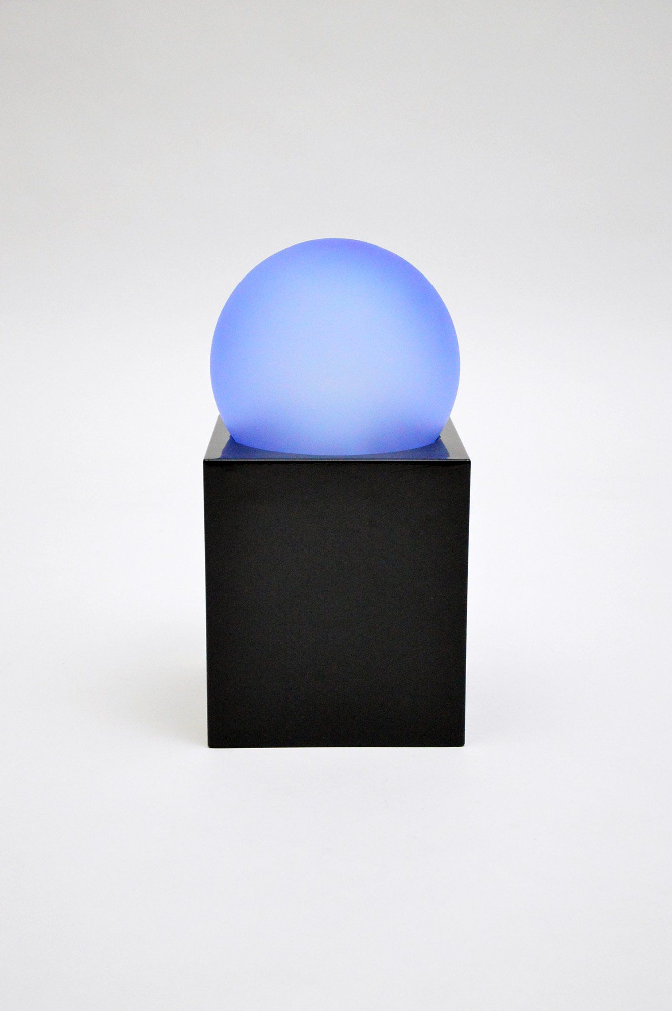 The ’Alba’ lamp was designed by Ettore Sottsass for the enel electricity company. It is made entirely of glass, but while the base is in polished glass, the blue sphere is in satin-finished glass. The same collection includes the ’Sciuko’ lamp by Achille Castiglioni and the ’Aria’ lamp by Michele De Lucchi. The lamp is in perfect condition and shows no signs of wear. Under the base there is a label with the name of the designer, the year of production and the manufacturing company. - cm H32 x W16 x D16