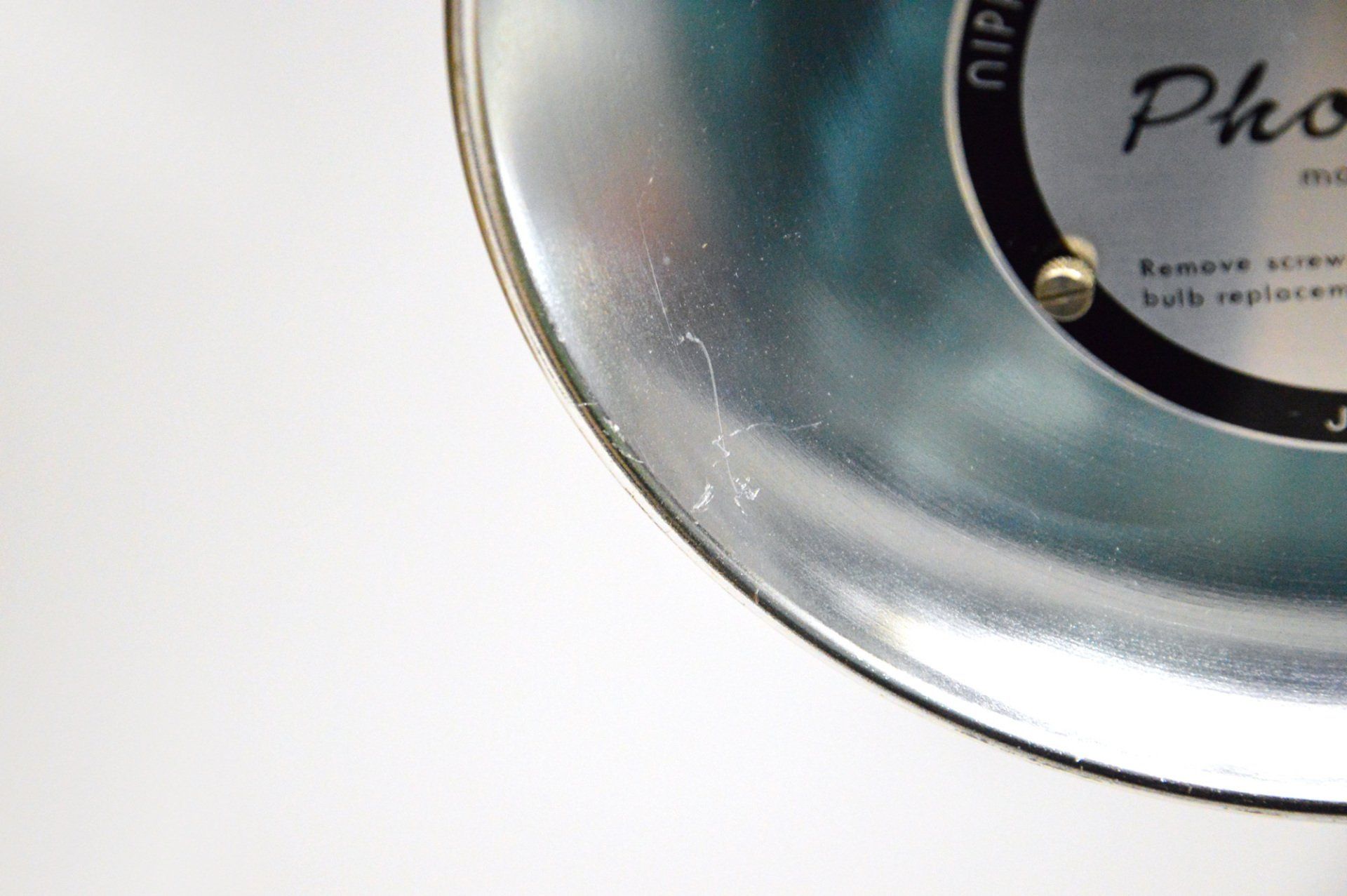 In very good condition, there is a scratch on the top of the lamp shade, highlighted in the photo.