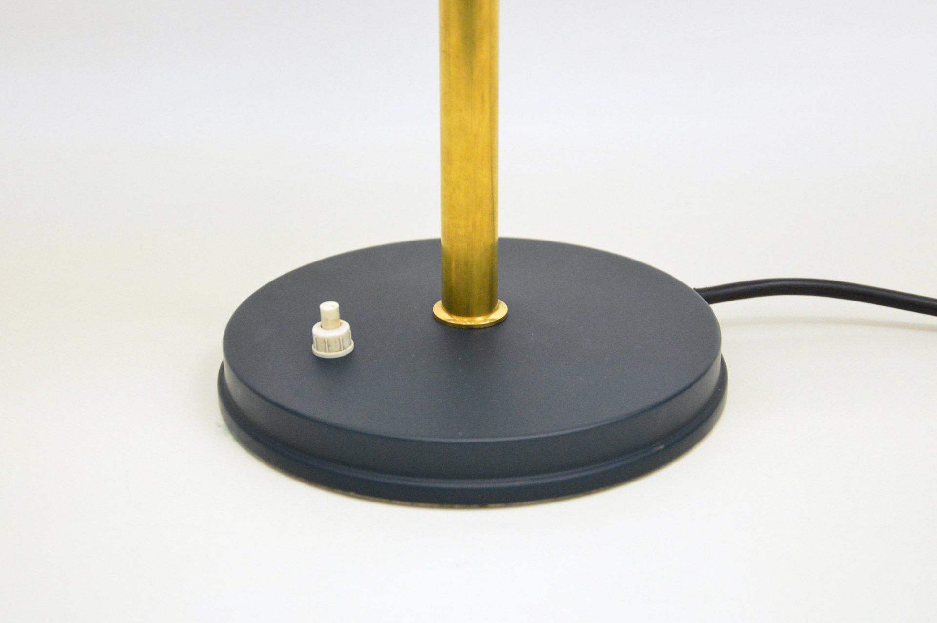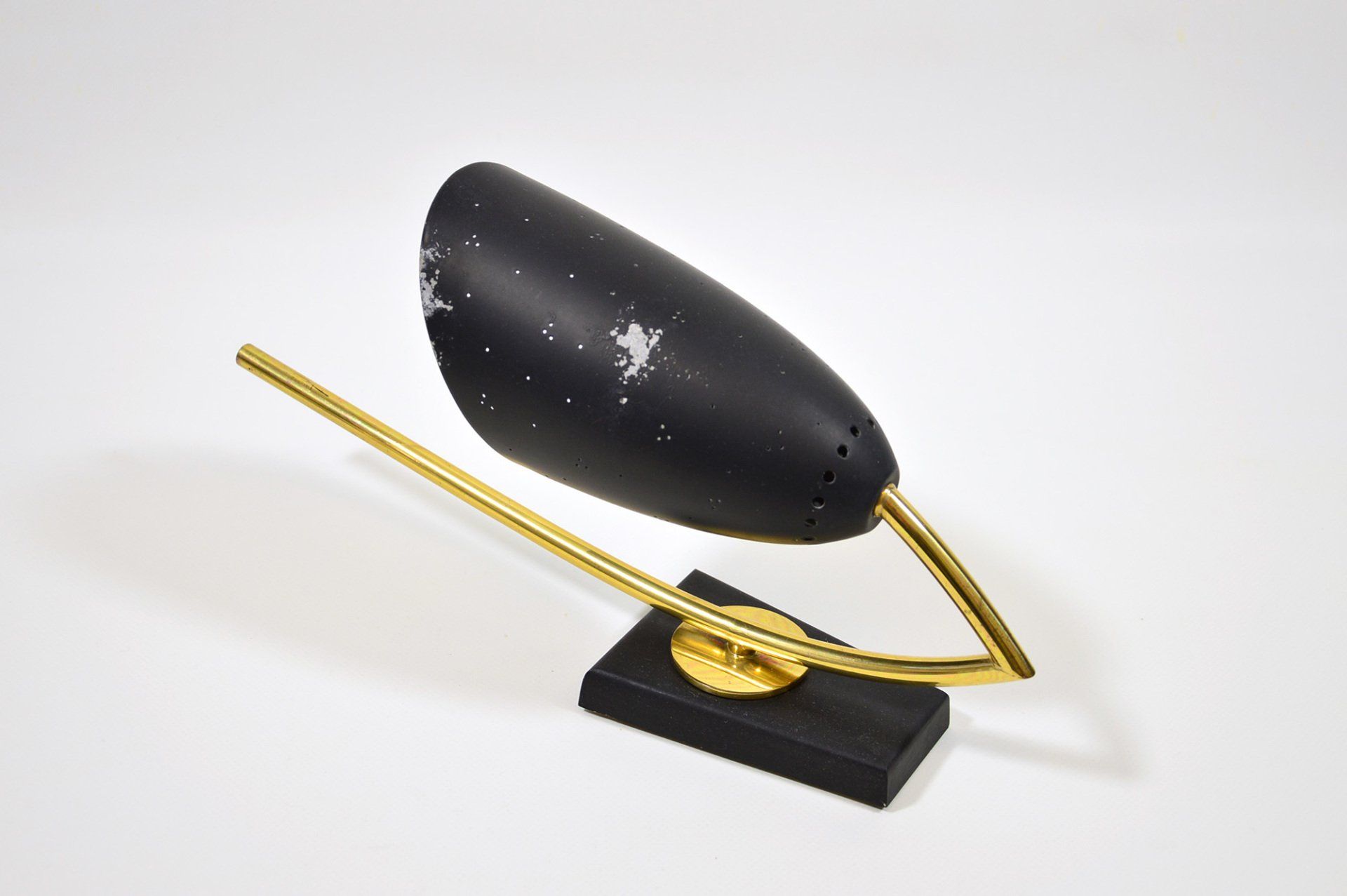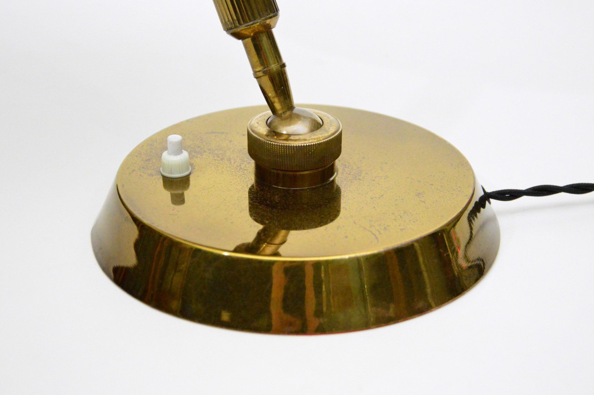 Desk lamp with two lights, completely in brass. Thanks to the two spherical joints, the stem and the lampshade it can be oriented in any direction. It carries two bulbs with E27 socket. The lamp is in very good condition, with patina. A tiny, almost invisible bump on the top of the lampshade - cm ø30 x 37h