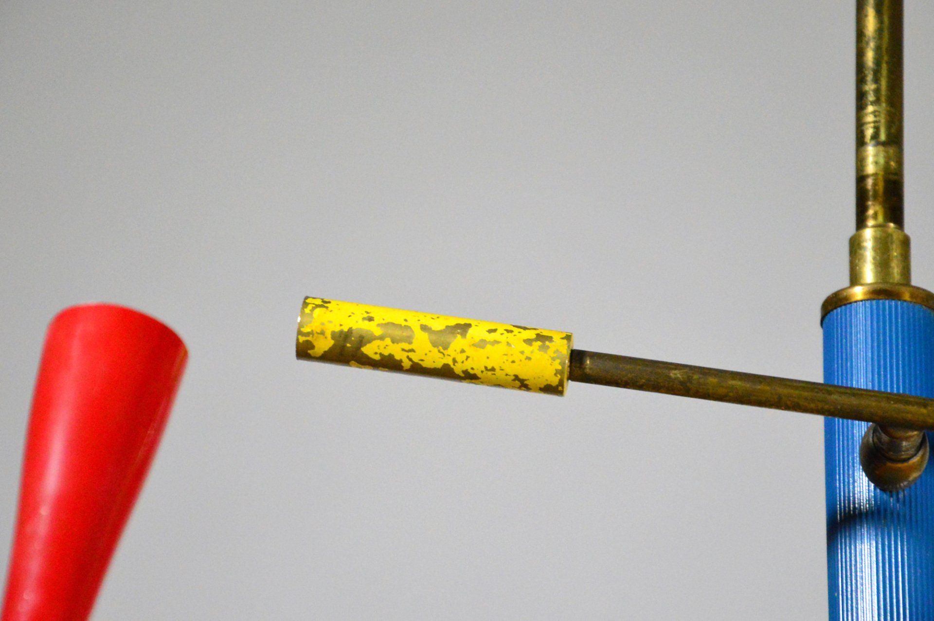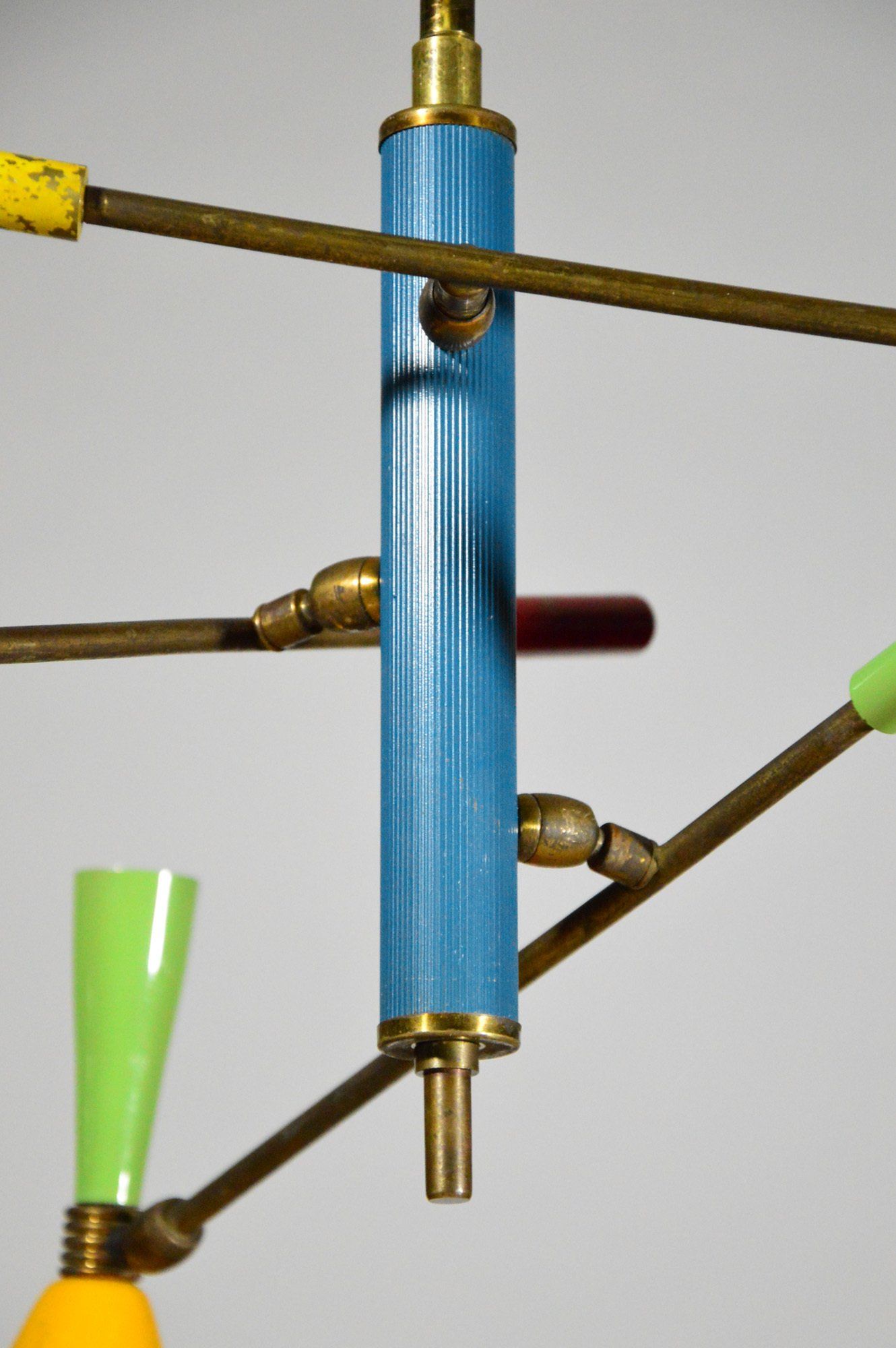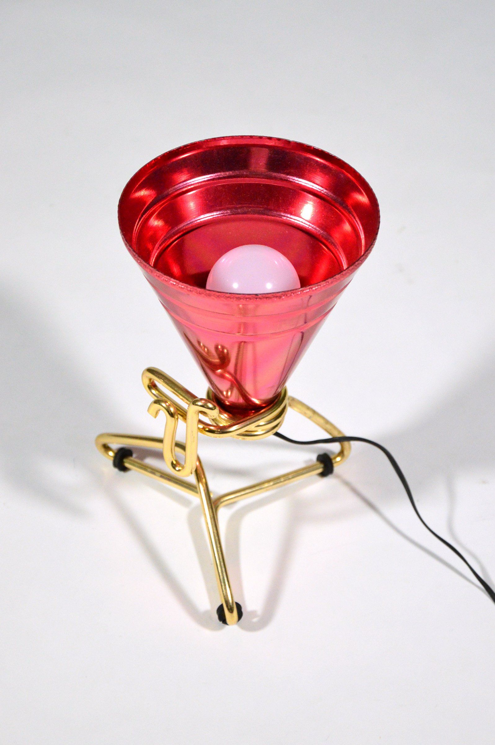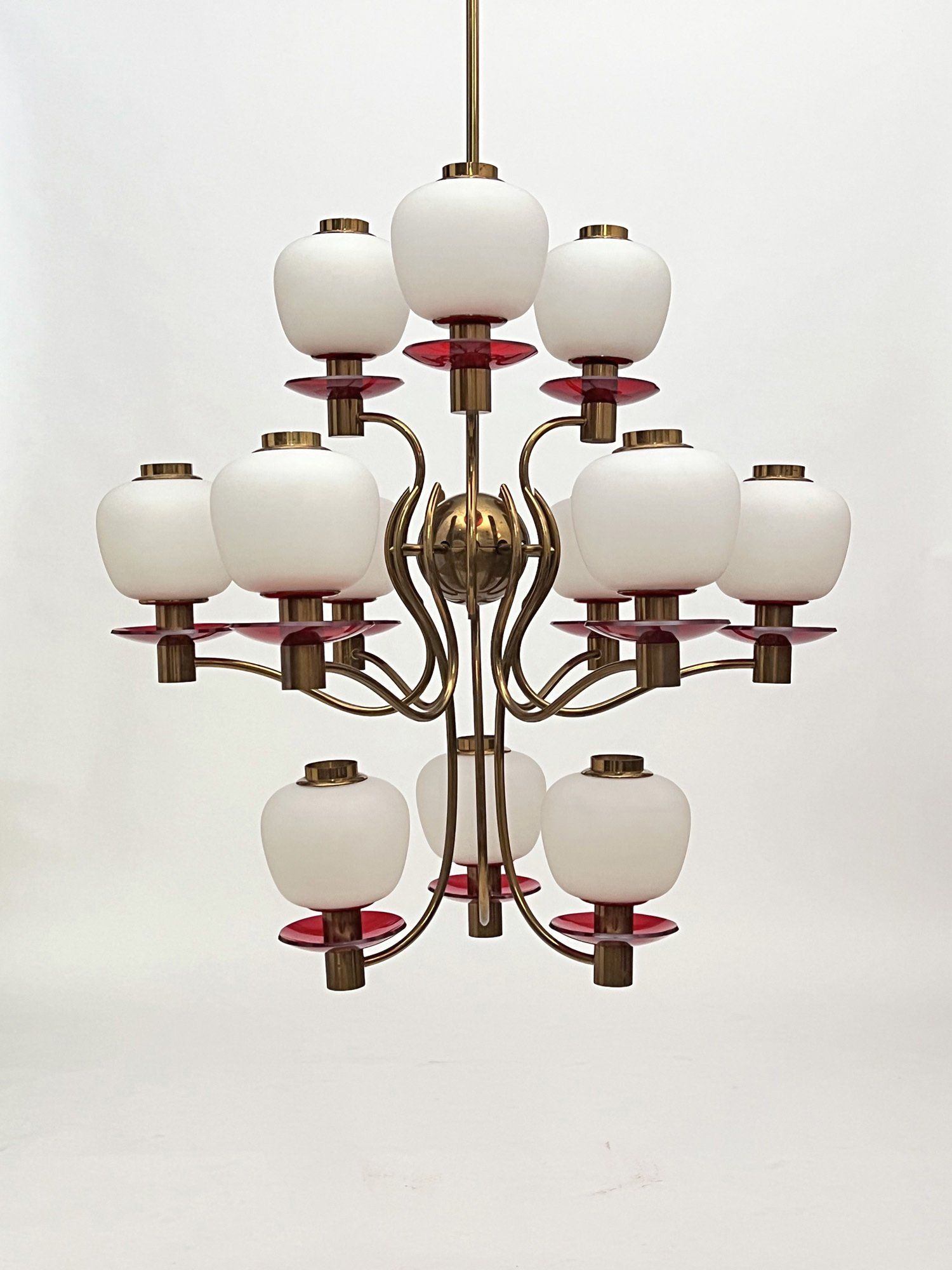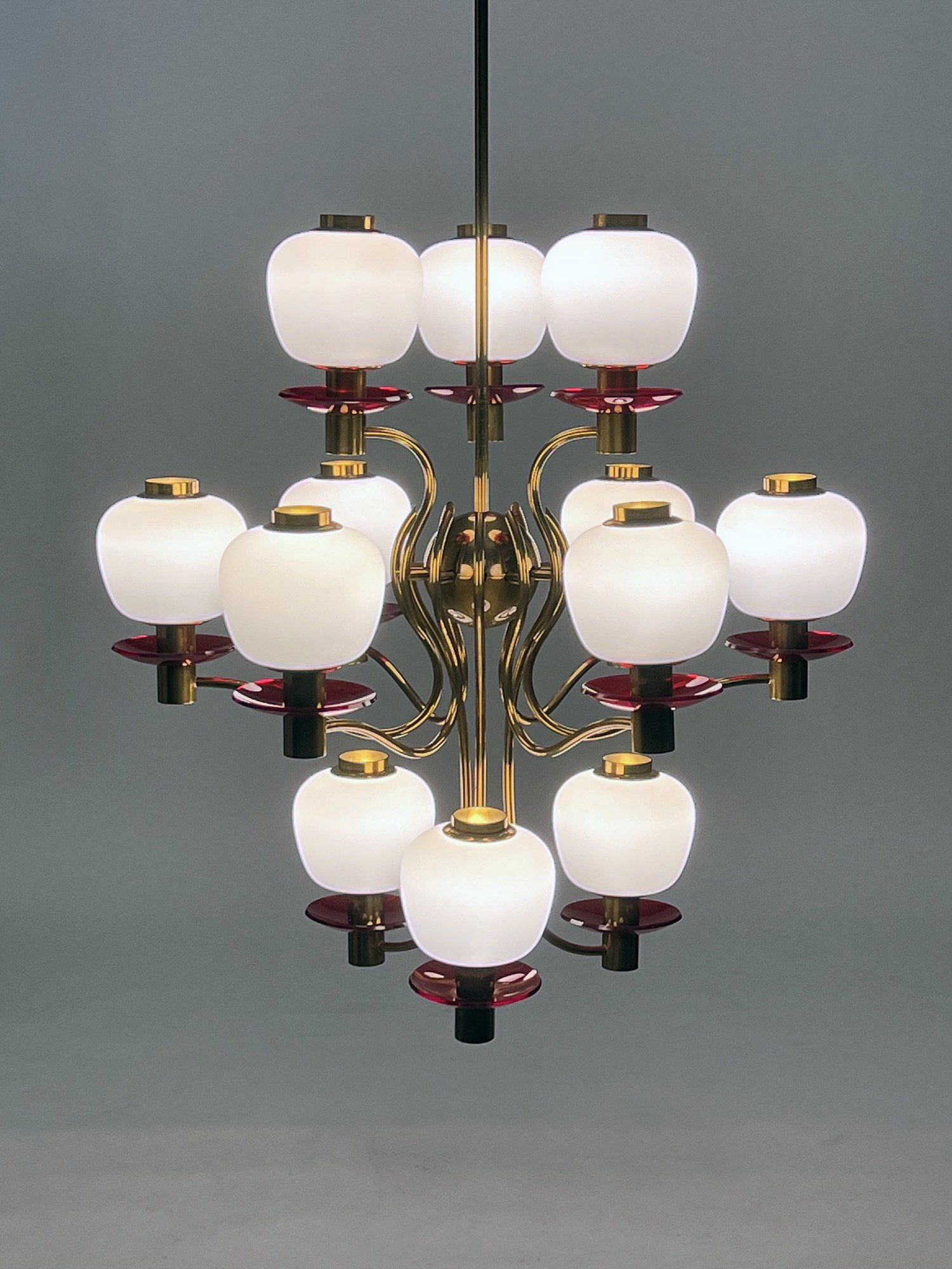 Polished brass frame, opaline glass diffusers, red Plexiglas lower discs.
