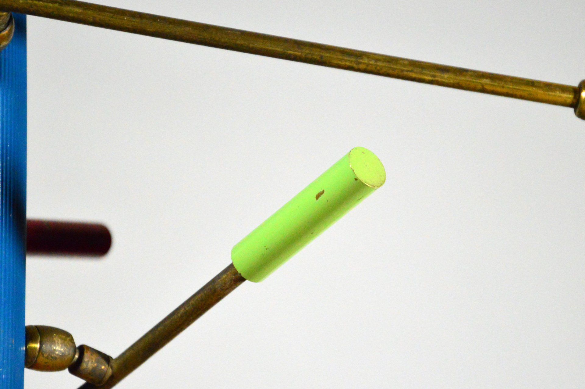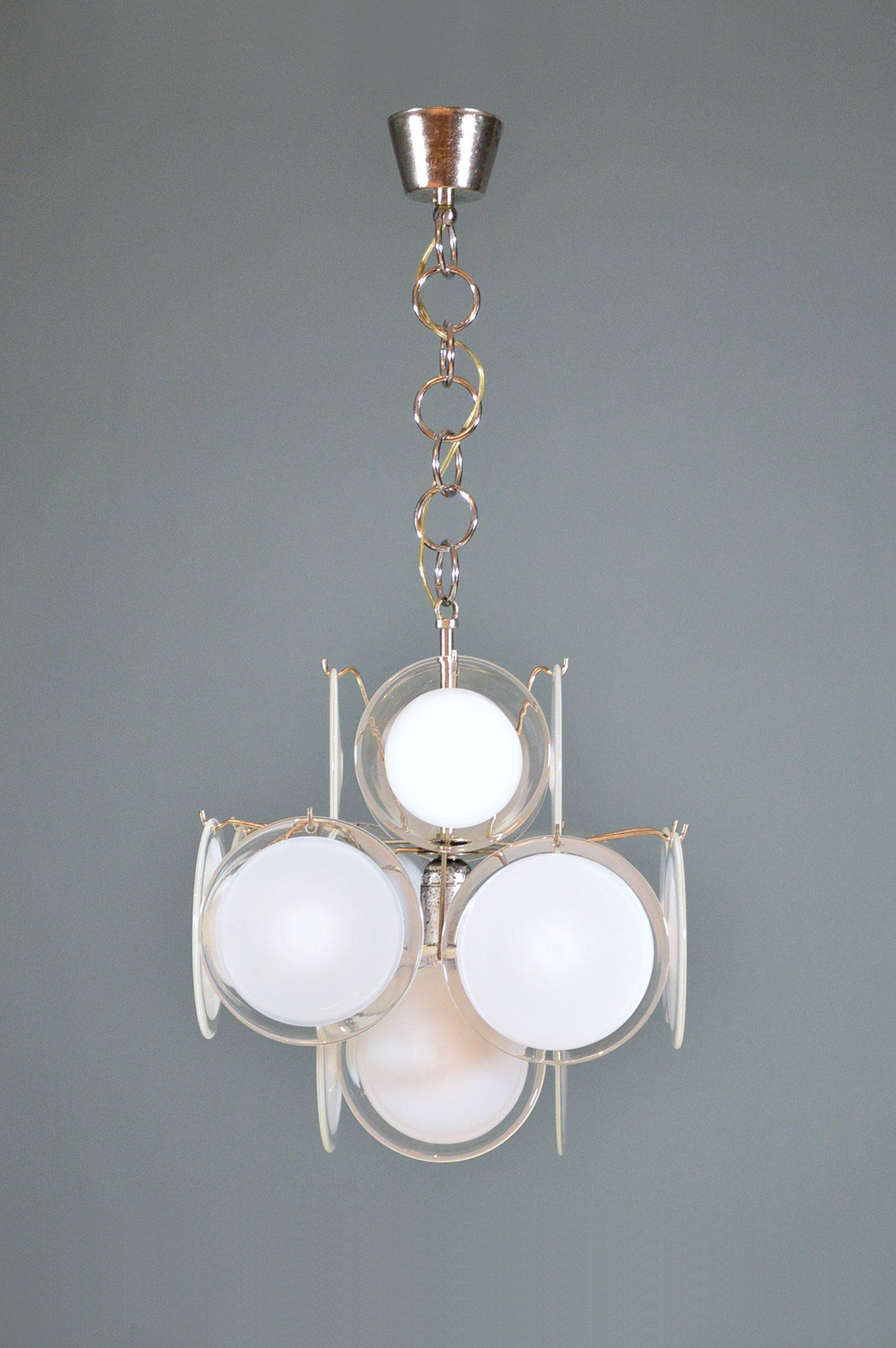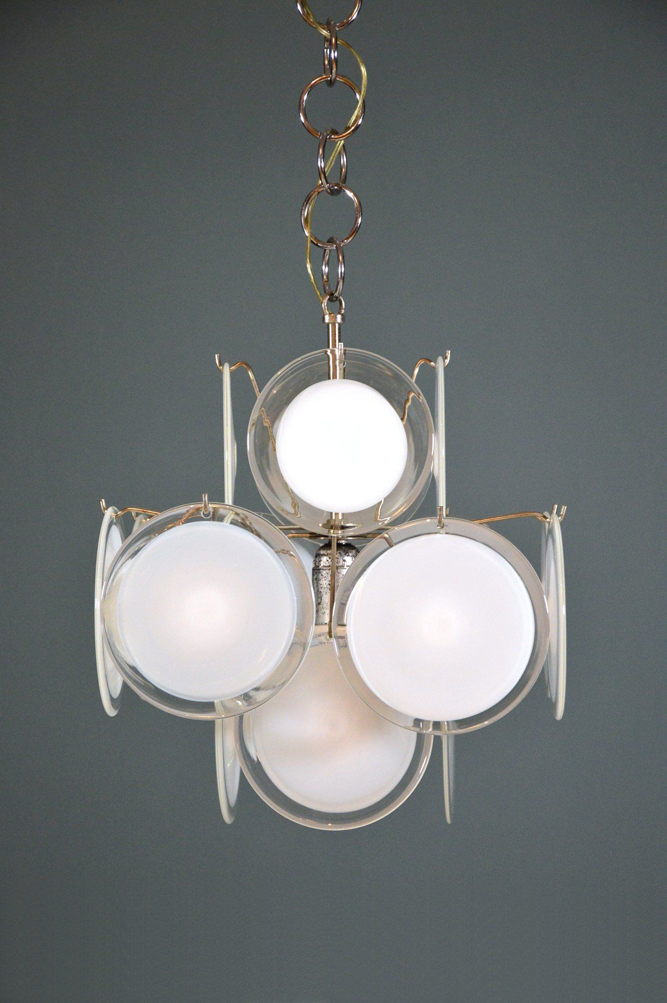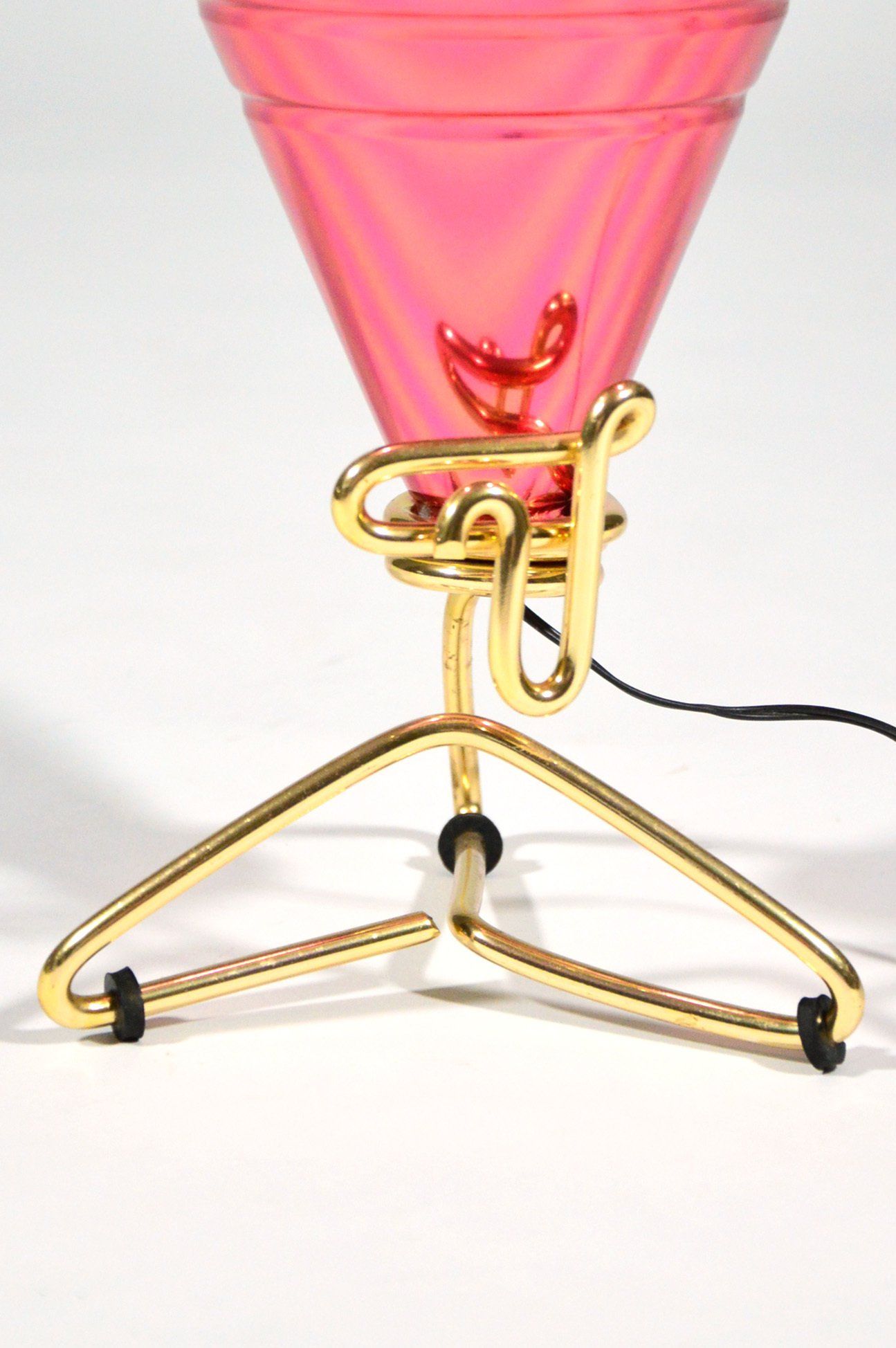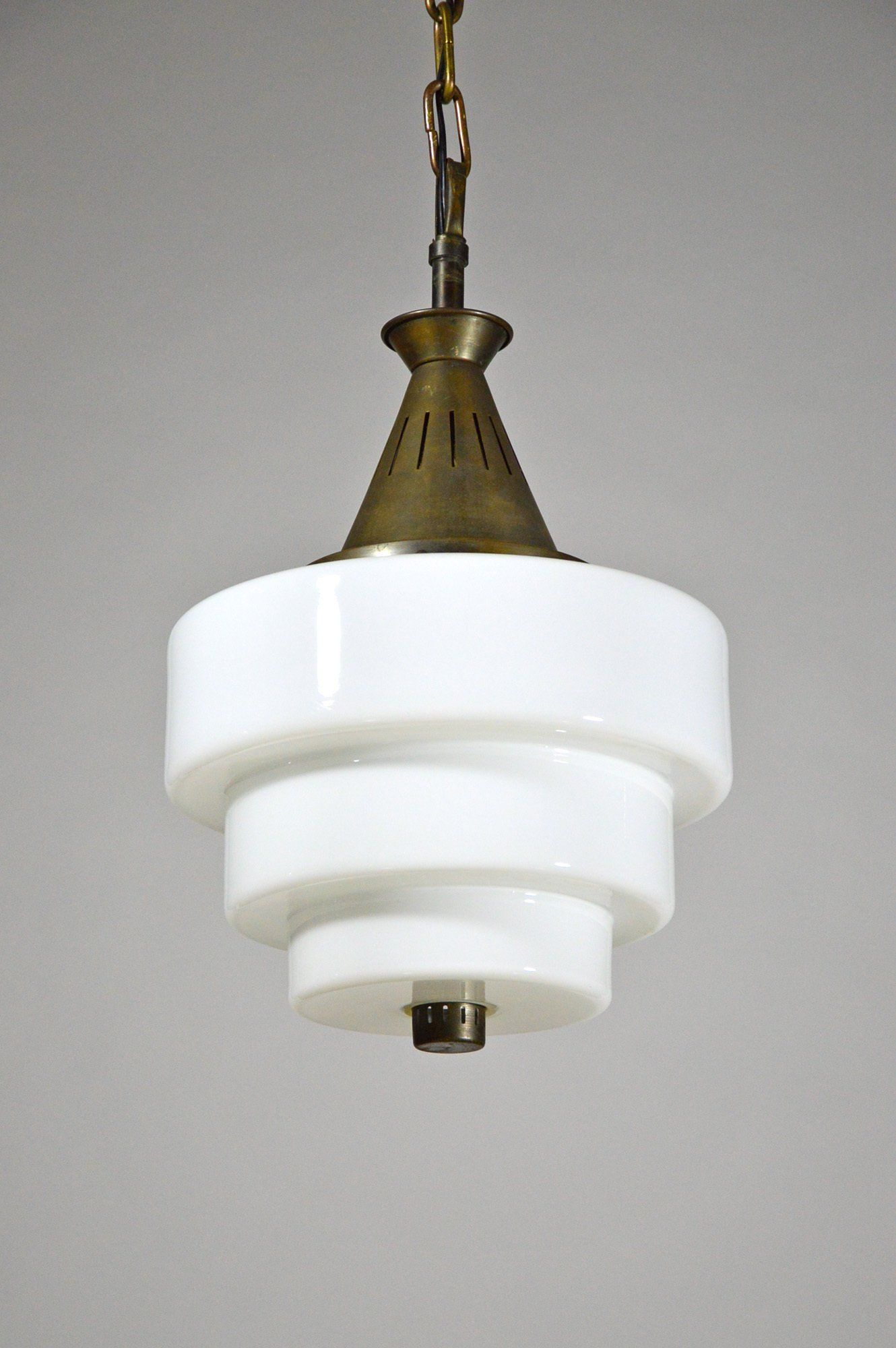 Polished brass frame, opaline glass diffusers, red Plexiglas lower discs.