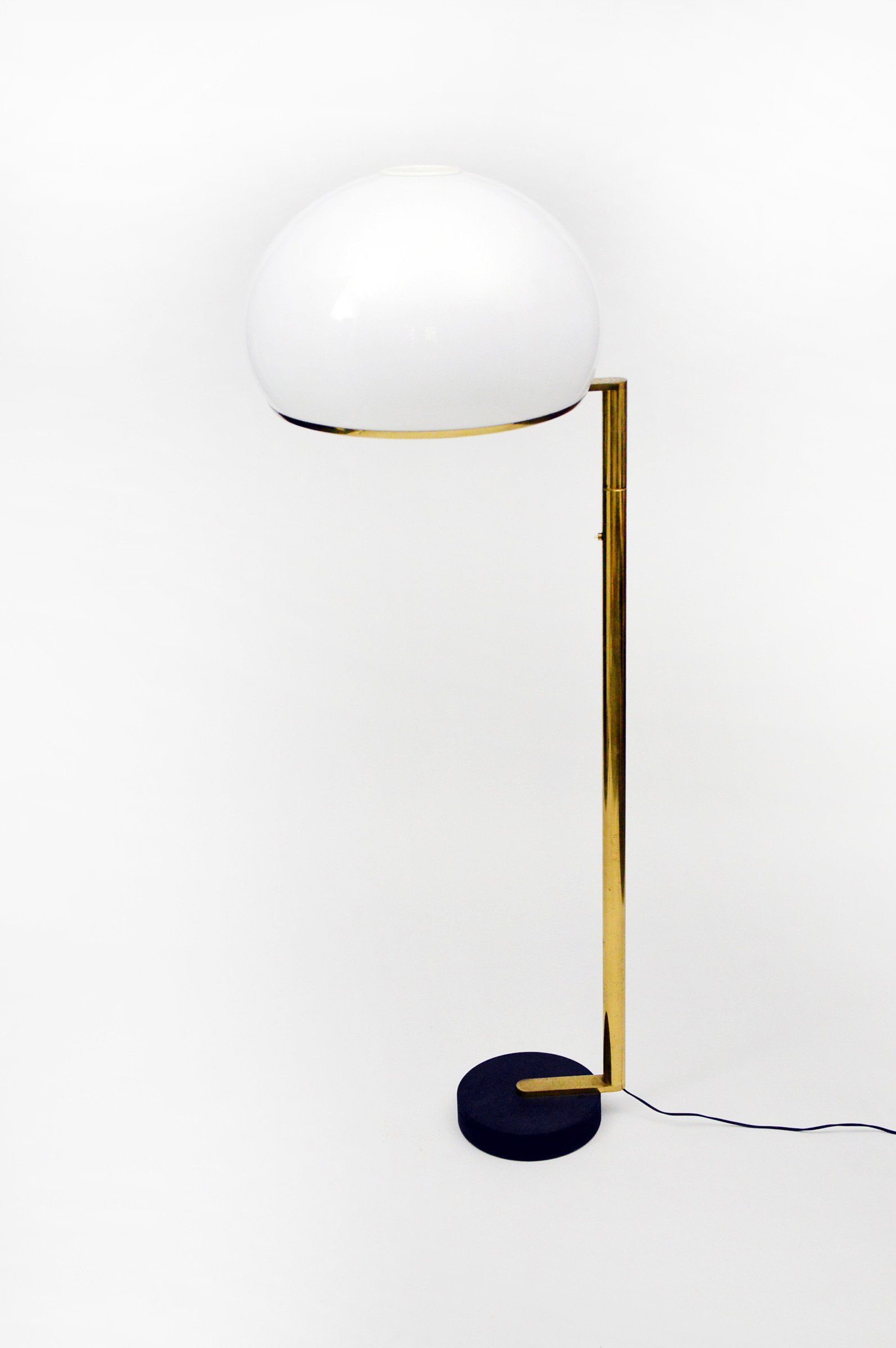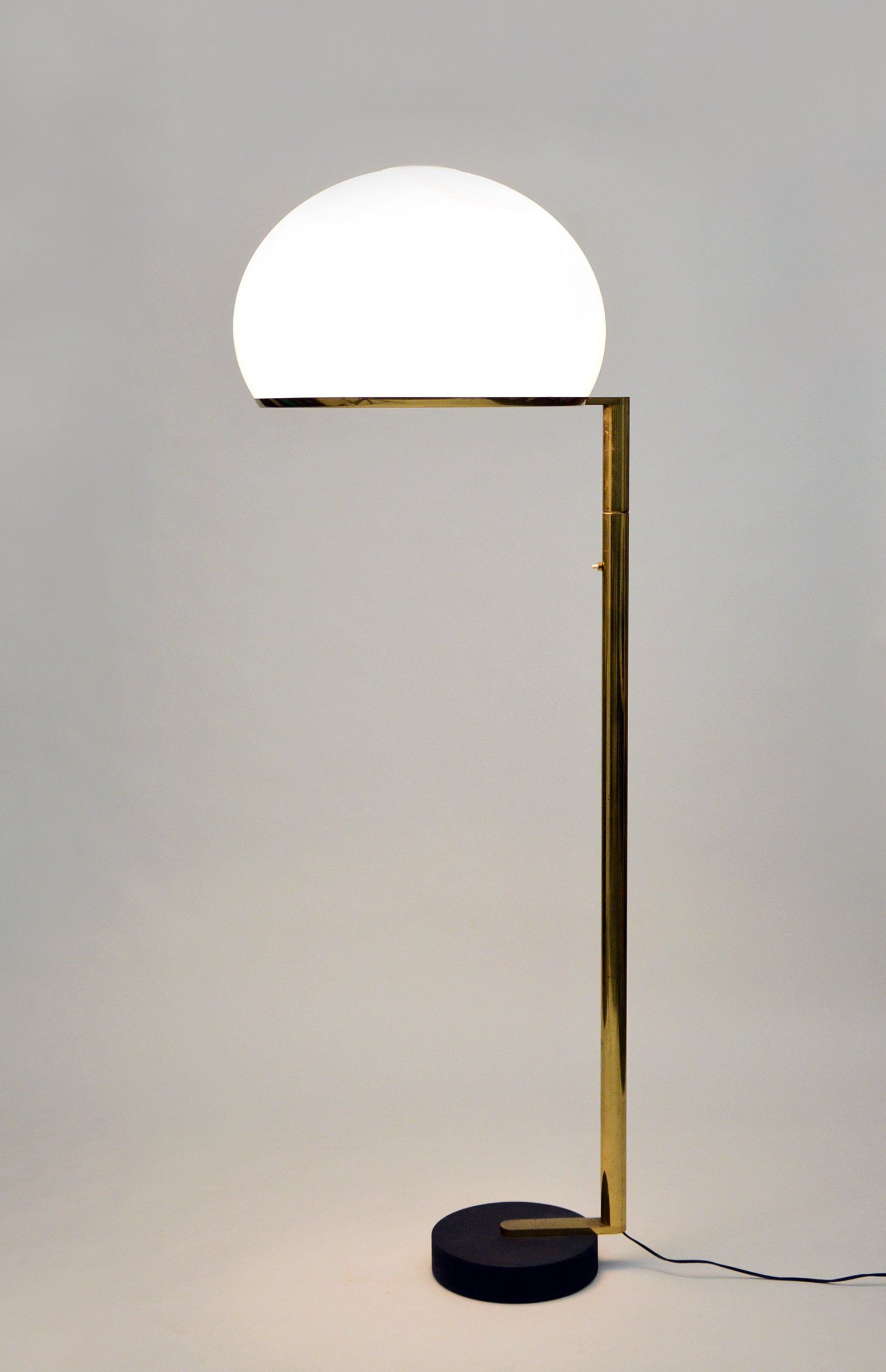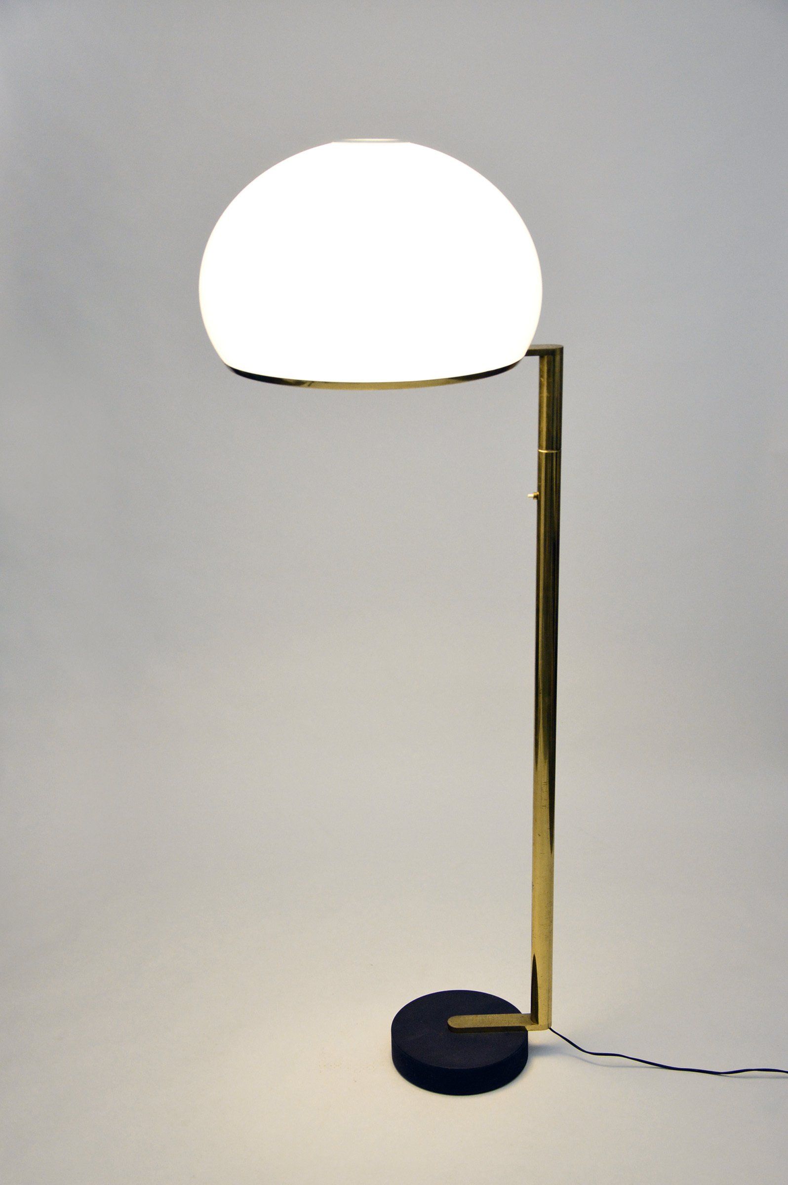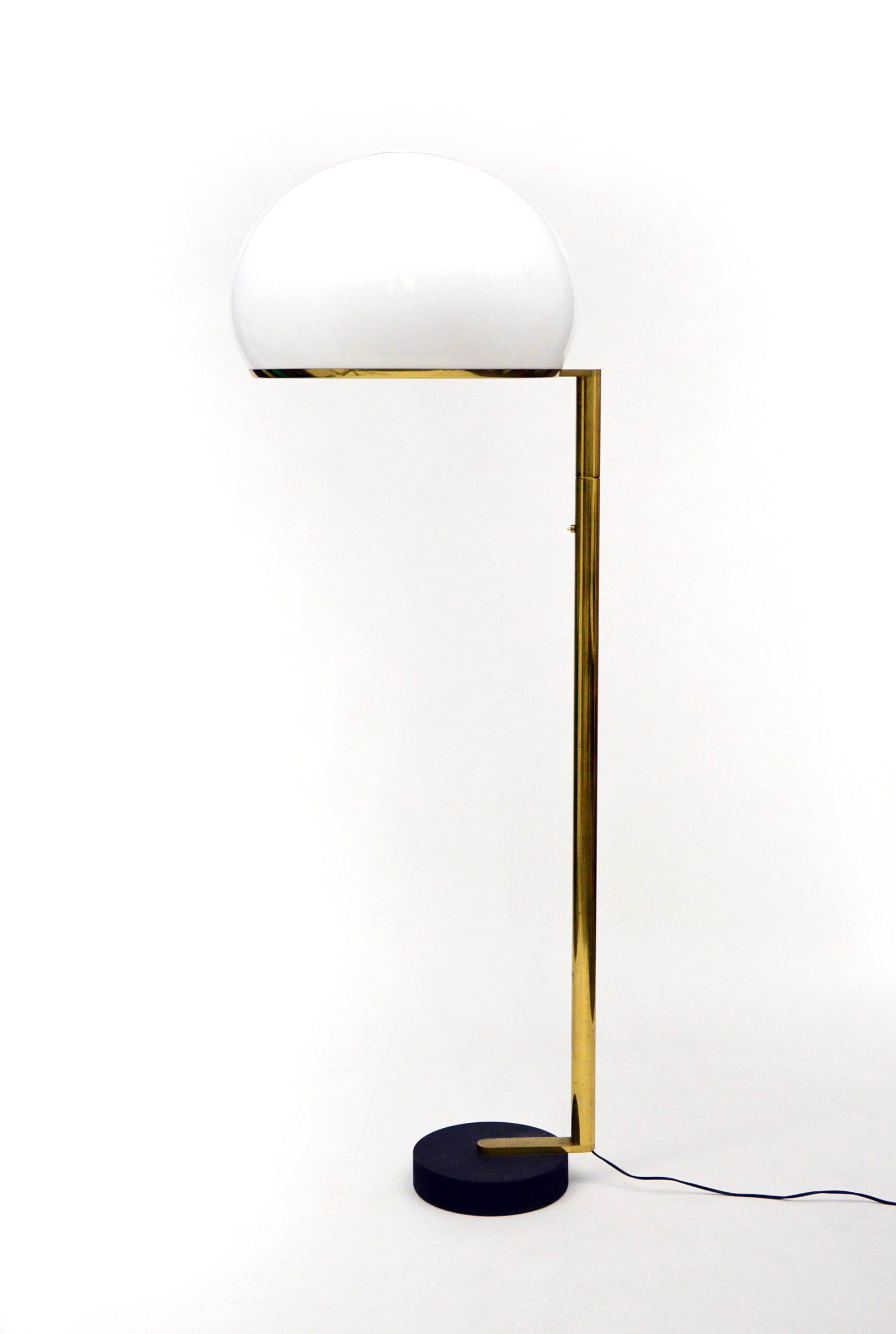 The floor lamp consists of a moulded opal perspex diffuser, a brass stem and a black cast iron base; it can be used both as a reading lamp and, thanks to the opal diffuser, as an ambient light. The lamp was designed by the Gregotti-Meneghetti-Stoppino Studio in 1966, the designers worked together from 1953 to 1969.