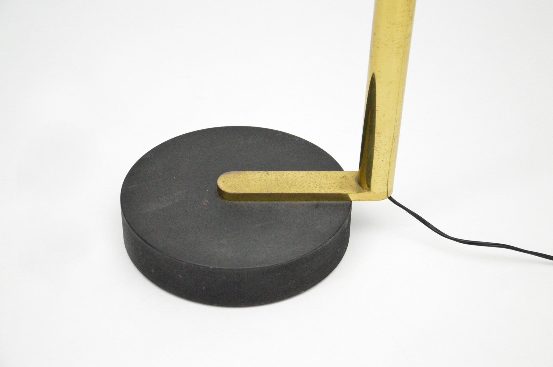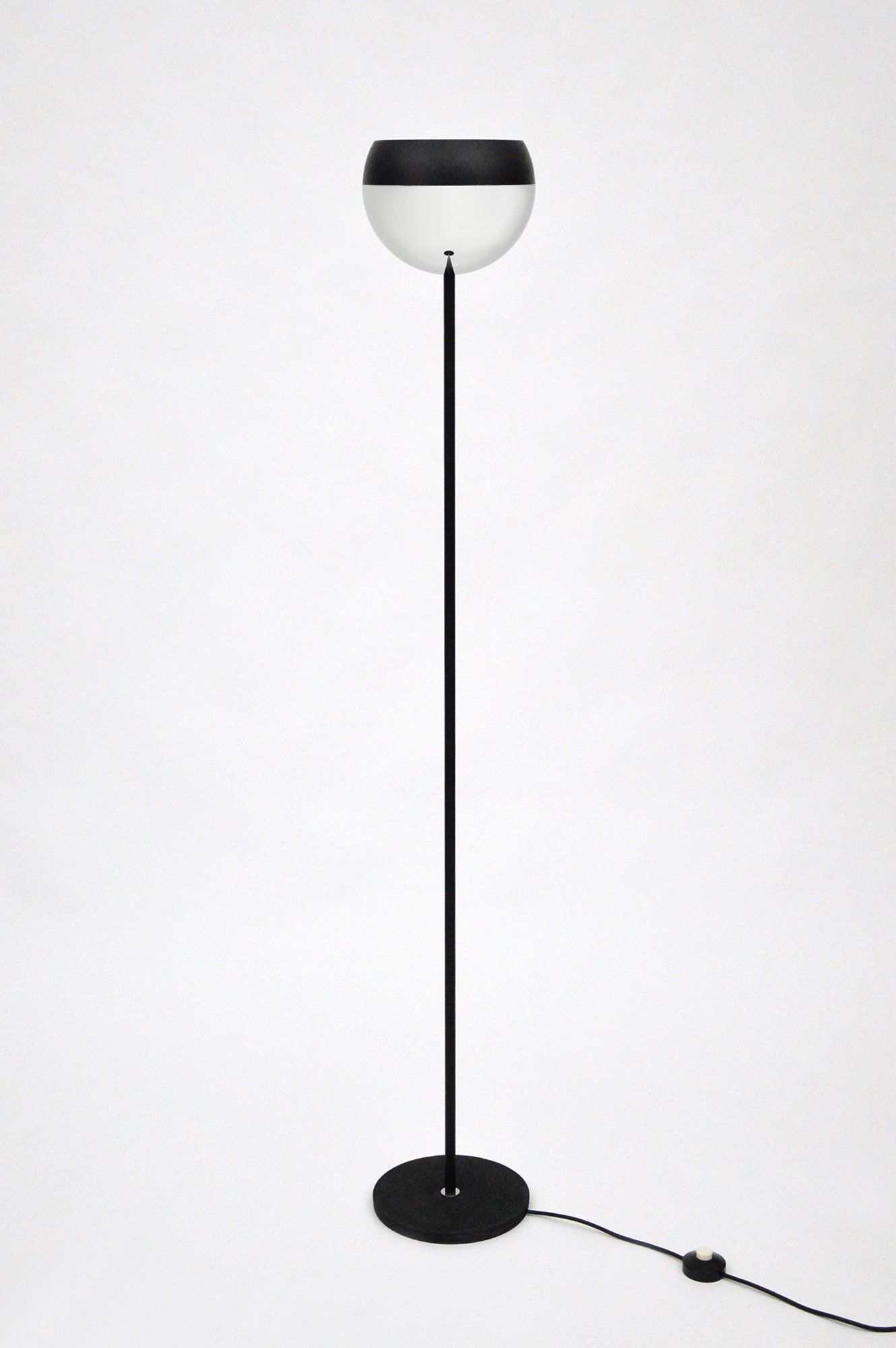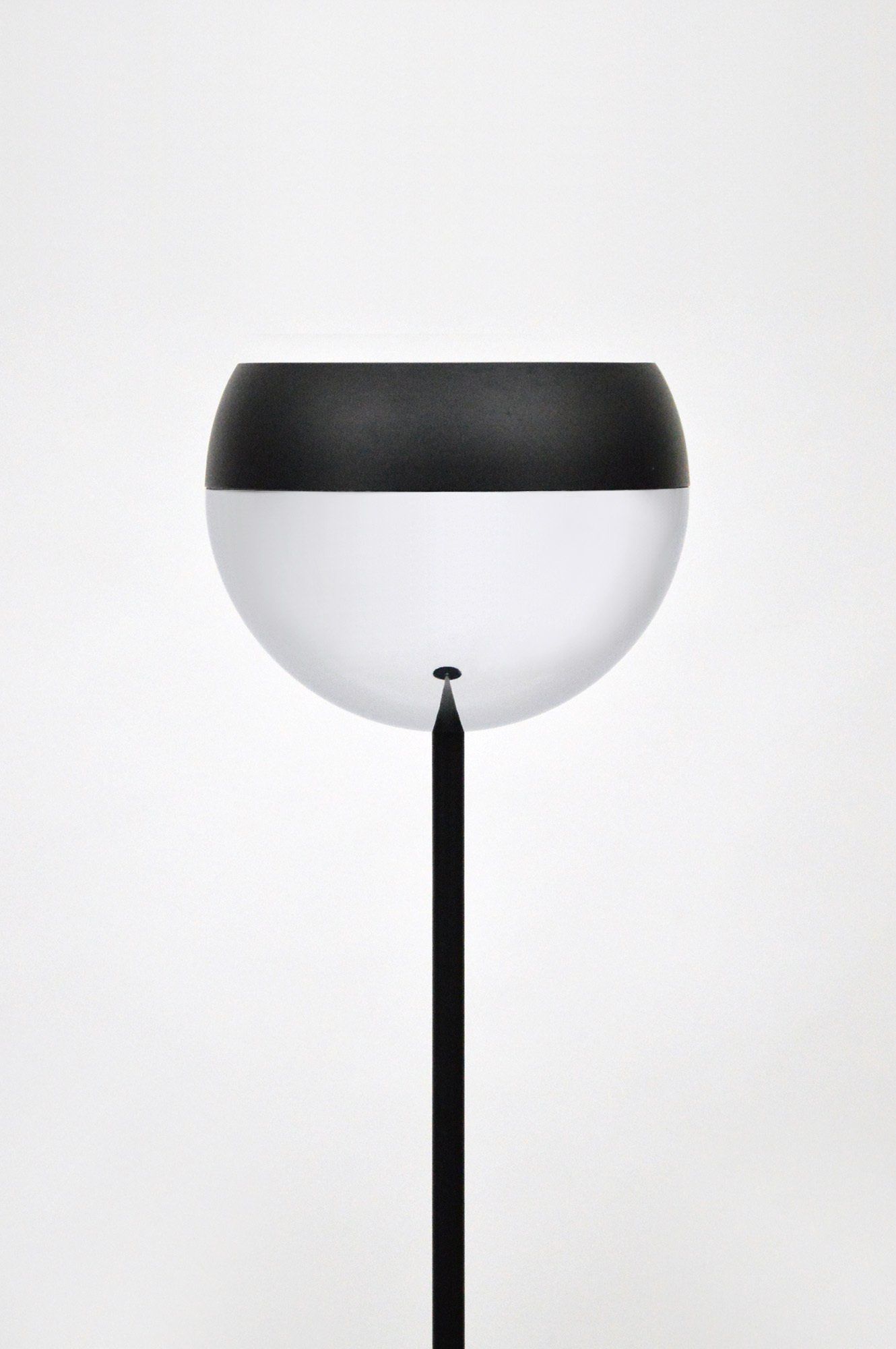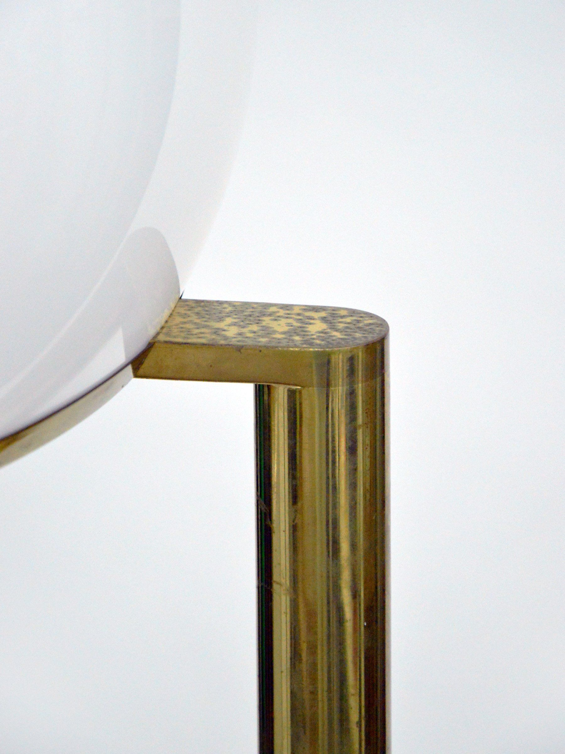 The floor lamp consists of a moulded opal perspex diffuser, a brass stem and a black cast iron base; it can be used both as a reading lamp and, thanks to the opal diffuser, as an ambient light. The lamp was designed by the Gregotti-Meneghetti-Stoppino Studio in 1966, the designers worked together from 1953 to 1969.