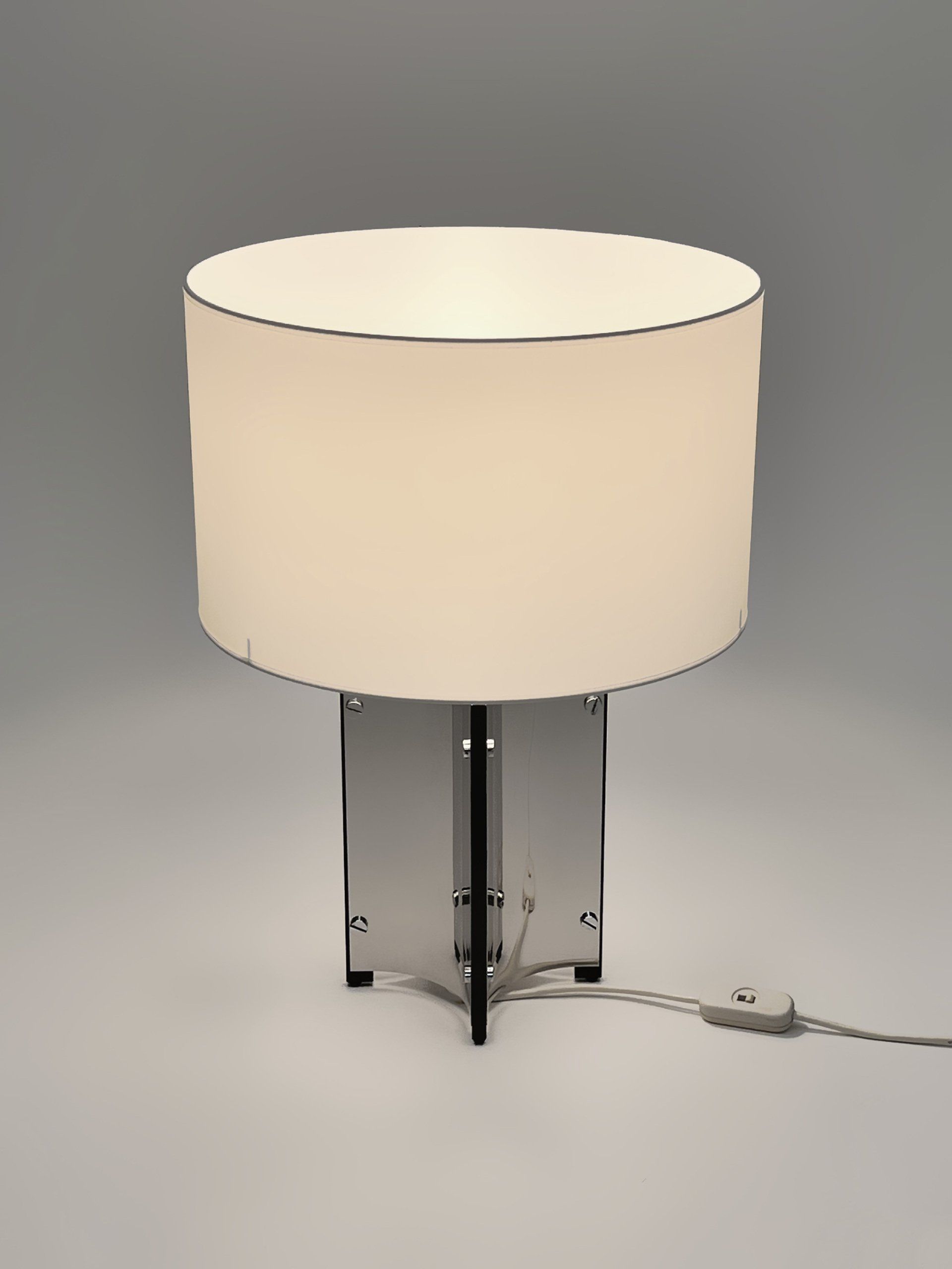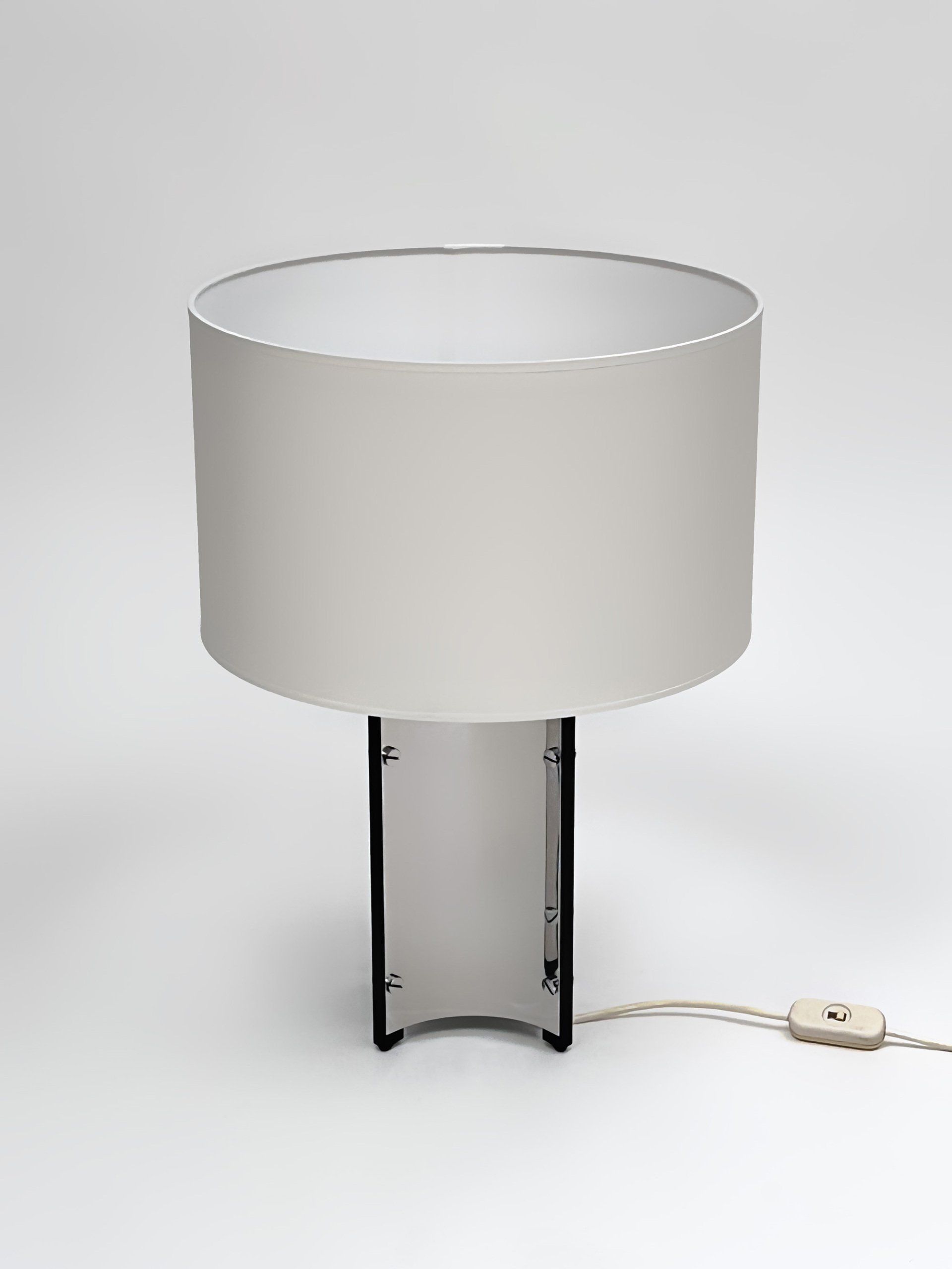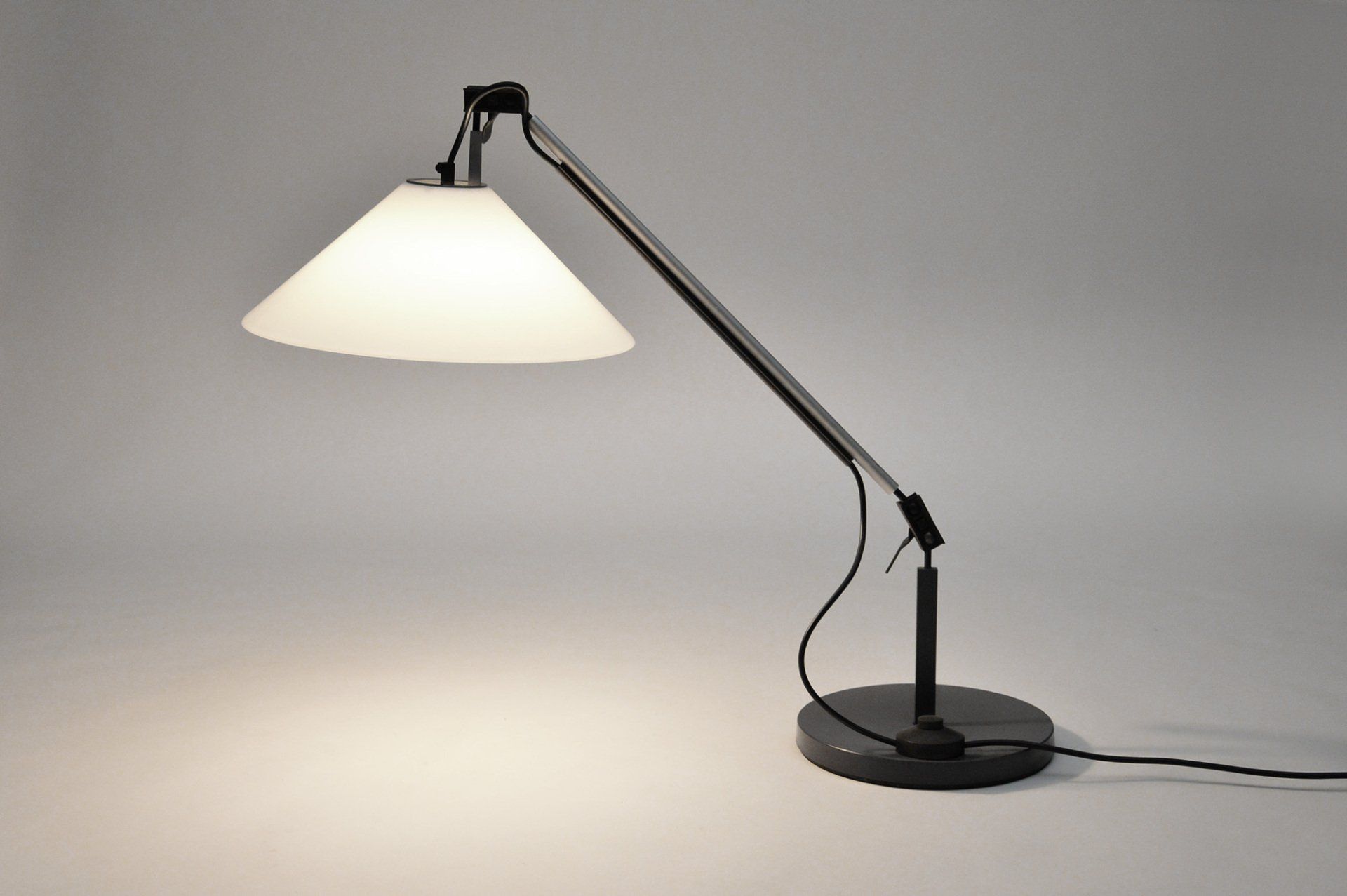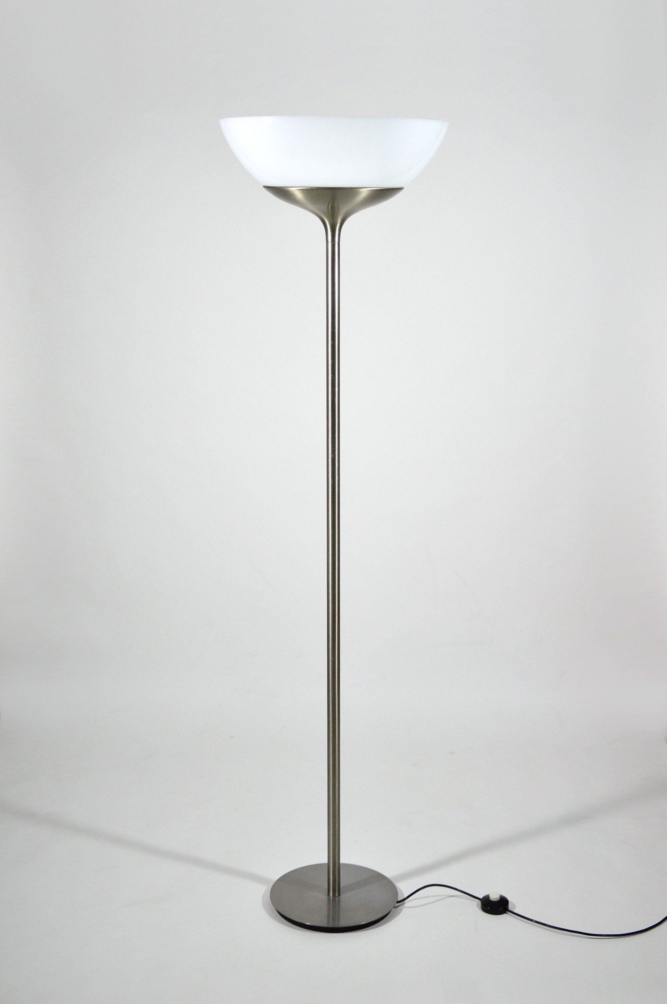 The floor lamp consists of a moulded opal perspex diffuser, a brass stem and a black cast iron base; it can be used both as a reading lamp and, thanks to the opal diffuser, as an ambient light. The lamp was designed by the Gregotti-Meneghetti-Stoppino Studio in 1966, the designers worked together from 1953 to 1969.