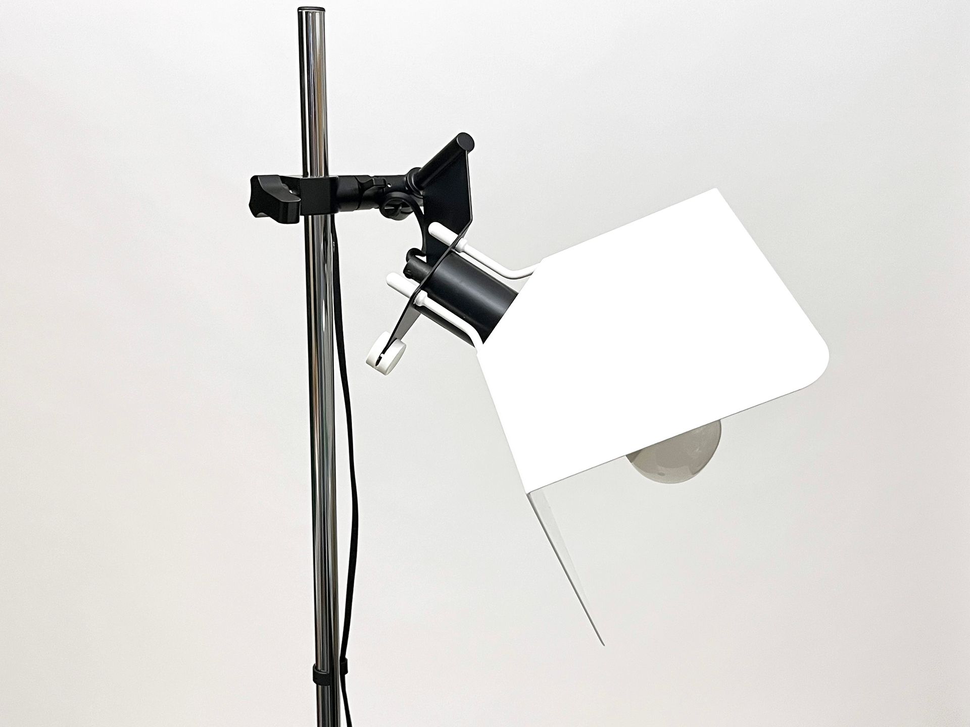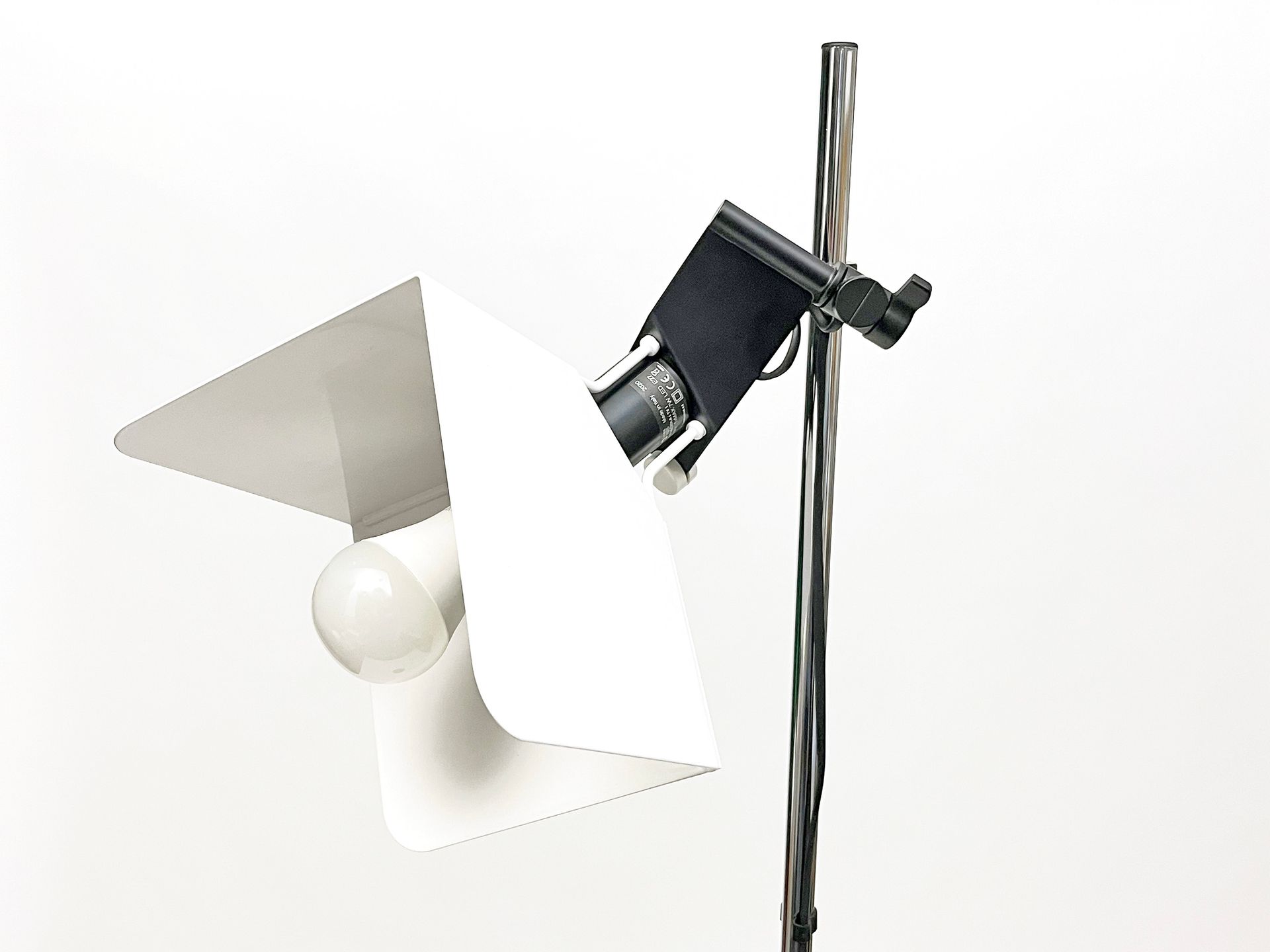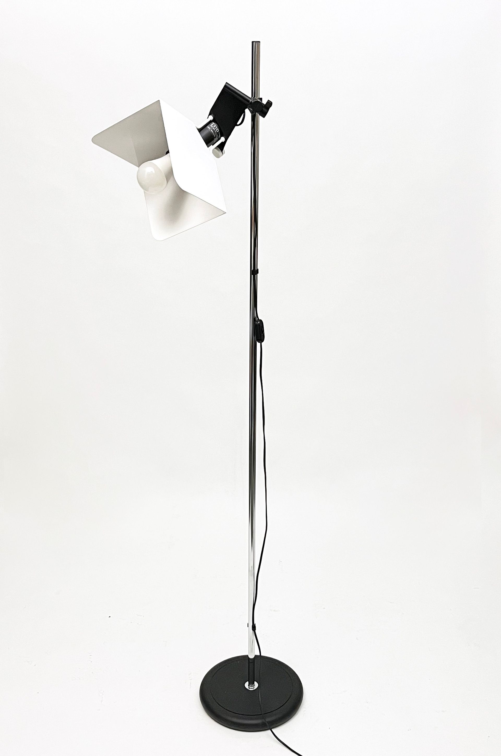 Joe colombo was inspired for this floor lamp by the spotlights used for photographic sets. The light, thanks to the shaped metal shade bent into three parts, is reflected without dazzling. The design is essential but the attention to detail highlights the beauty of the technical object without needing any decoration - cm