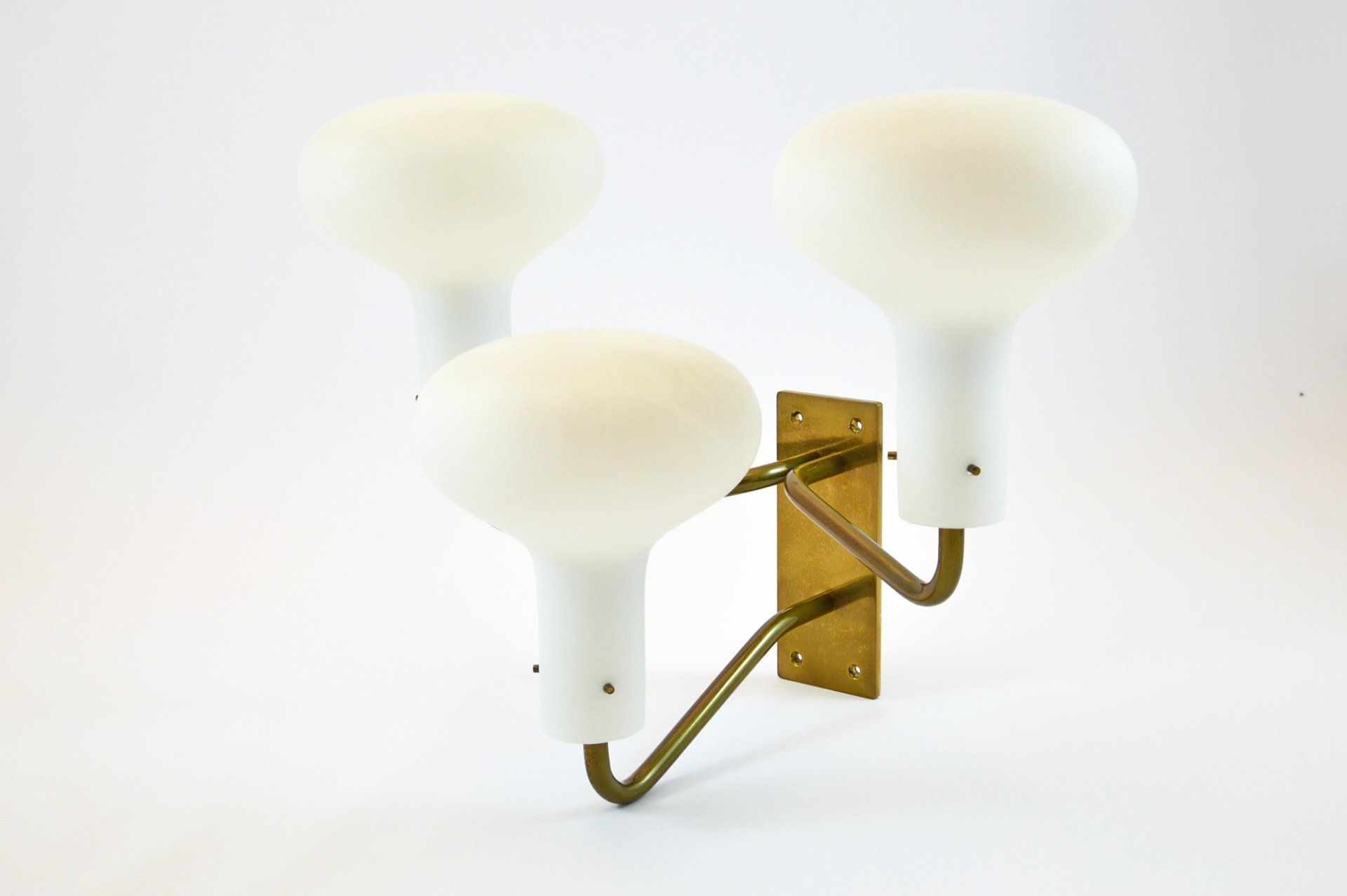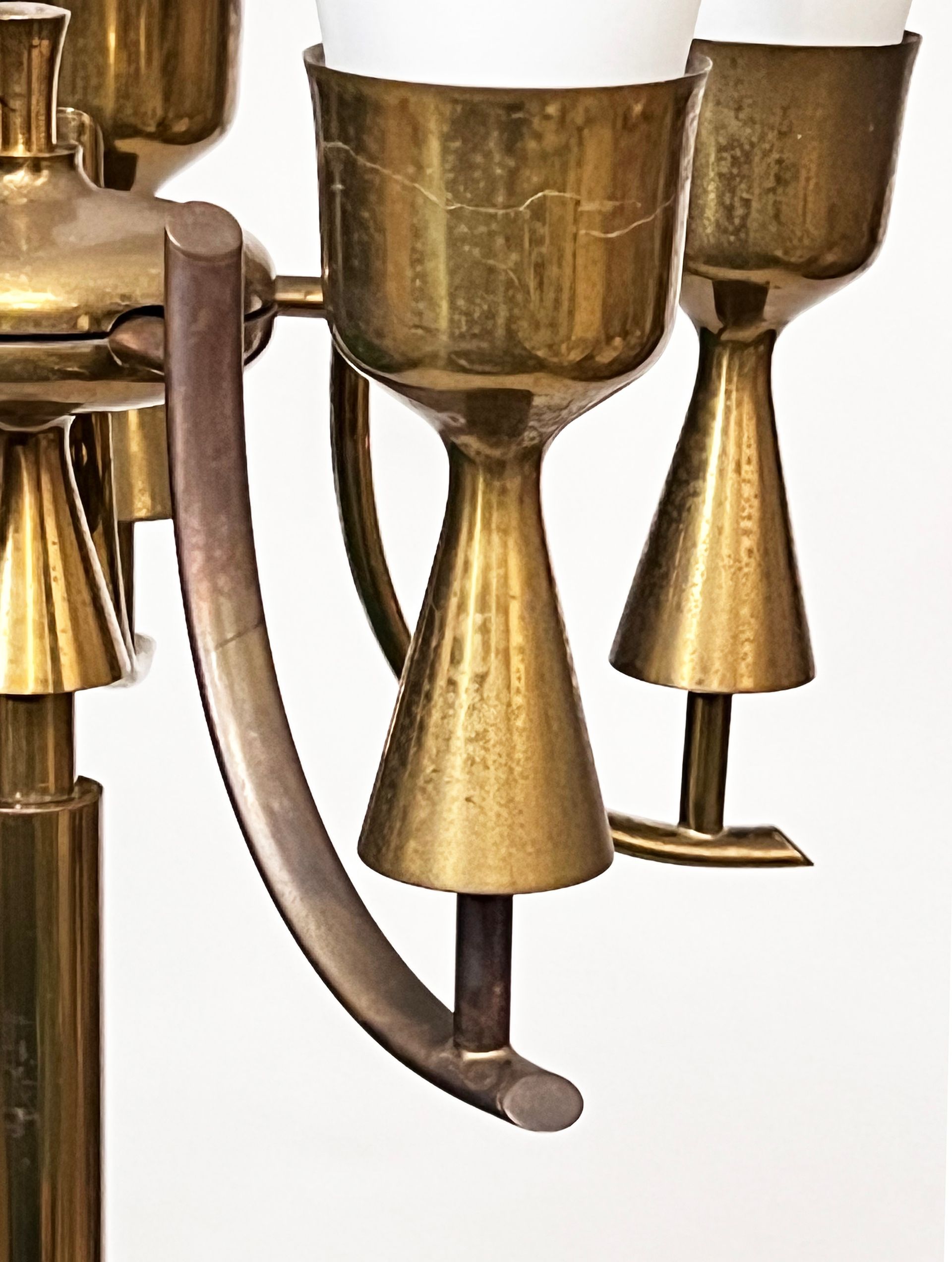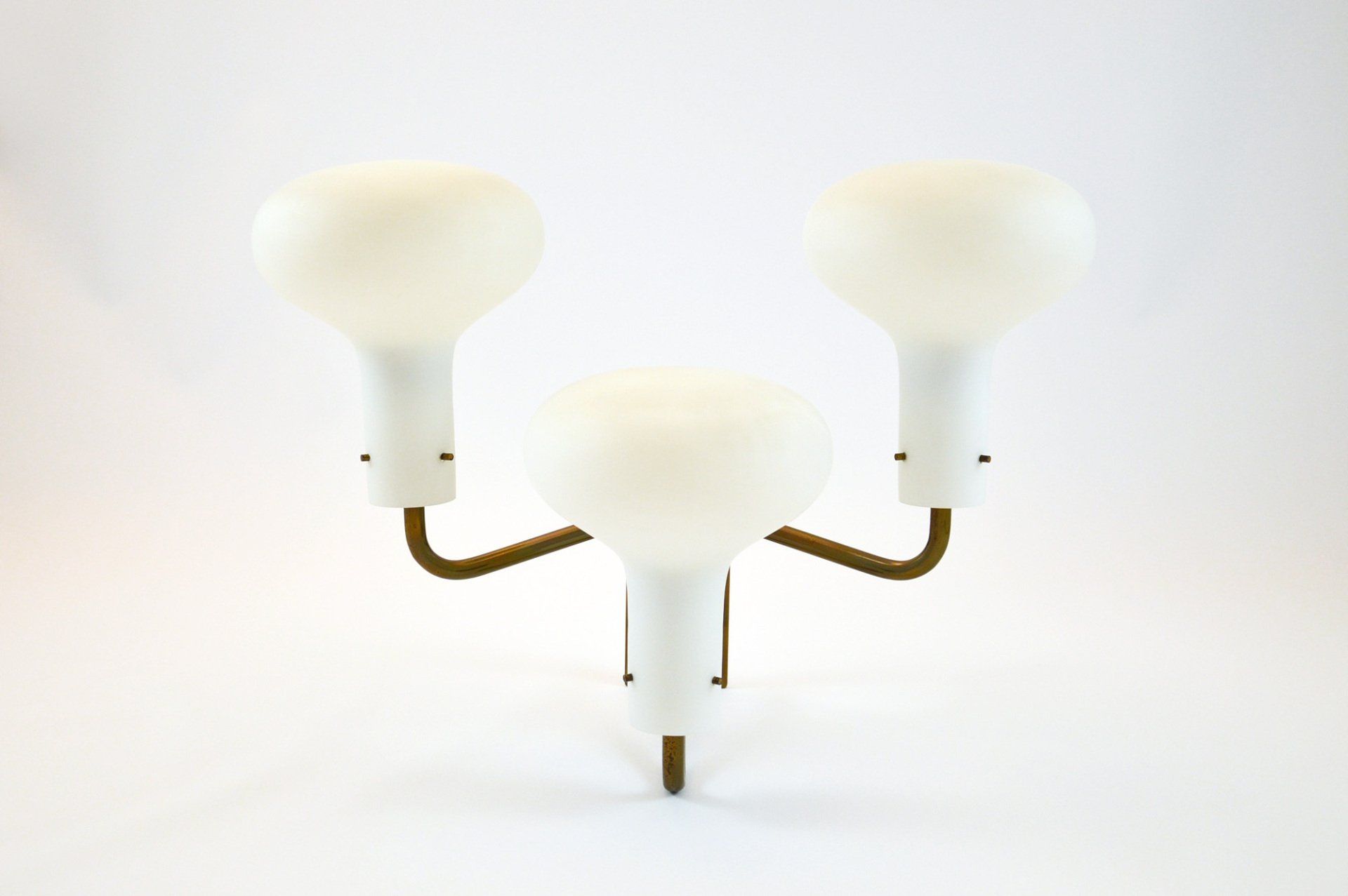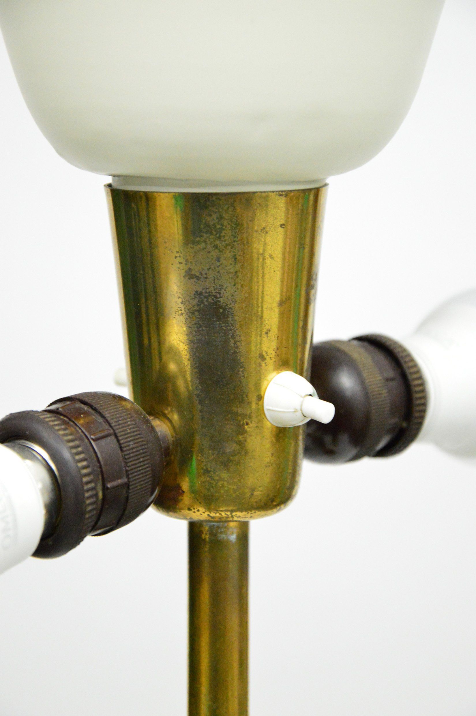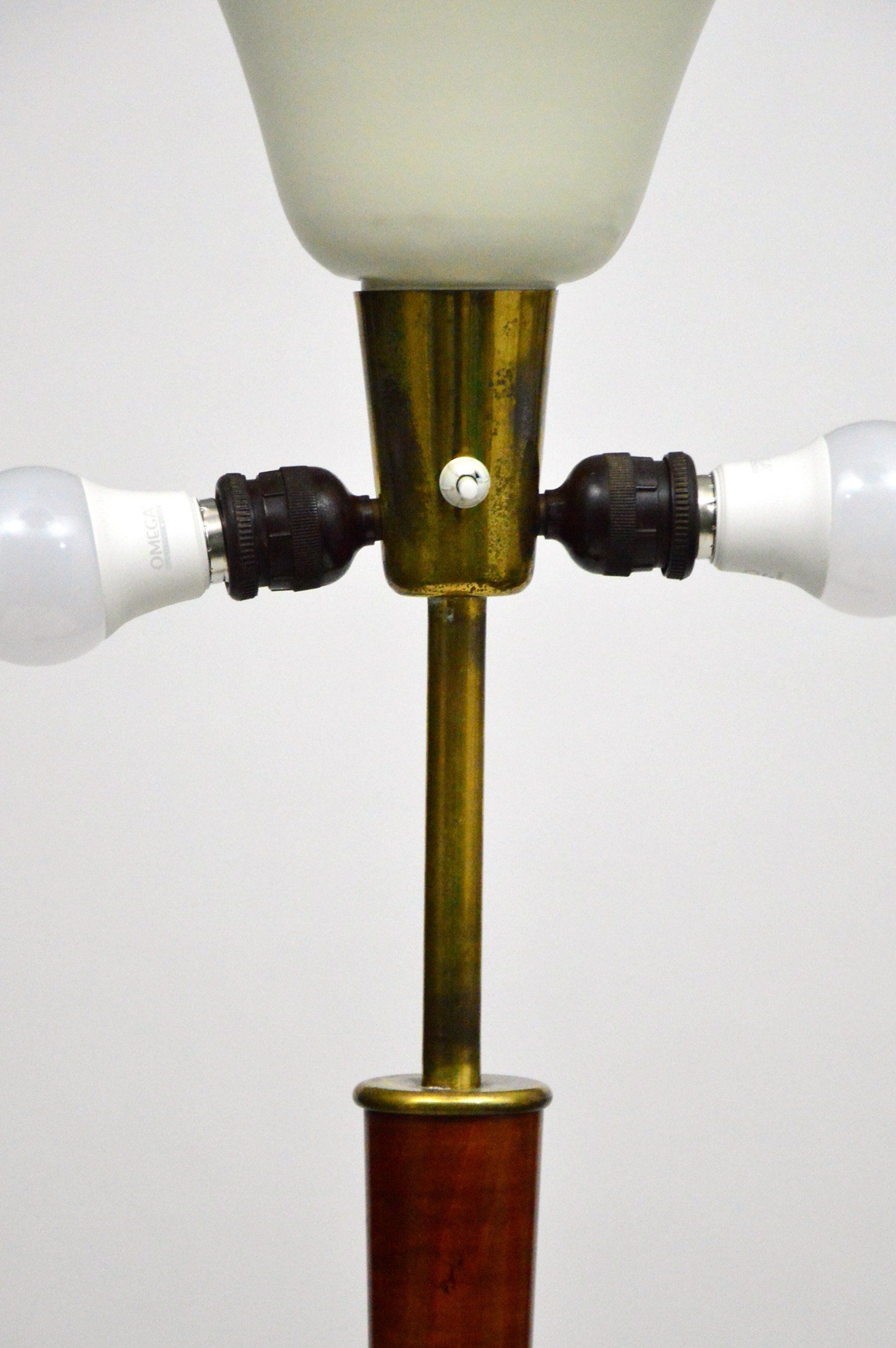 The lamp, designed by Angelo Lelii, is made of brass with a marble base and frosted glass diffusers.