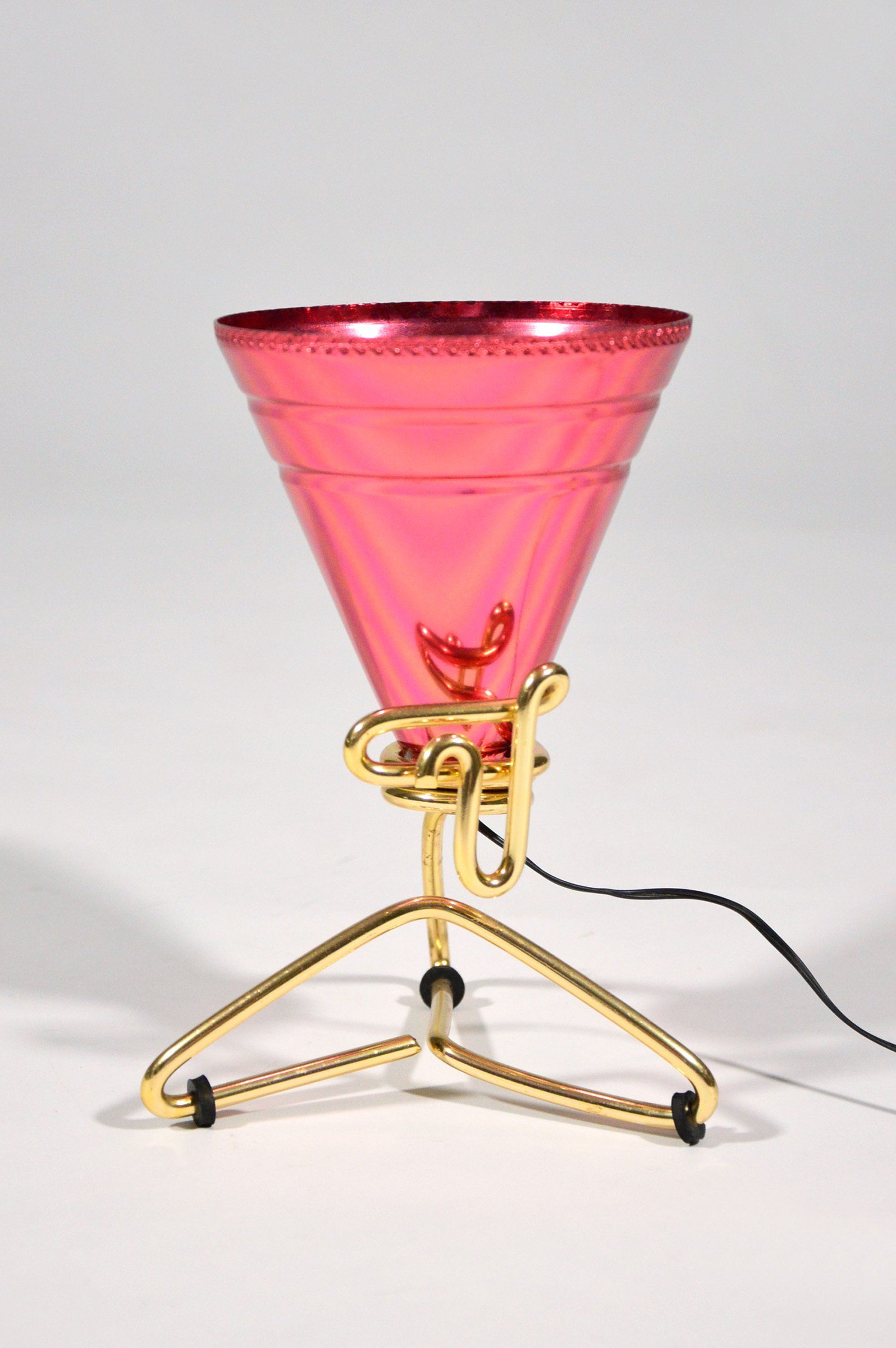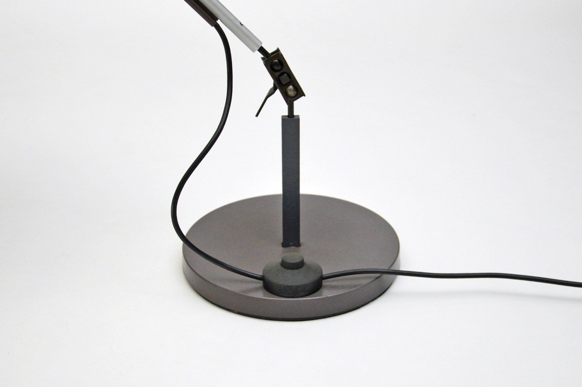 Anodized aluminum tv lamp made in italy in the 1950s. This type of lamp was used on top of black and white televisions to decrease eye fatigue, as television was often watched with the lights off. This type of lamp was used to reduce the contrast between the darkness and the illumination given by the television set. Nowadays the recommended use is as a bedside lamp. cm H17 x W15 x D12 -