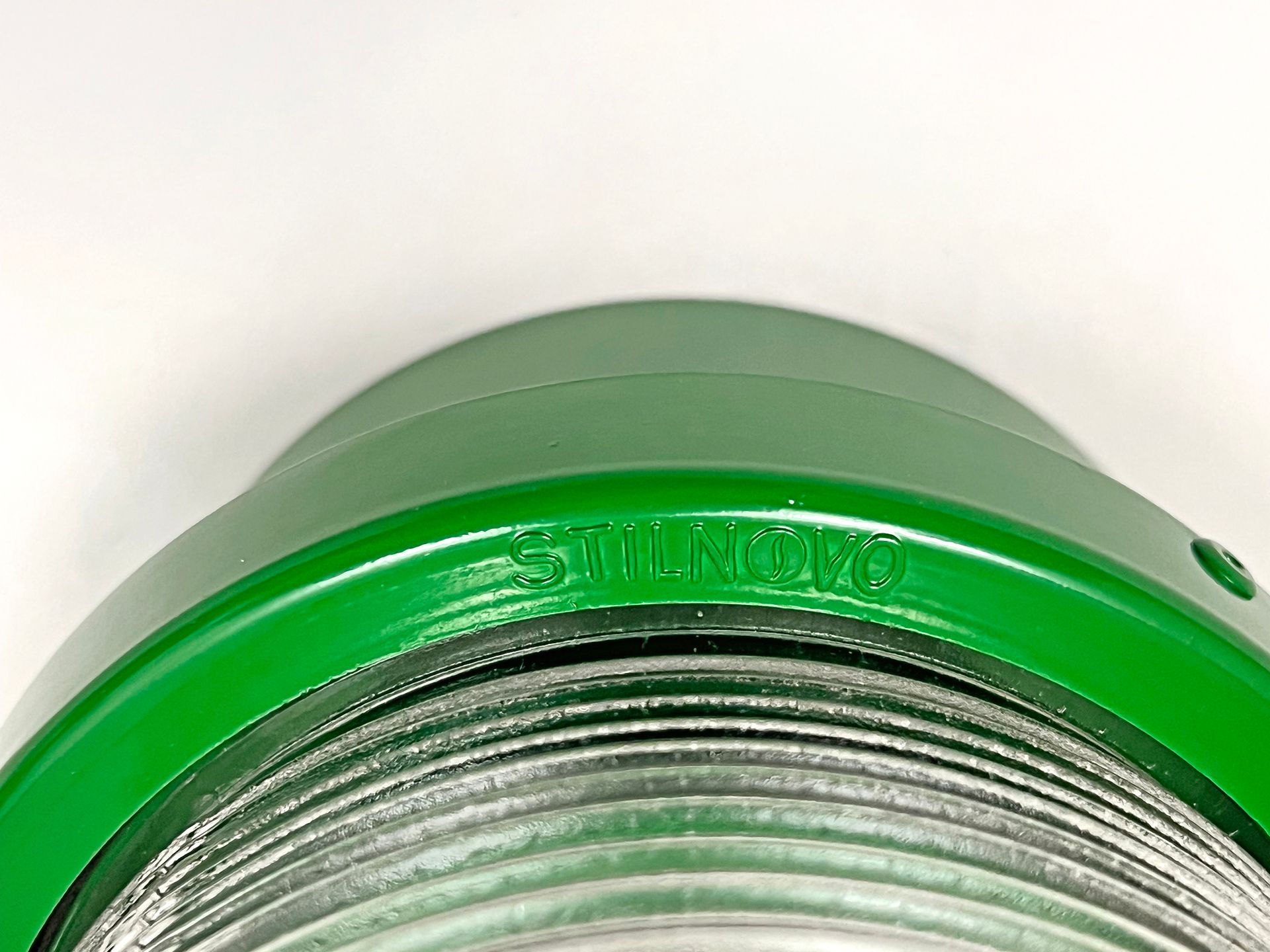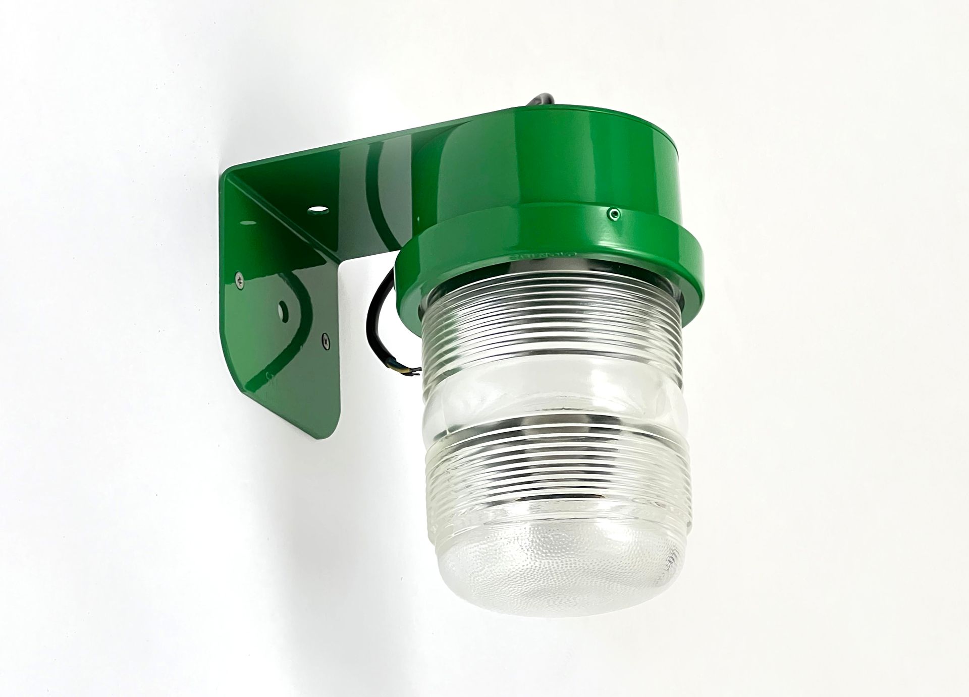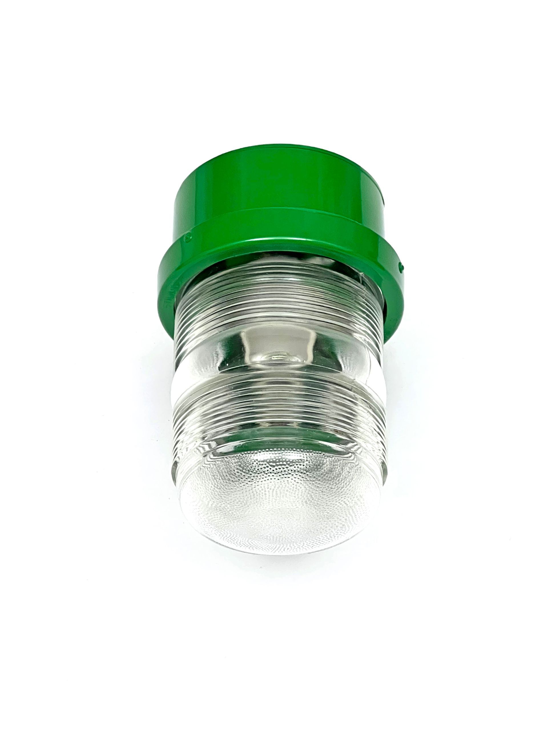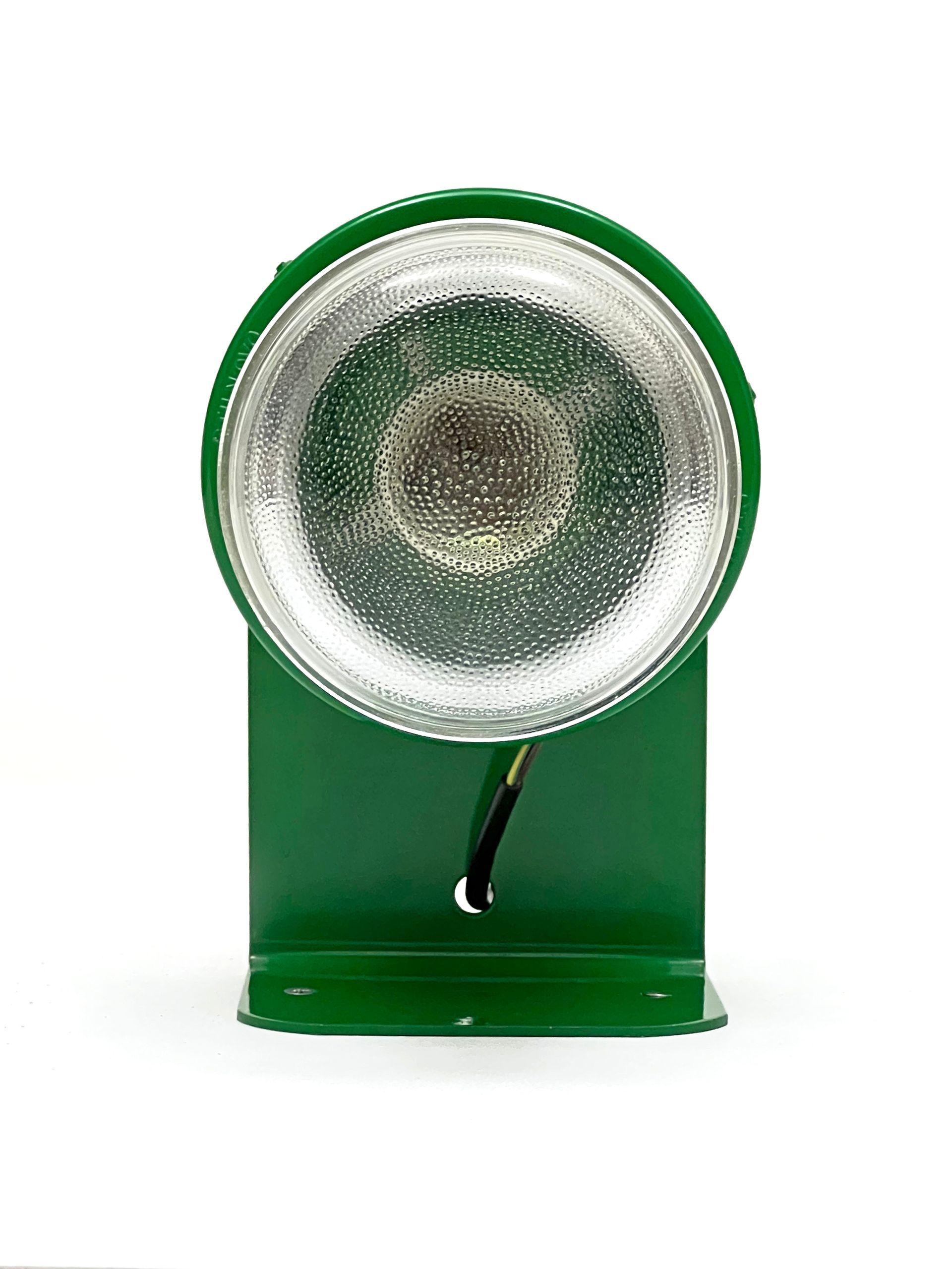 The Stilnovo spotlight is made of enamelled metal and moulded glass, being watertight it can be used both indoors and outdoors. The lamps are reminiscent of Joe Colombo's Fresnell lamps for Oluce. Six lamps are available in green. By adding three feet and a wire with socket and switch, the lamp can become a table or bedside lamp.