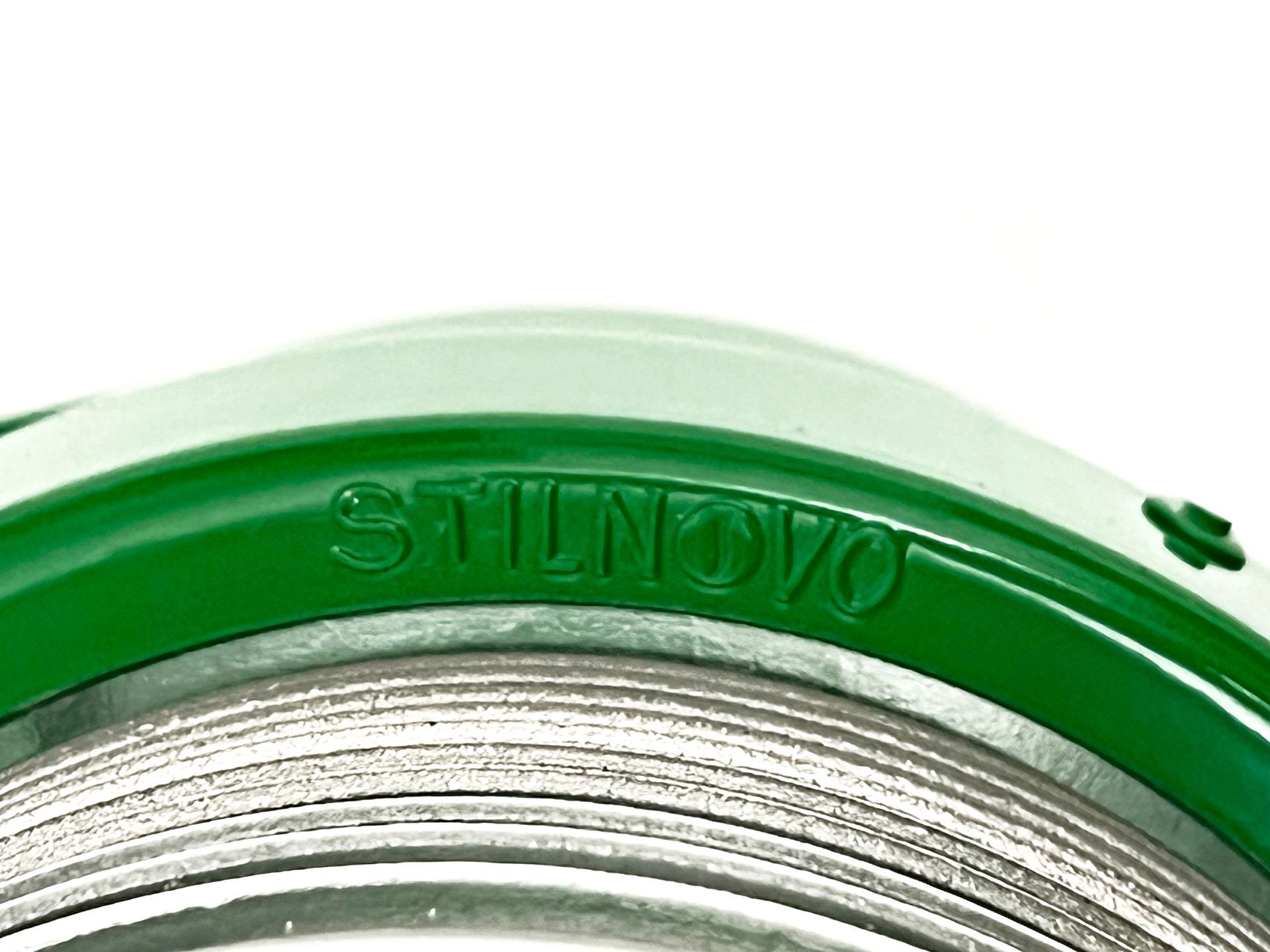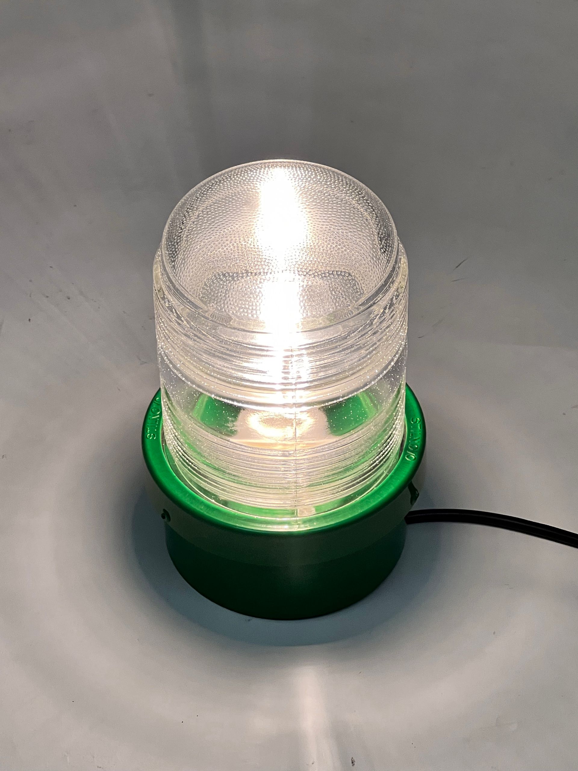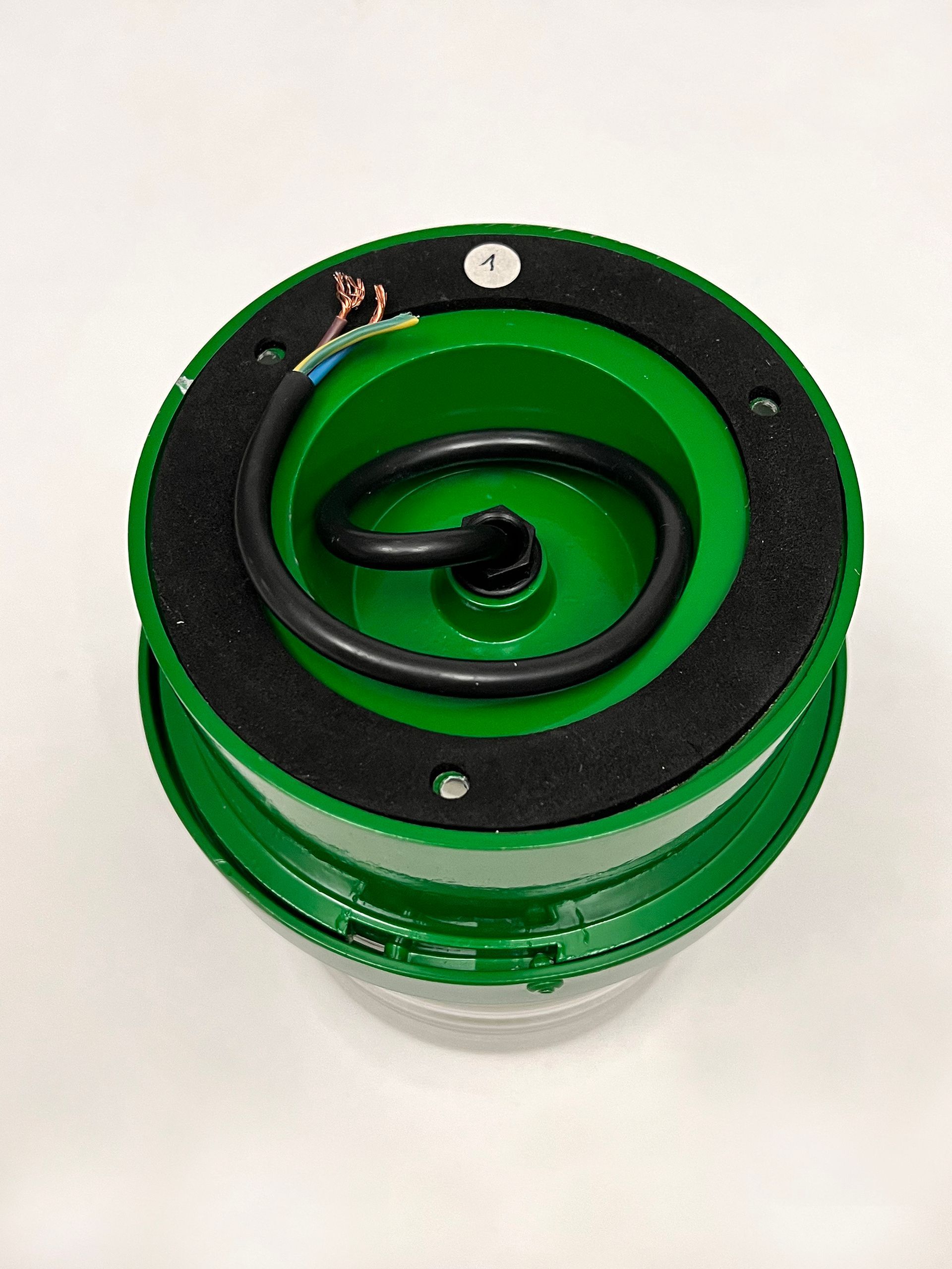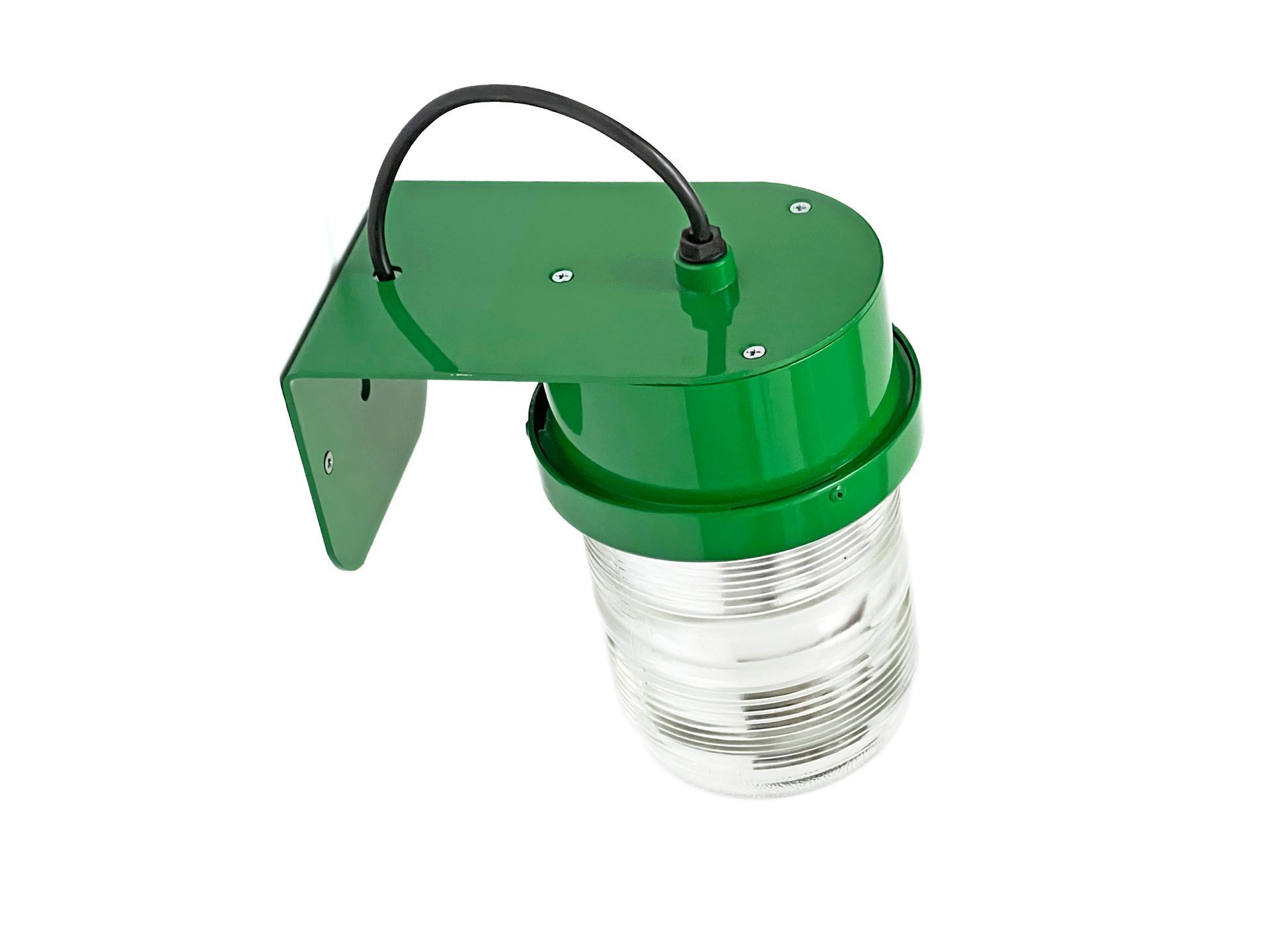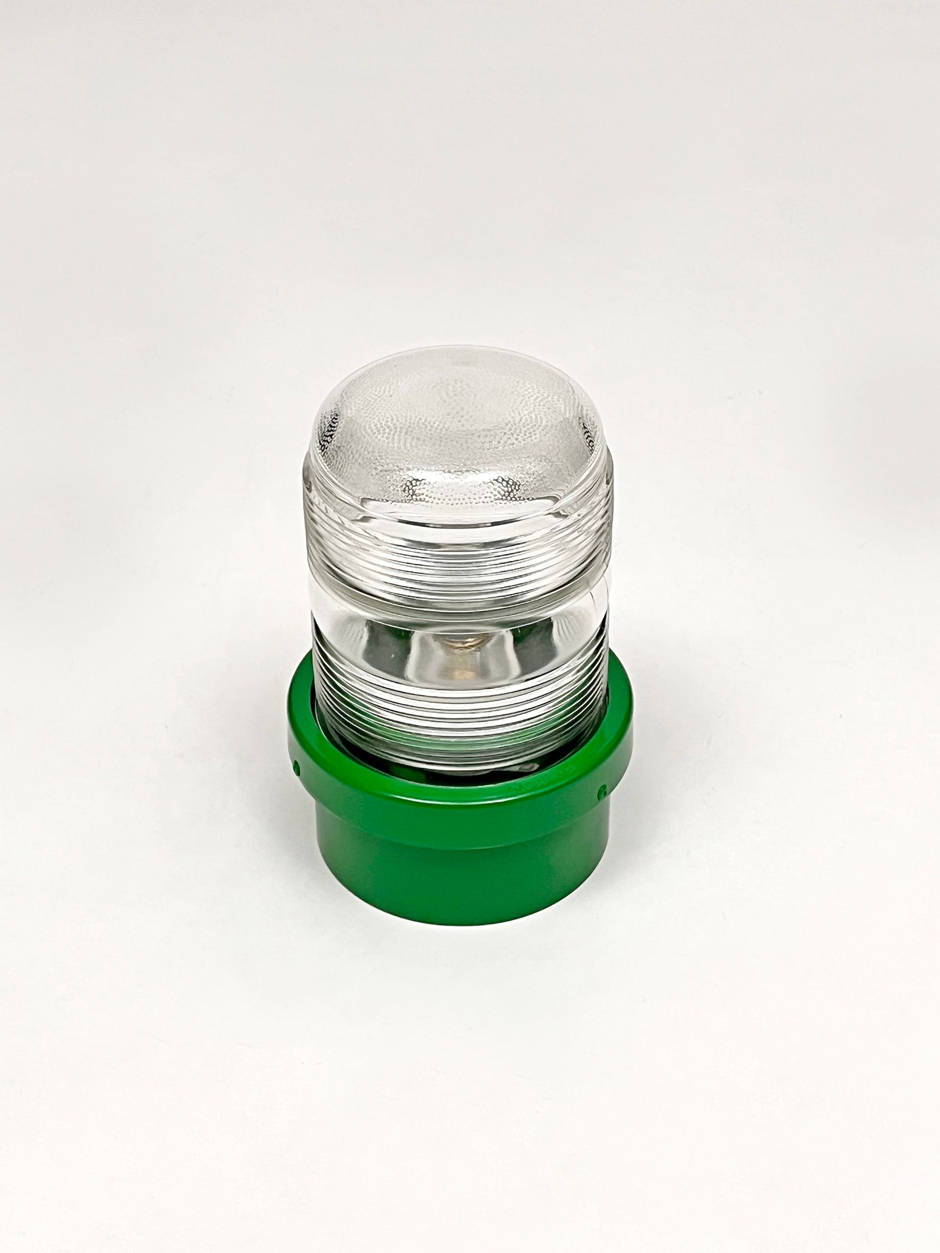 The Stilnovo spotlight is made of enamelled metal and moulded glass, being watertight it can be used both indoors and outdoors. The lamps are reminiscent of Joe Colombo's Fresnell lamps for Oluce. Six lamps are available in green. By adding three feet and a wire with socket and switch, the lamp can become a table or bedside lamp.