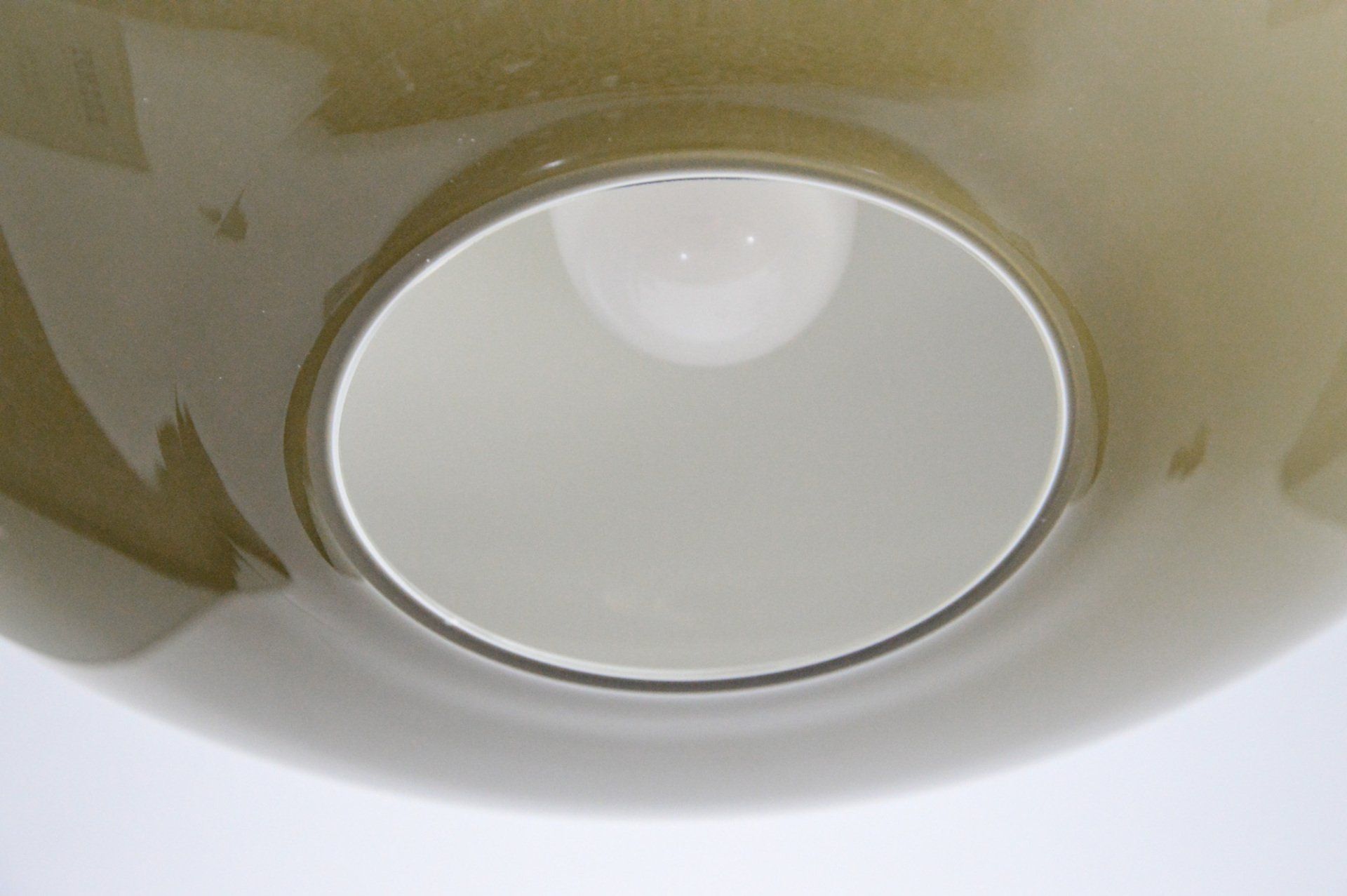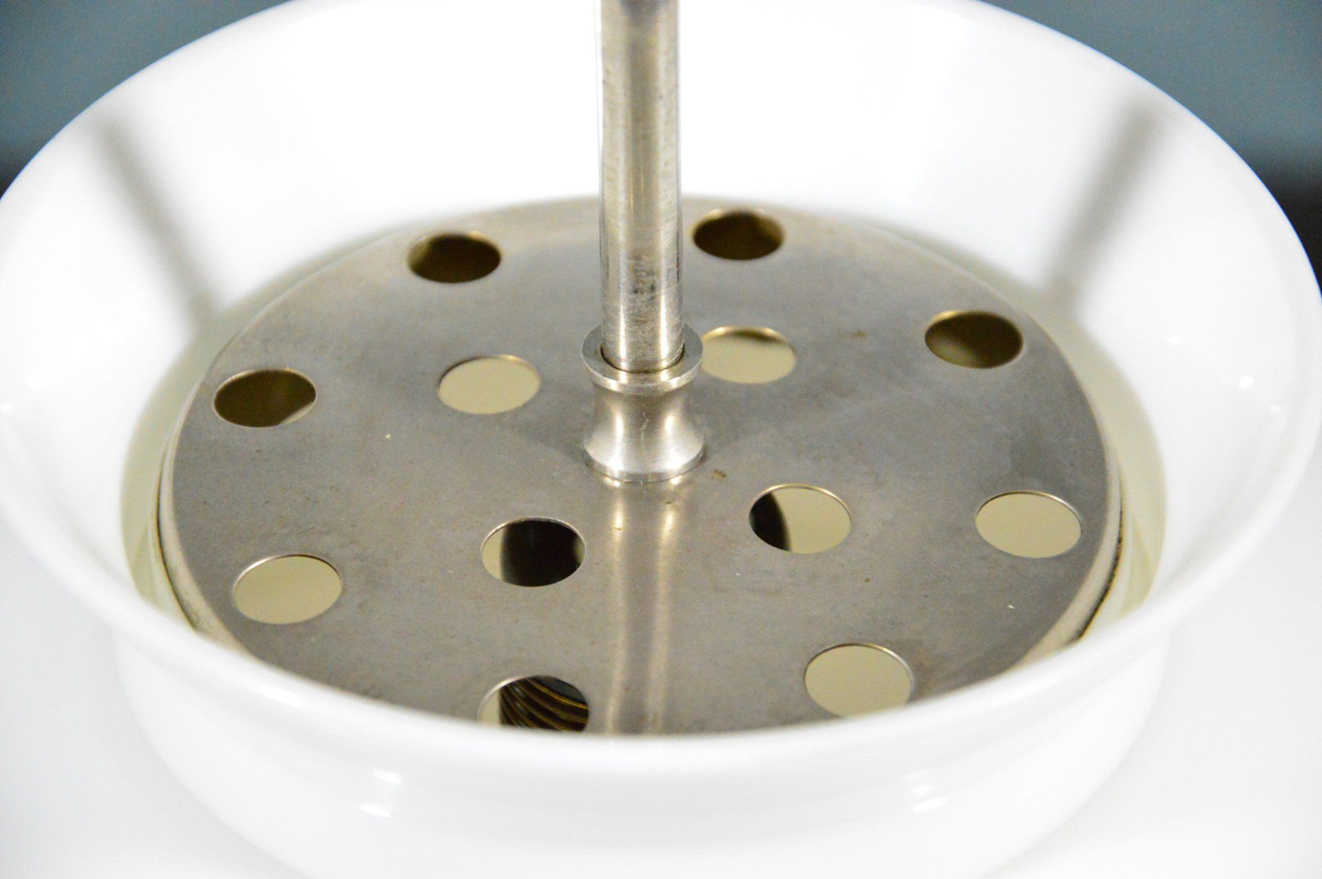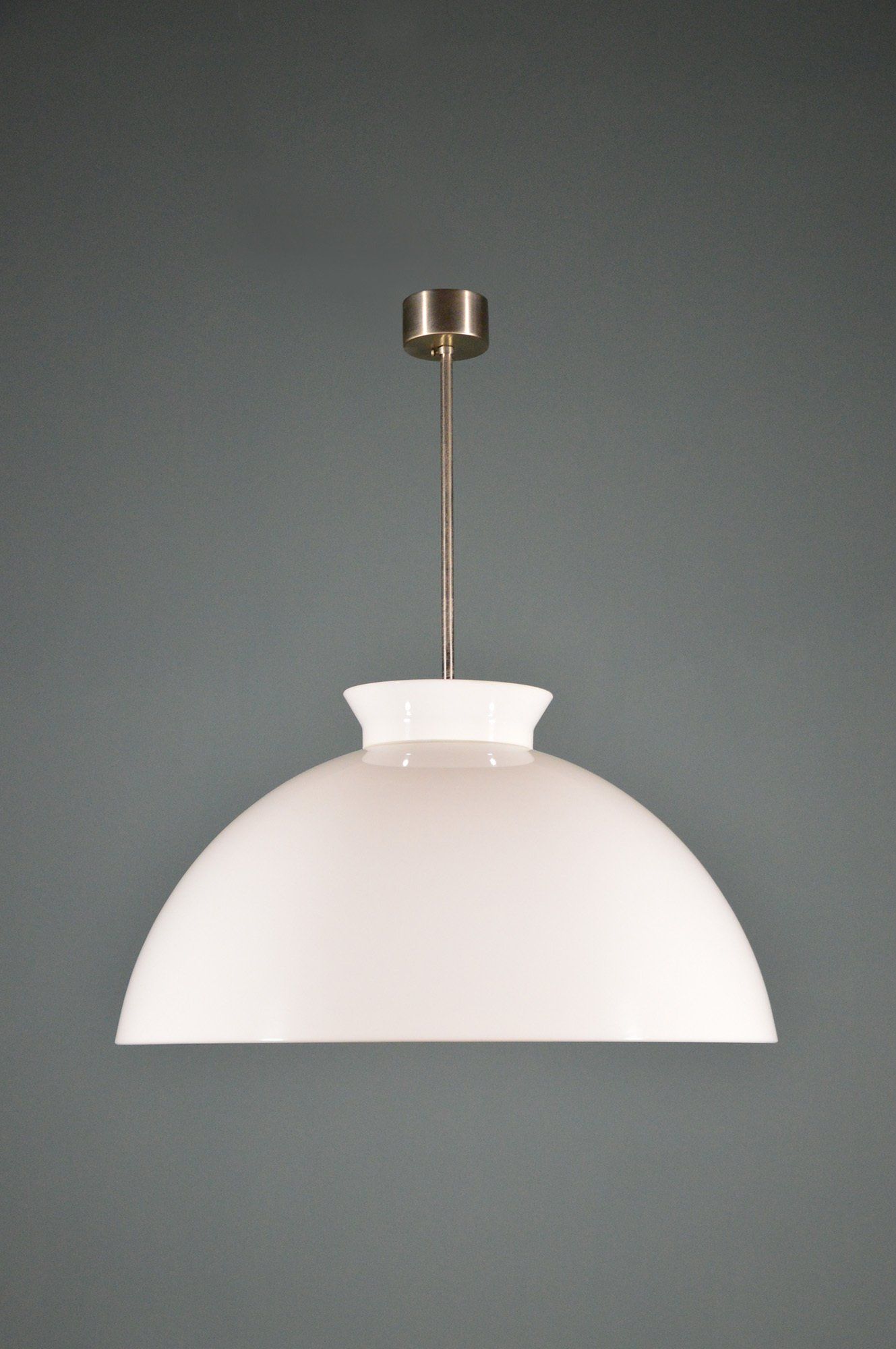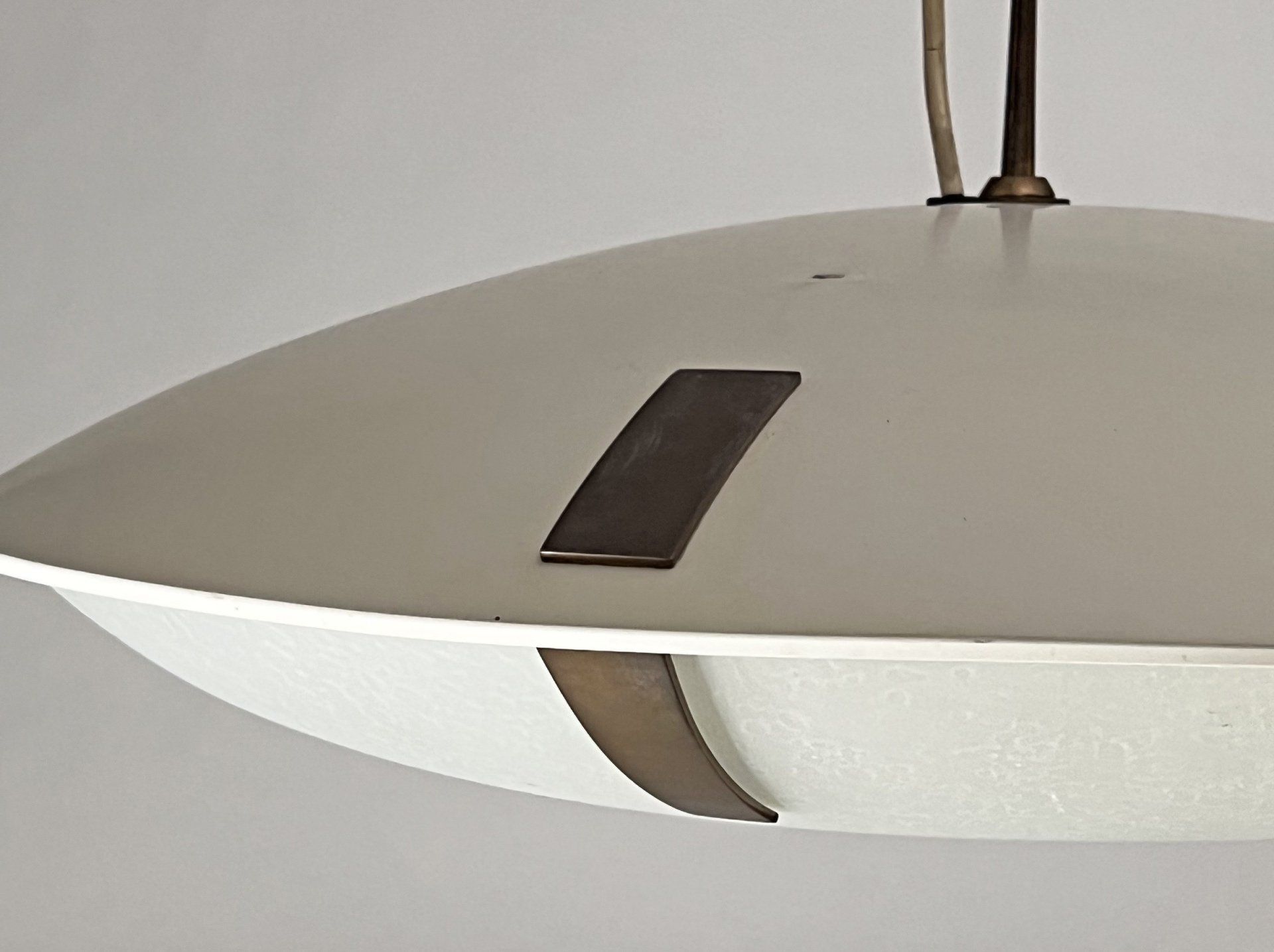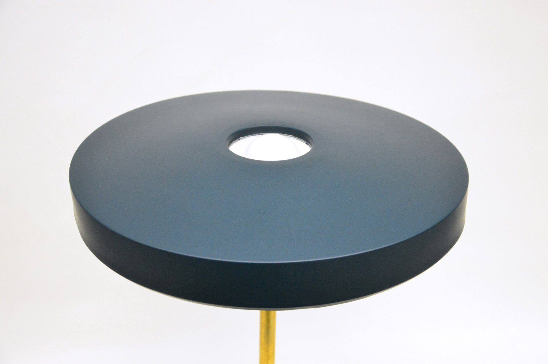 The two caps are joined by the beautiful detail of the three brass joints that cross the enamelled metal cap supporting the glass cap, creating a beautiful contrast between the materials.