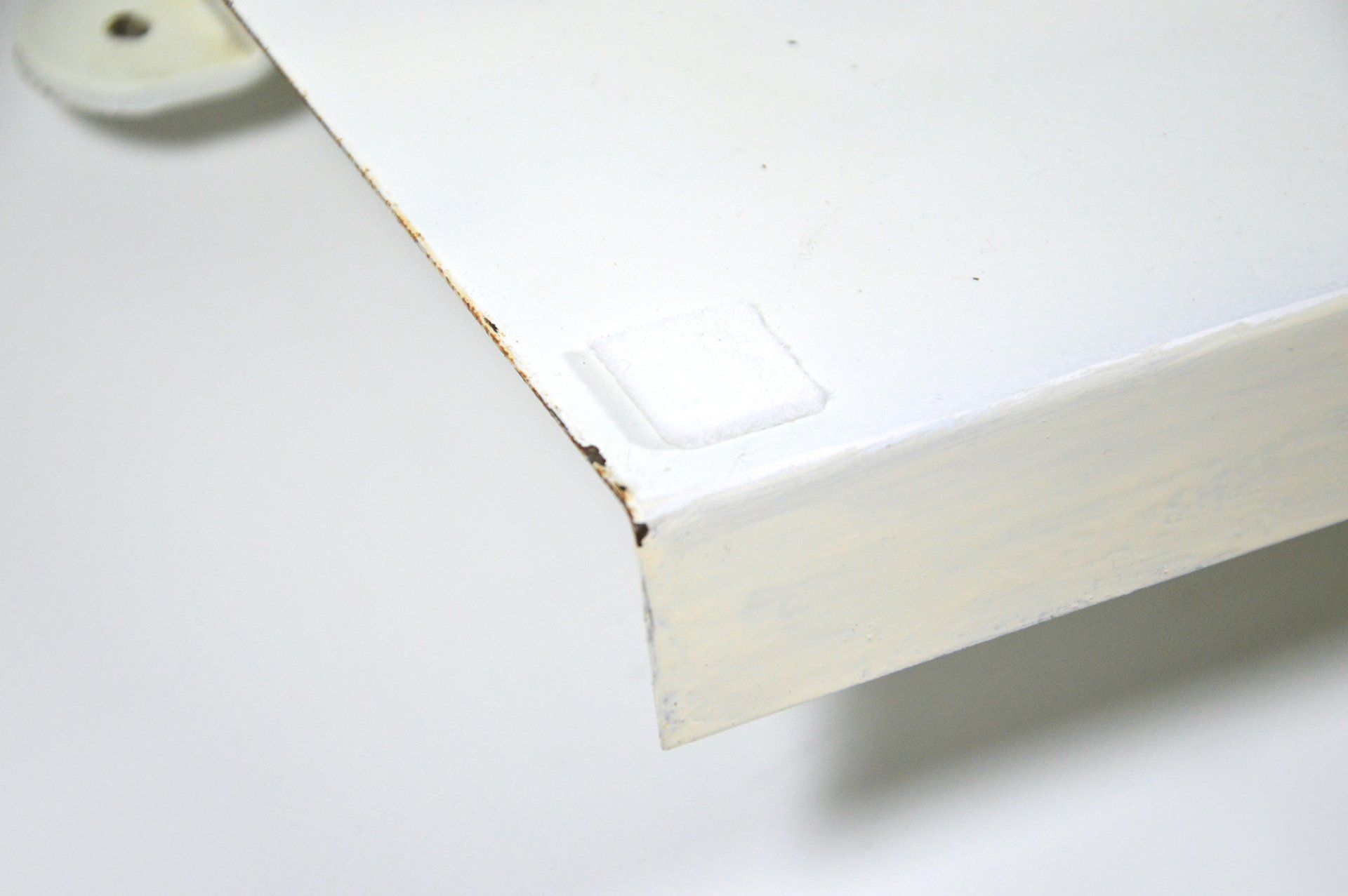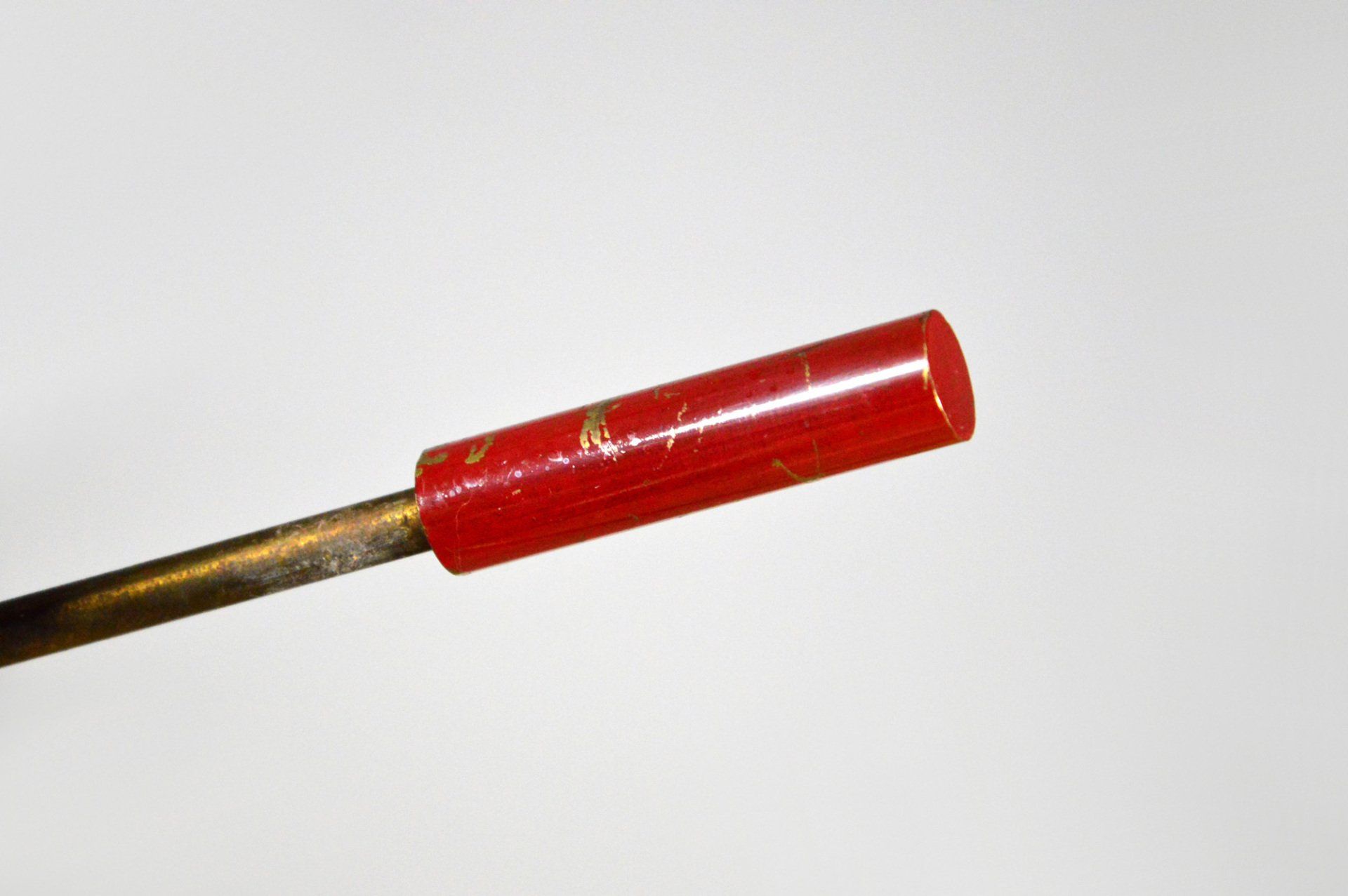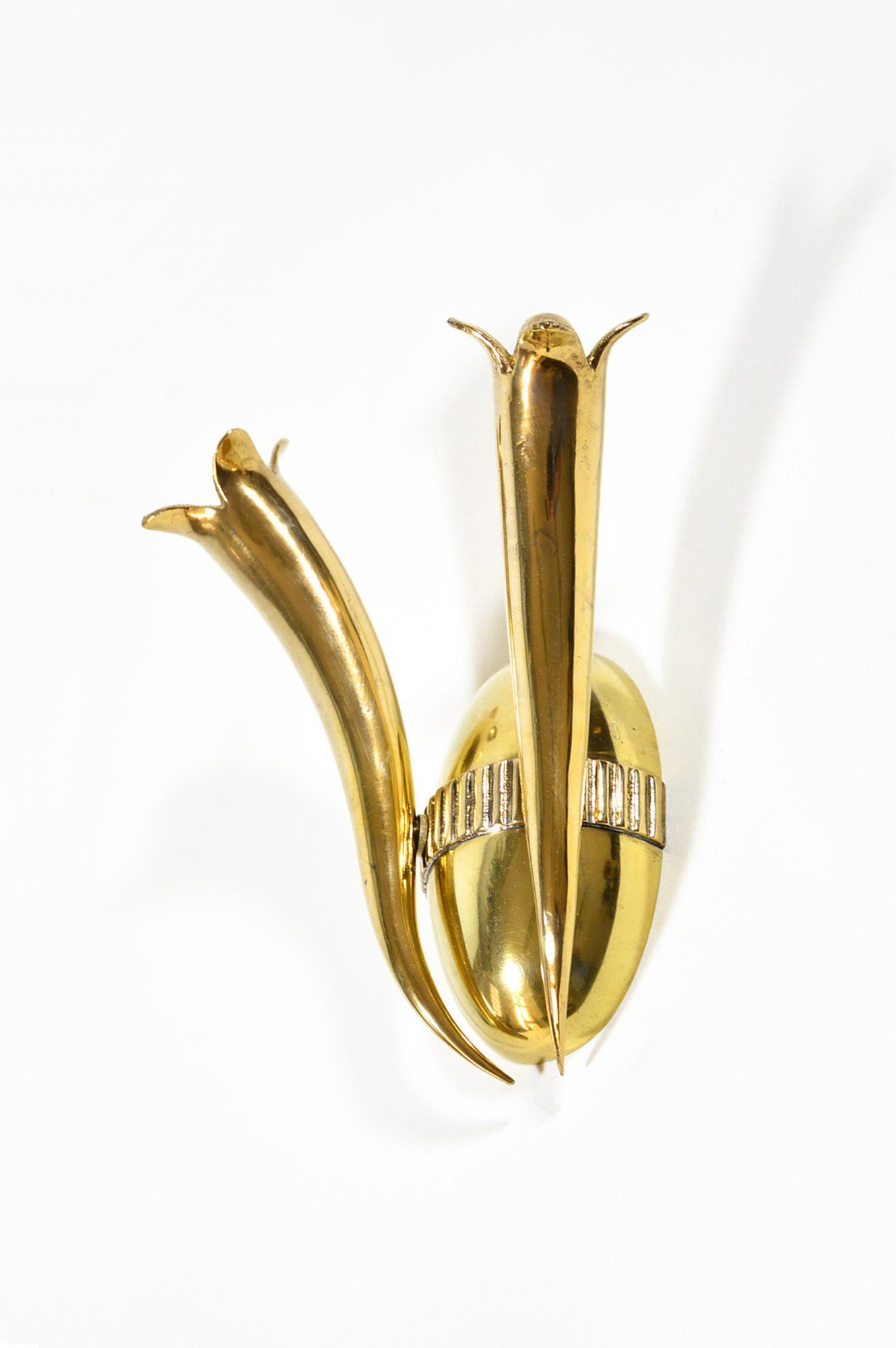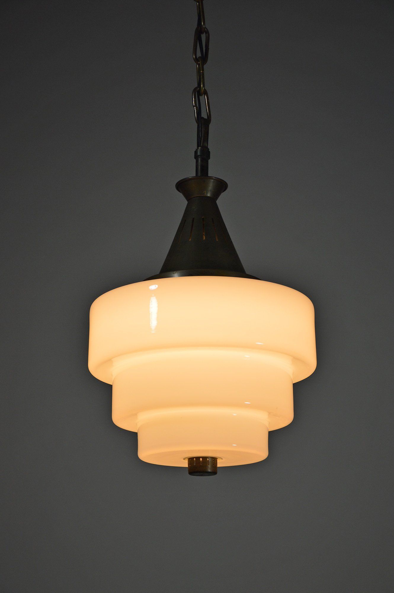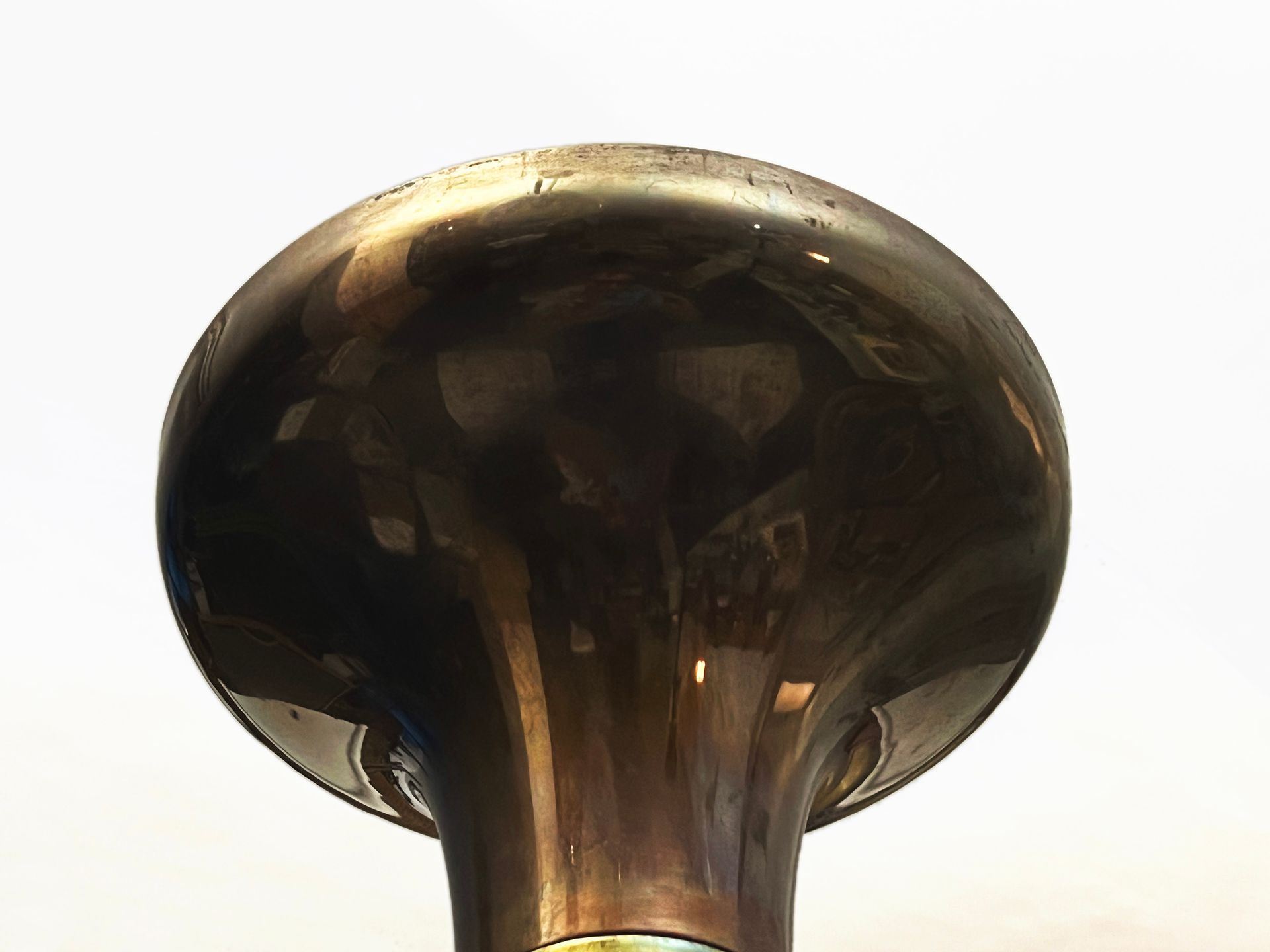 The two caps are joined by the beautiful detail of the three brass joints that cross the enamelled metal cap supporting the glass cap, creating a beautiful contrast between the materials.