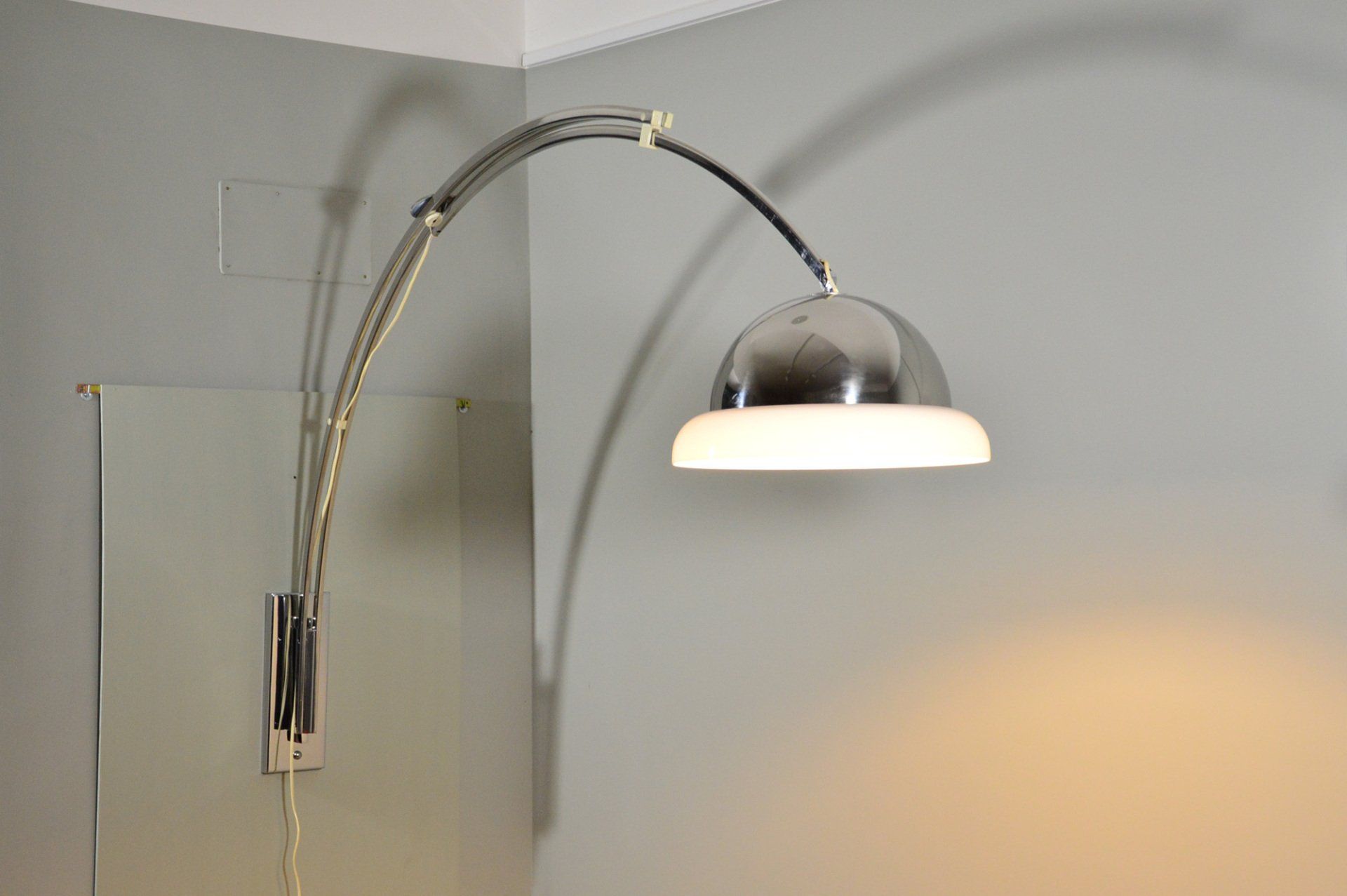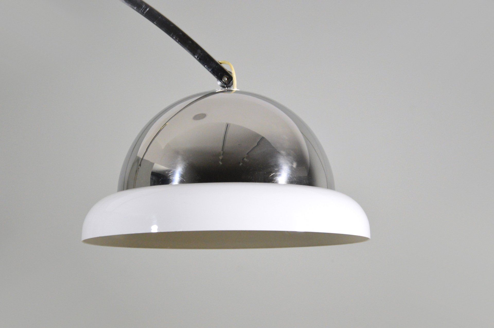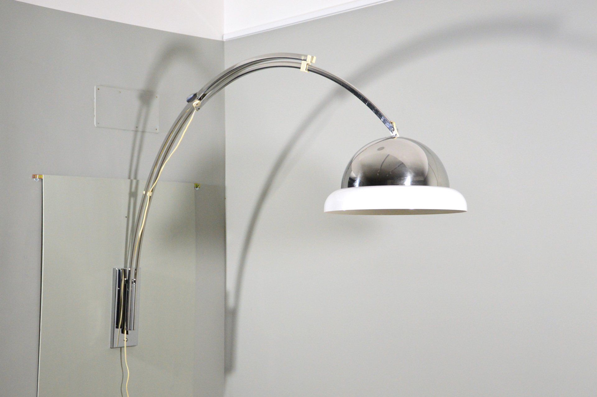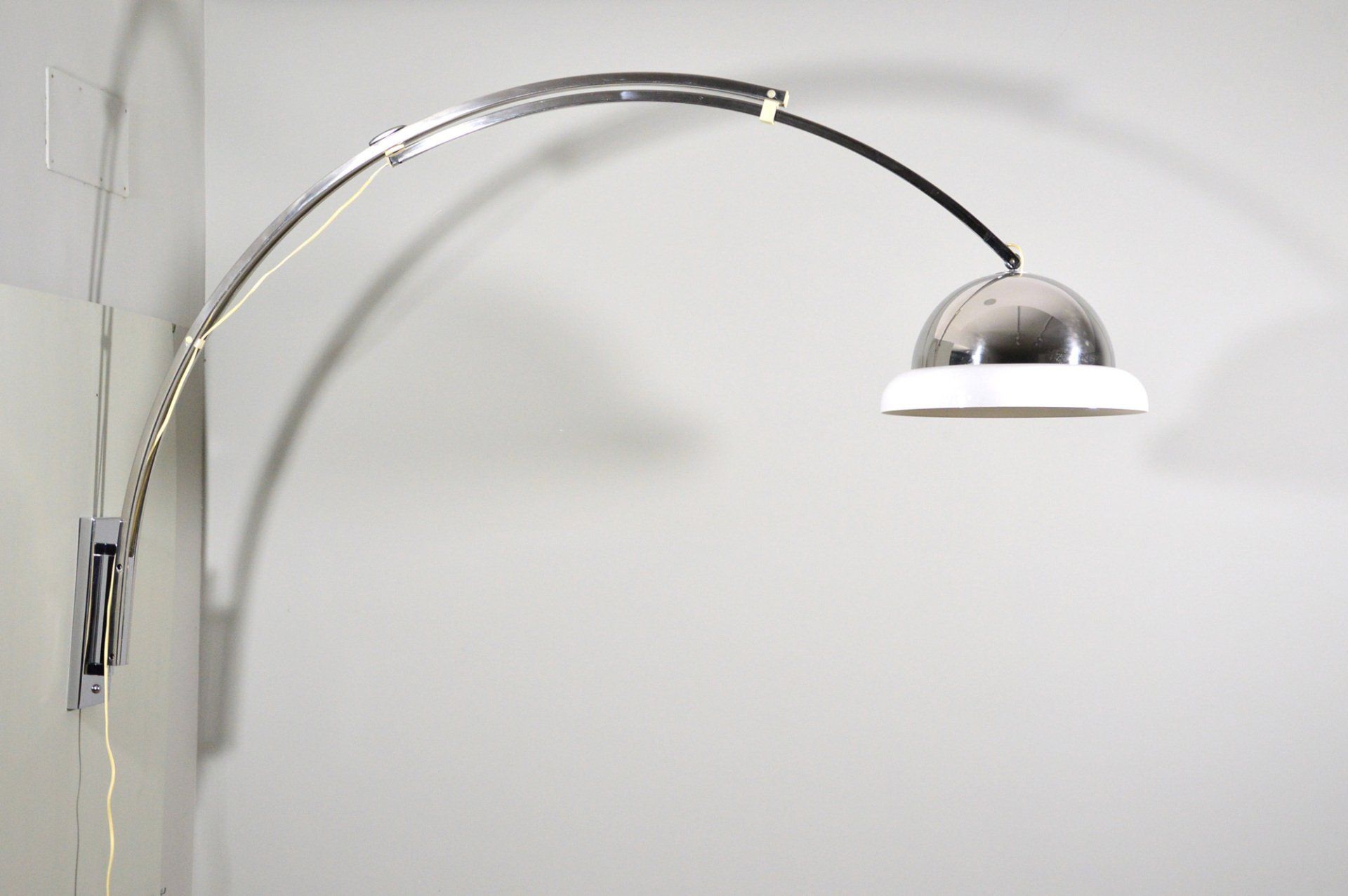 Unusual arc wall lamp in chromed metal, designed and produced by Goffredo Reggiani in the 60s. The white methacrylate ring that crowns the reflector illuminates diffusing the light. In very good condition, some slight scratches on the chrome parts, but nothing particularly disturbing - H100.0 x ø40.0 cm -