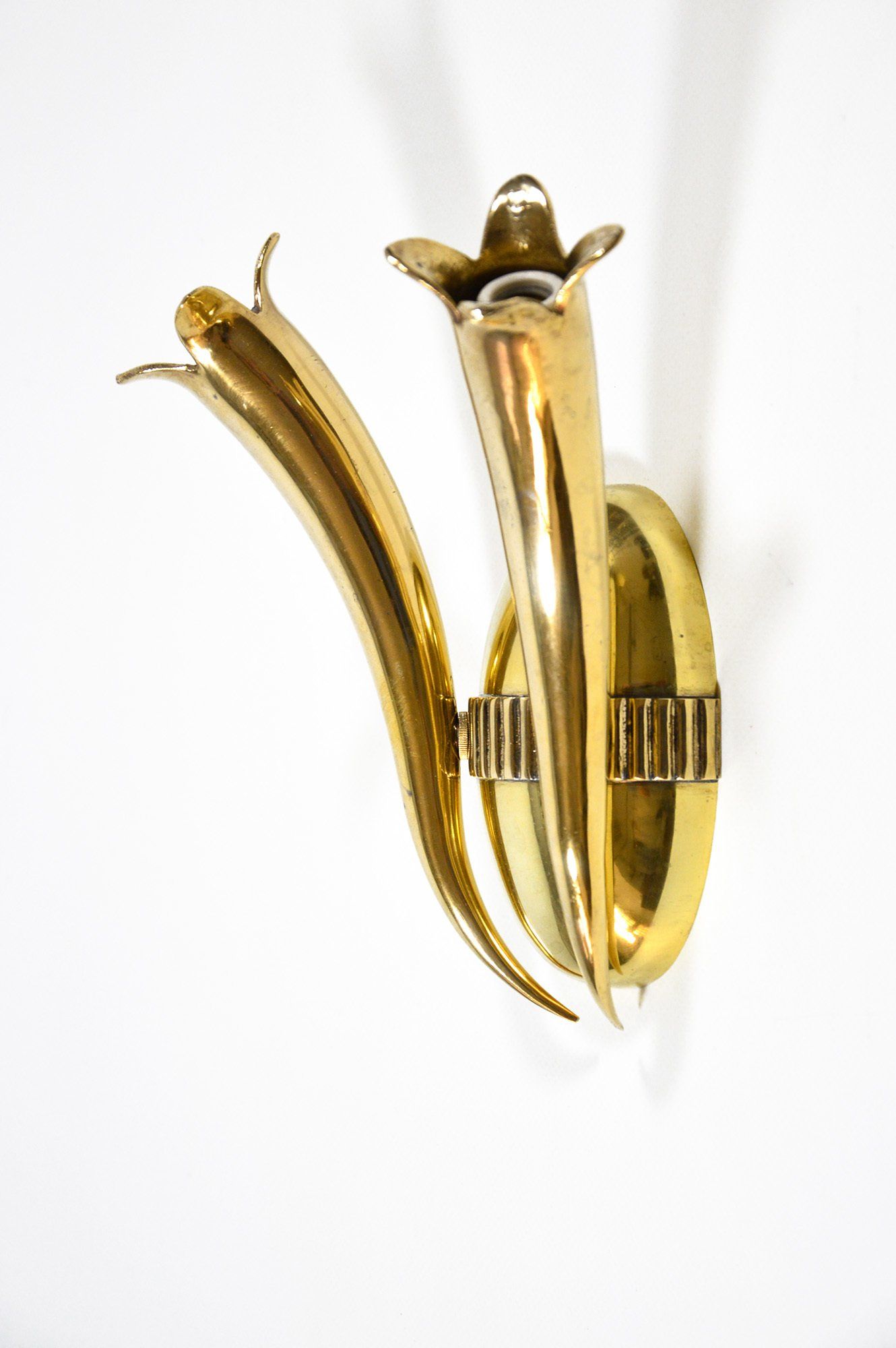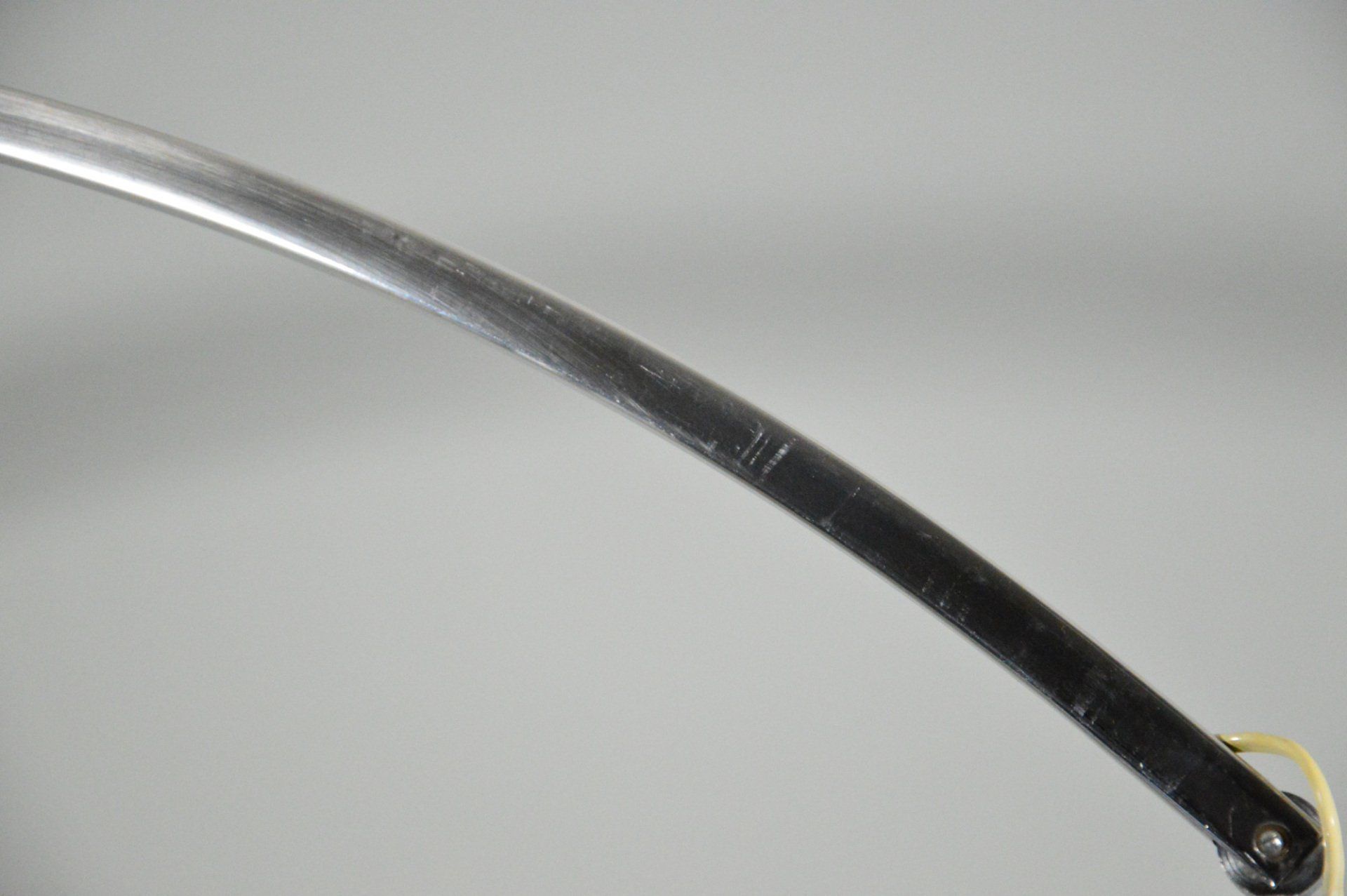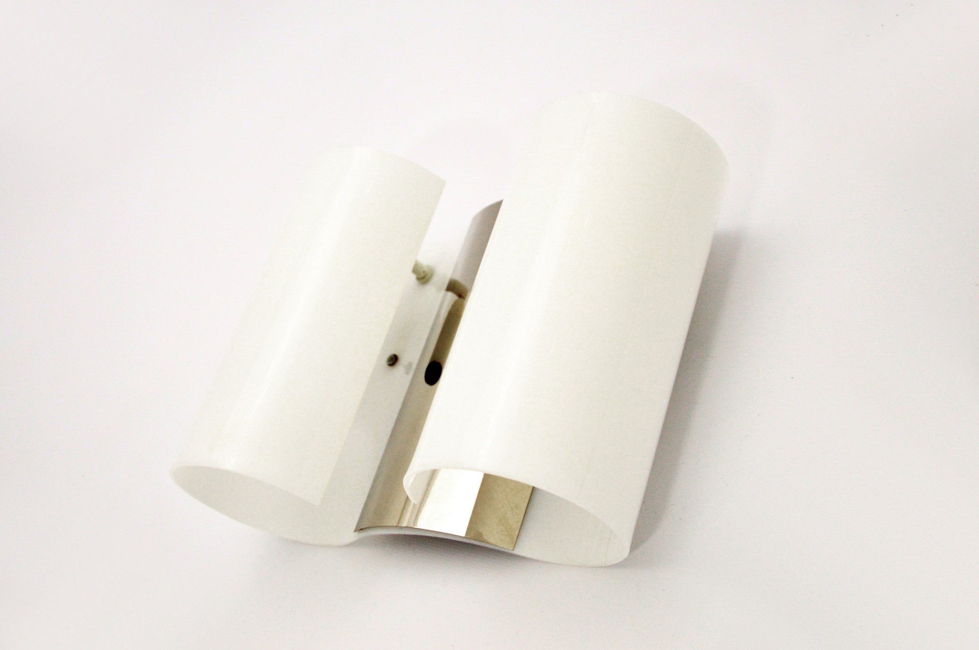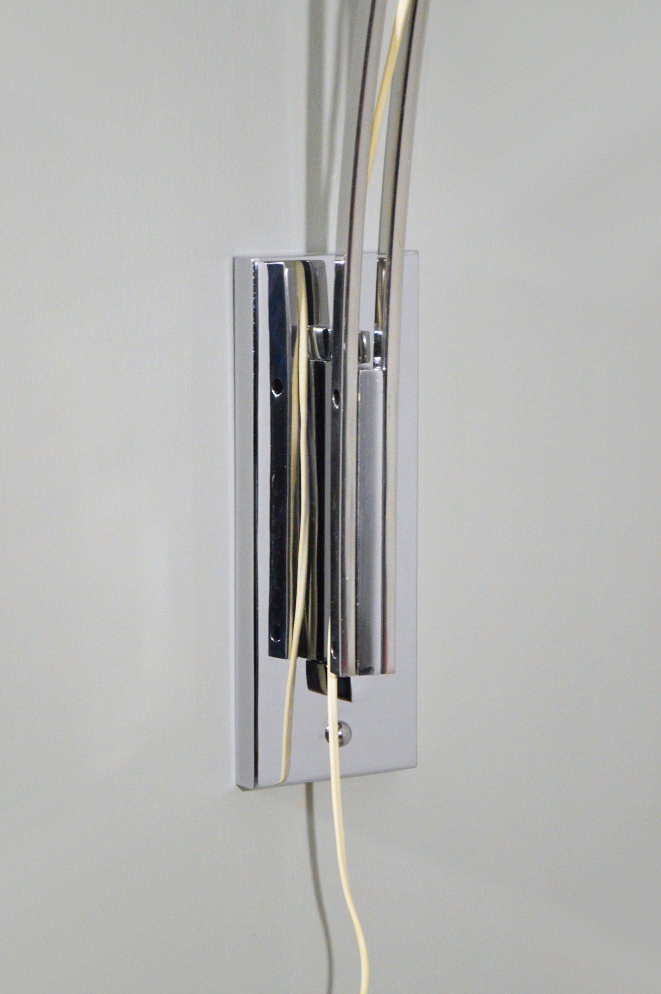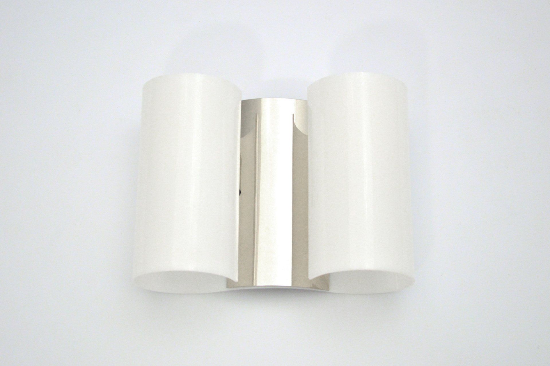 Unusual arc wall lamp in chromed metal, designed and produced by Goffredo Reggiani in the 60s. The white methacrylate ring that crowns the reflector illuminates diffusing the light. In very good condition, some slight scratches on the chrome parts, but nothing particularly disturbing - H100.0 x ø40.0 cm -