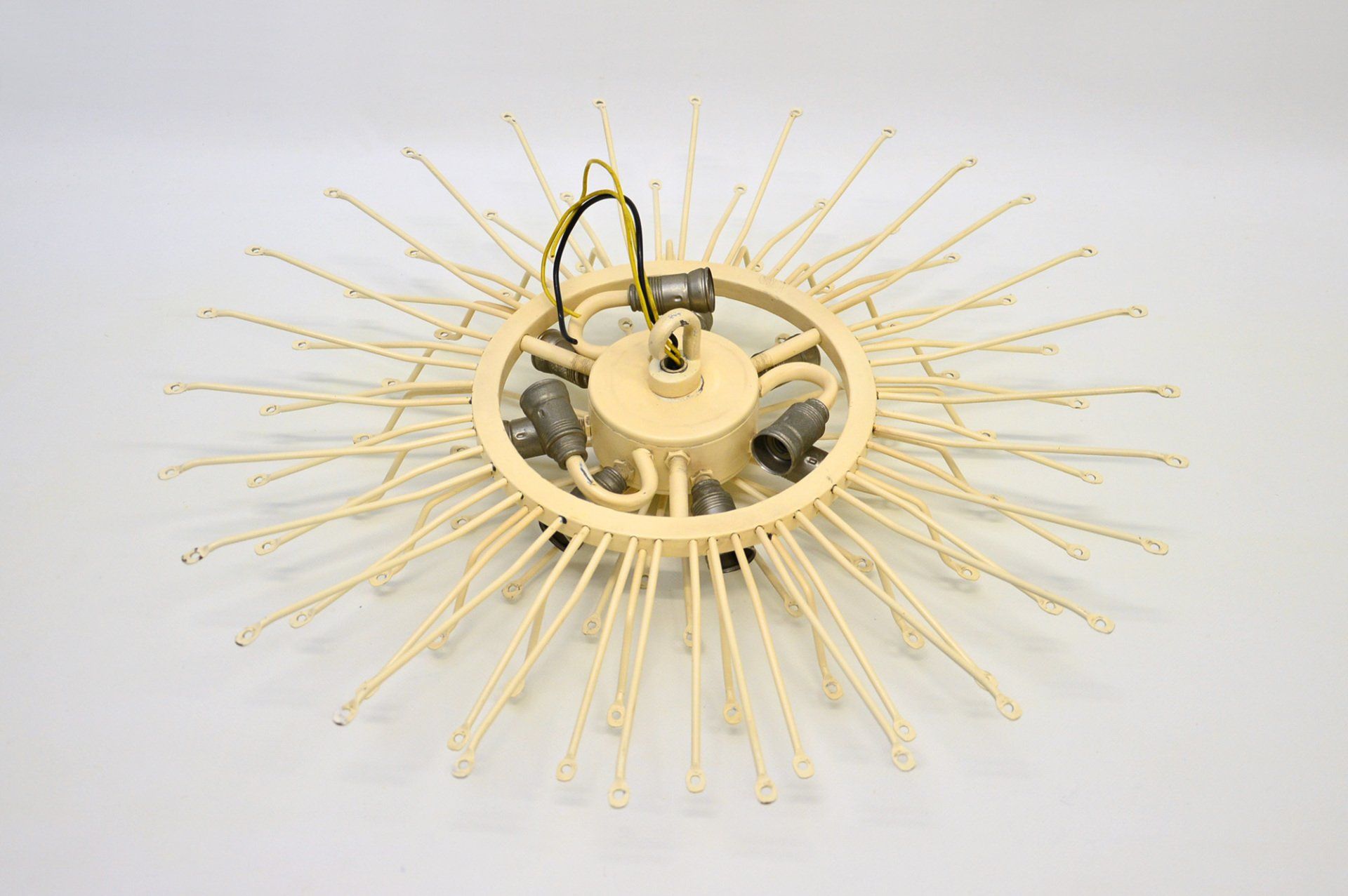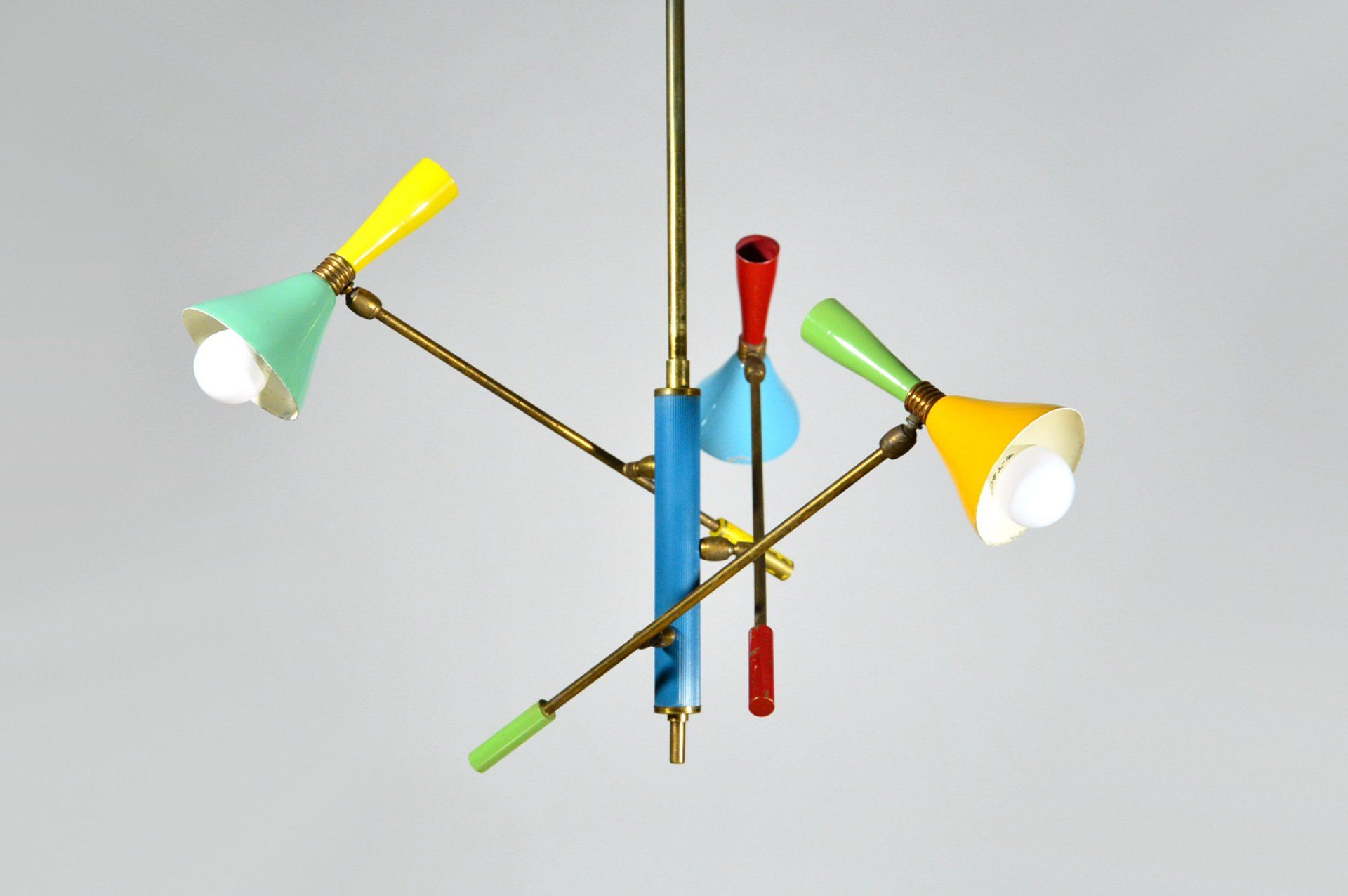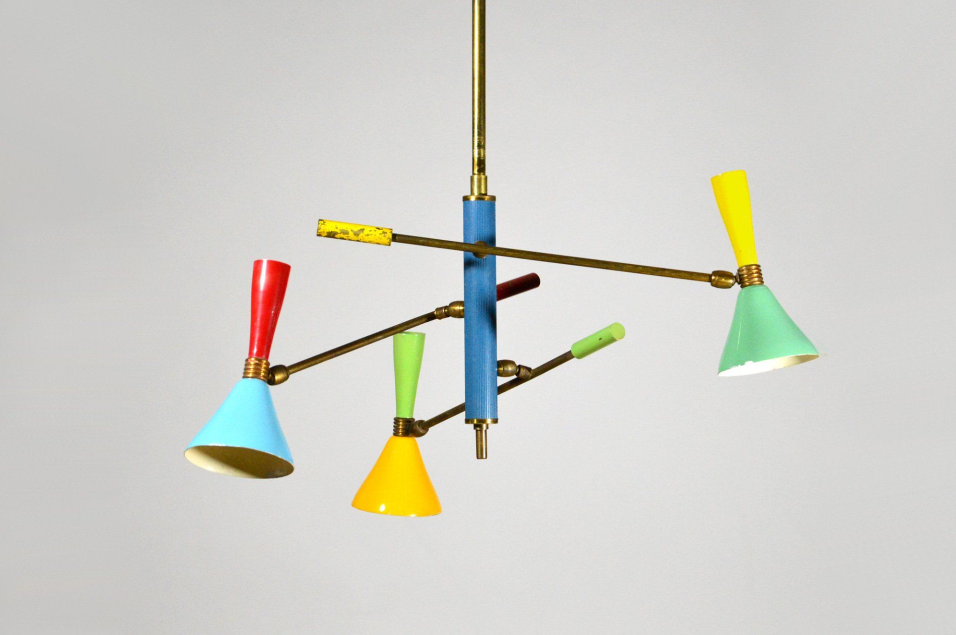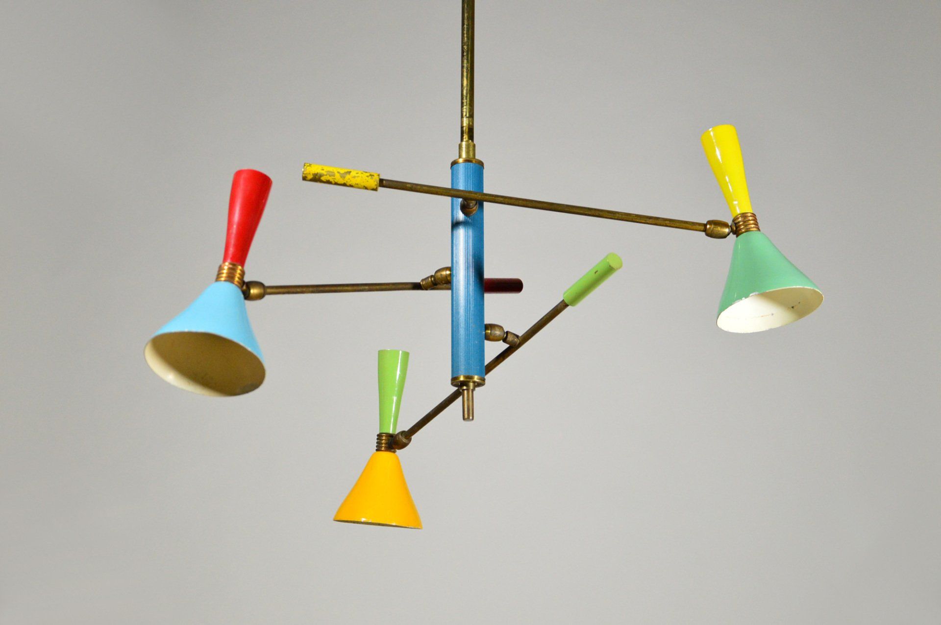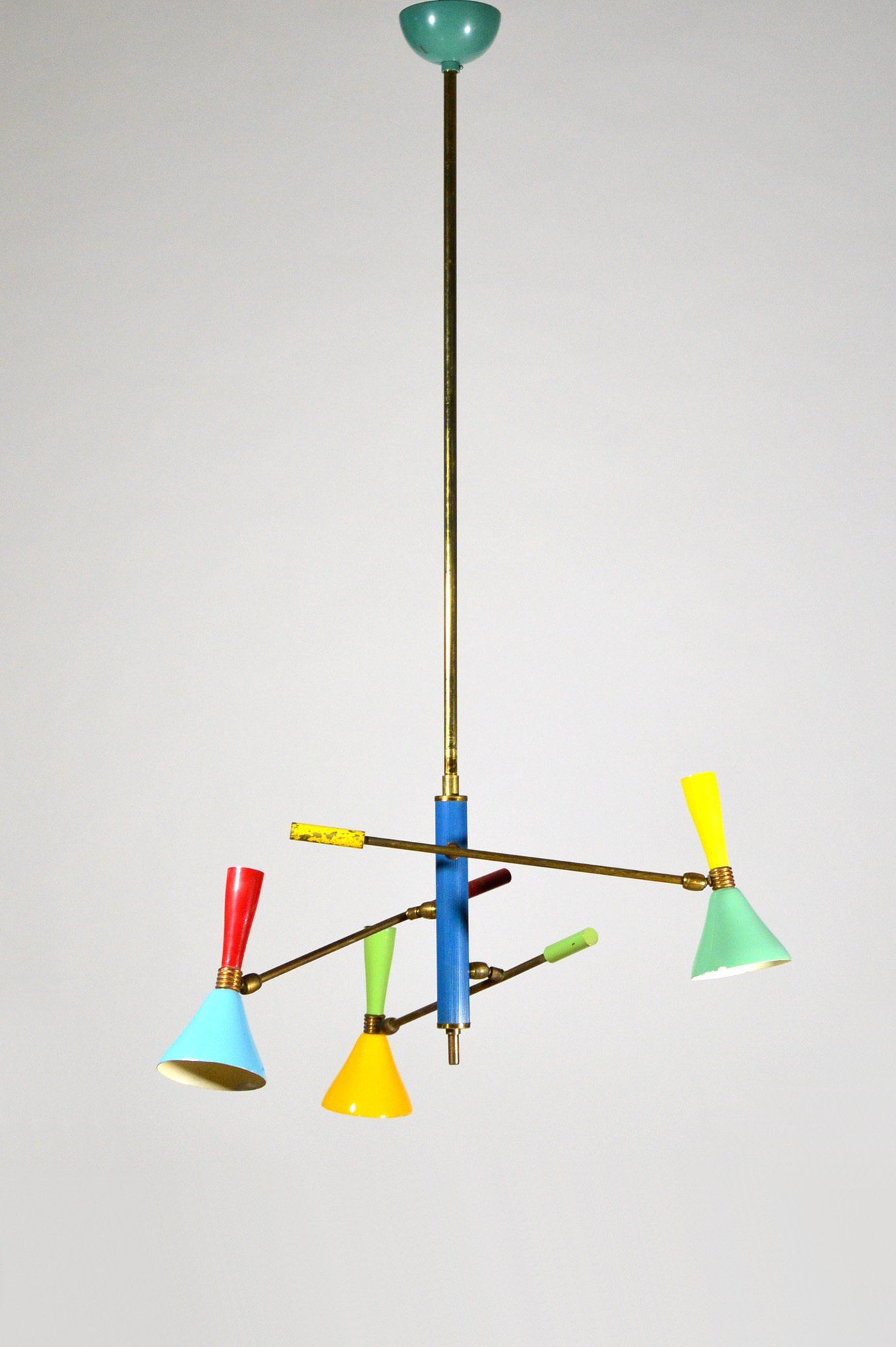 Angelo Lelii founded the Arredoluce company in the post-war period, producing and designing lamps of high design and construction quality. The chandelier is in excellent original condition. The ceiling attachment cup is oxidised in an irregular manner - cm 60øx127h -