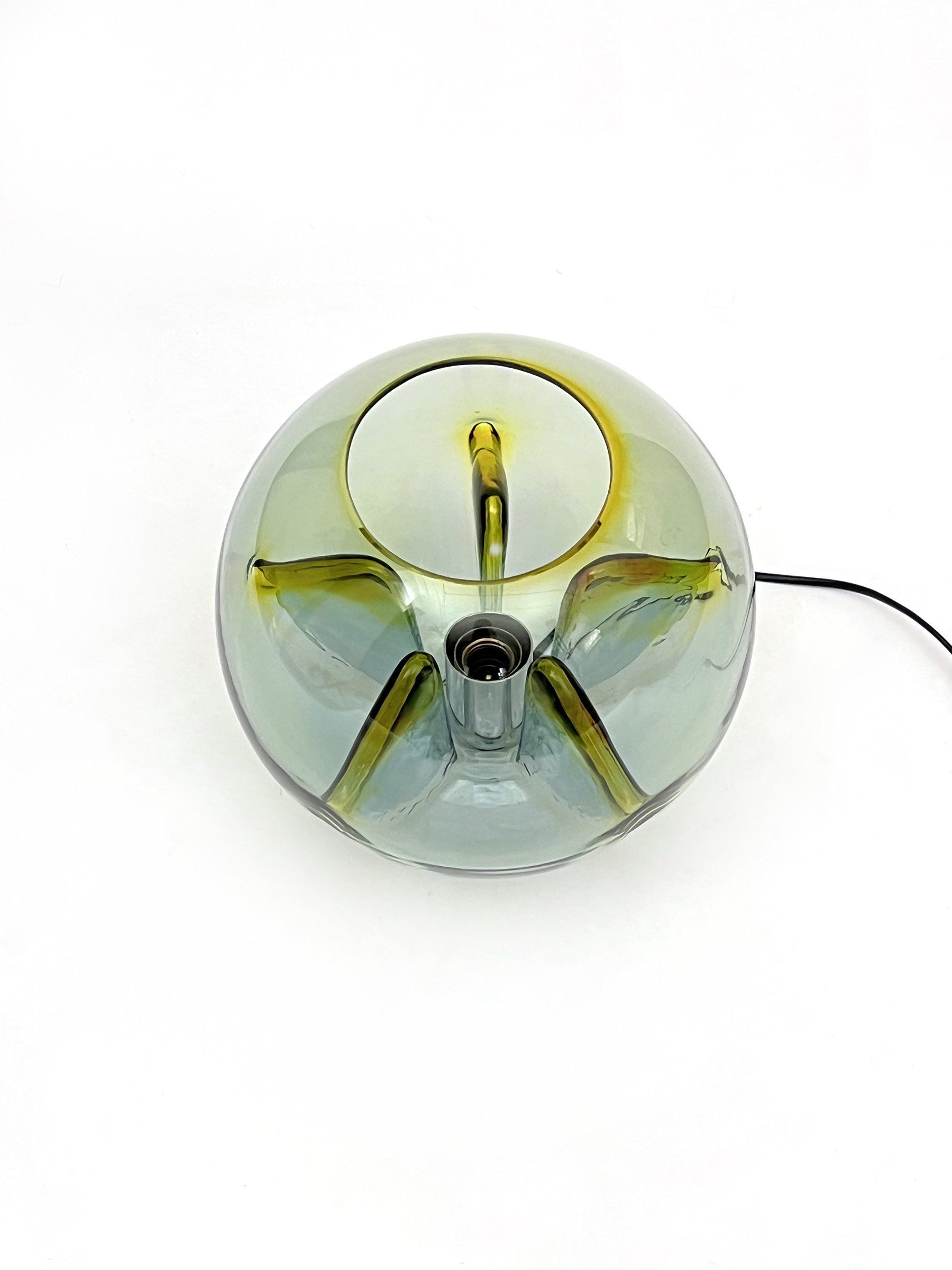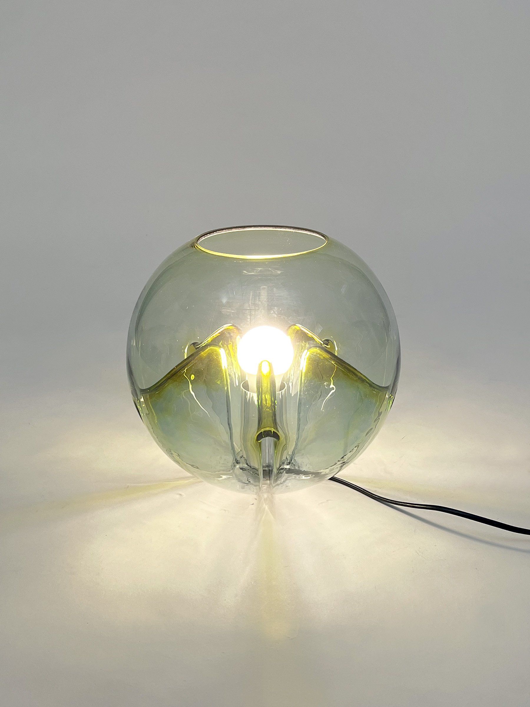 A spectacular Murano glass table lamp designed by Toni Zuccheri for VeArt, formed by a sphere with folds going inwards.