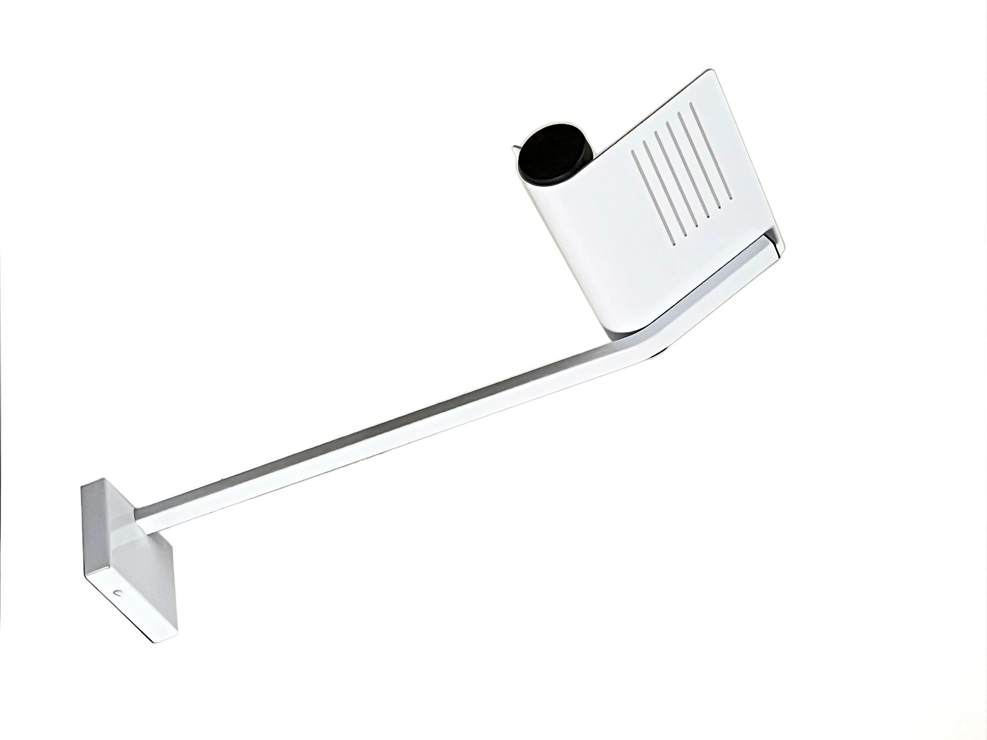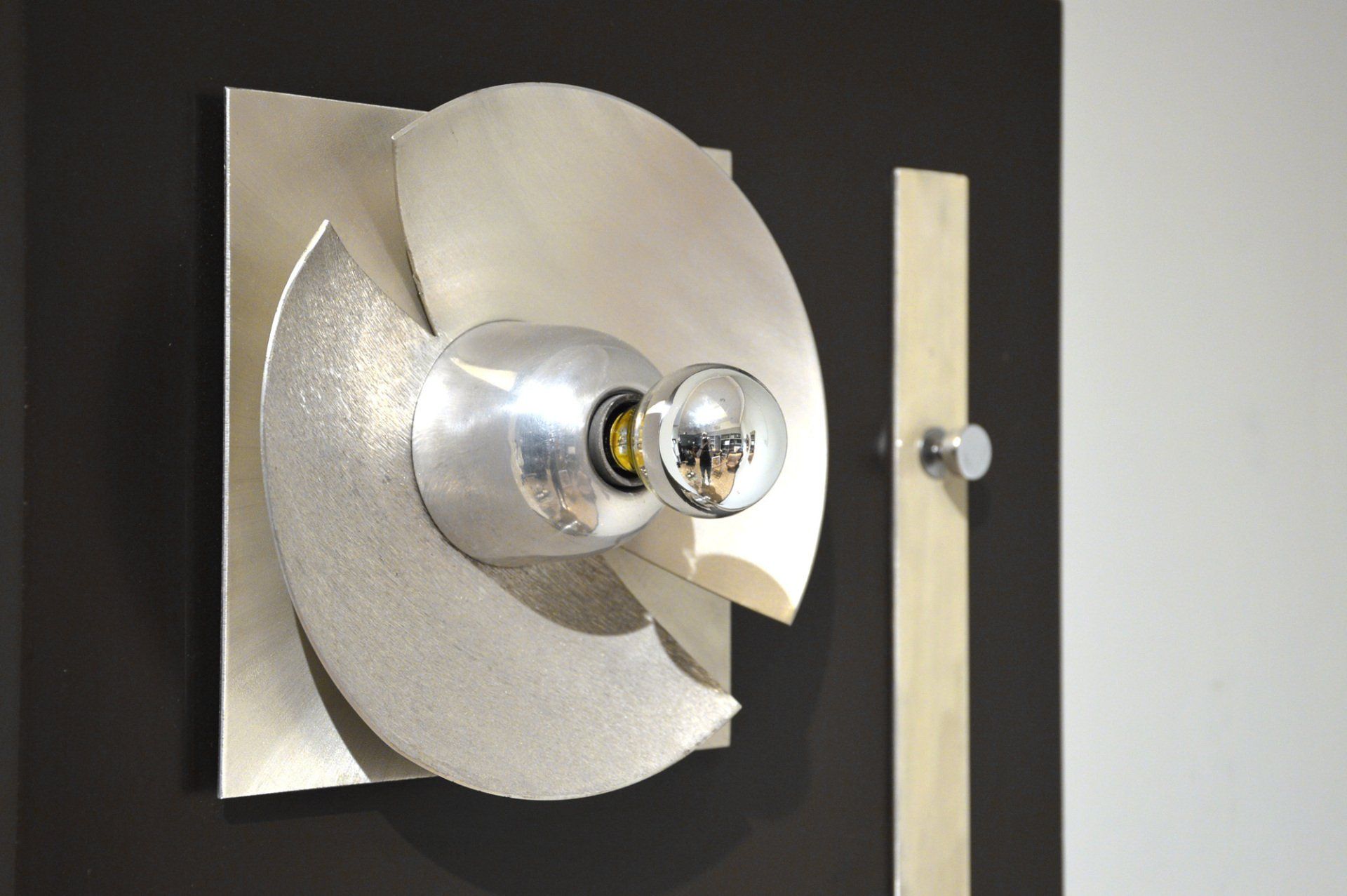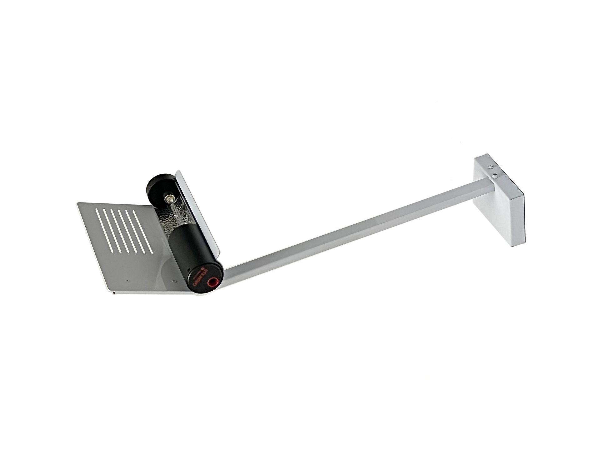 The lamps are reminiscent of Joe Colombo's Fresnell lamps for Oluce. In this version the spotlight has a wall mounting bracket that allows vertical orientation.