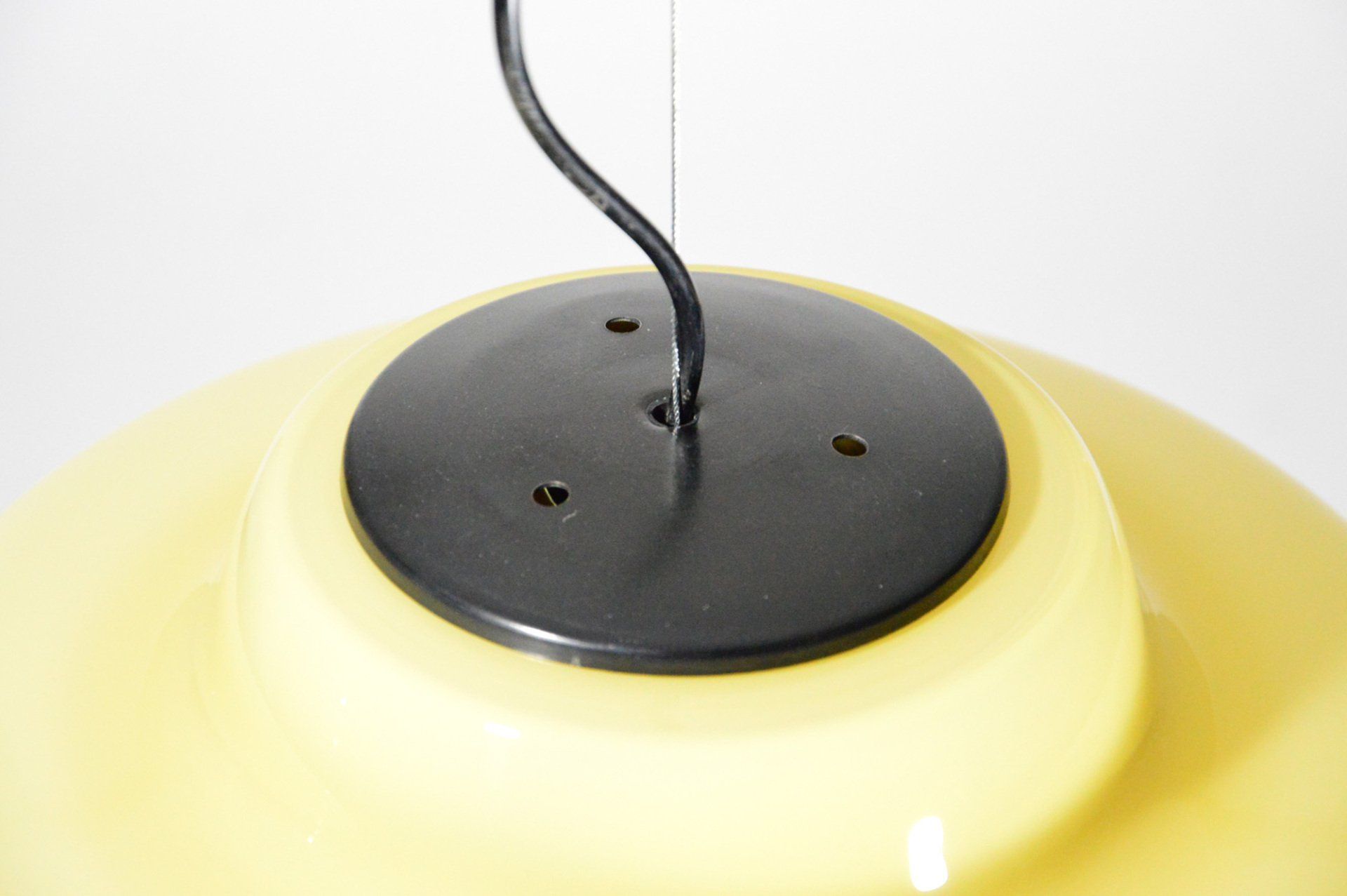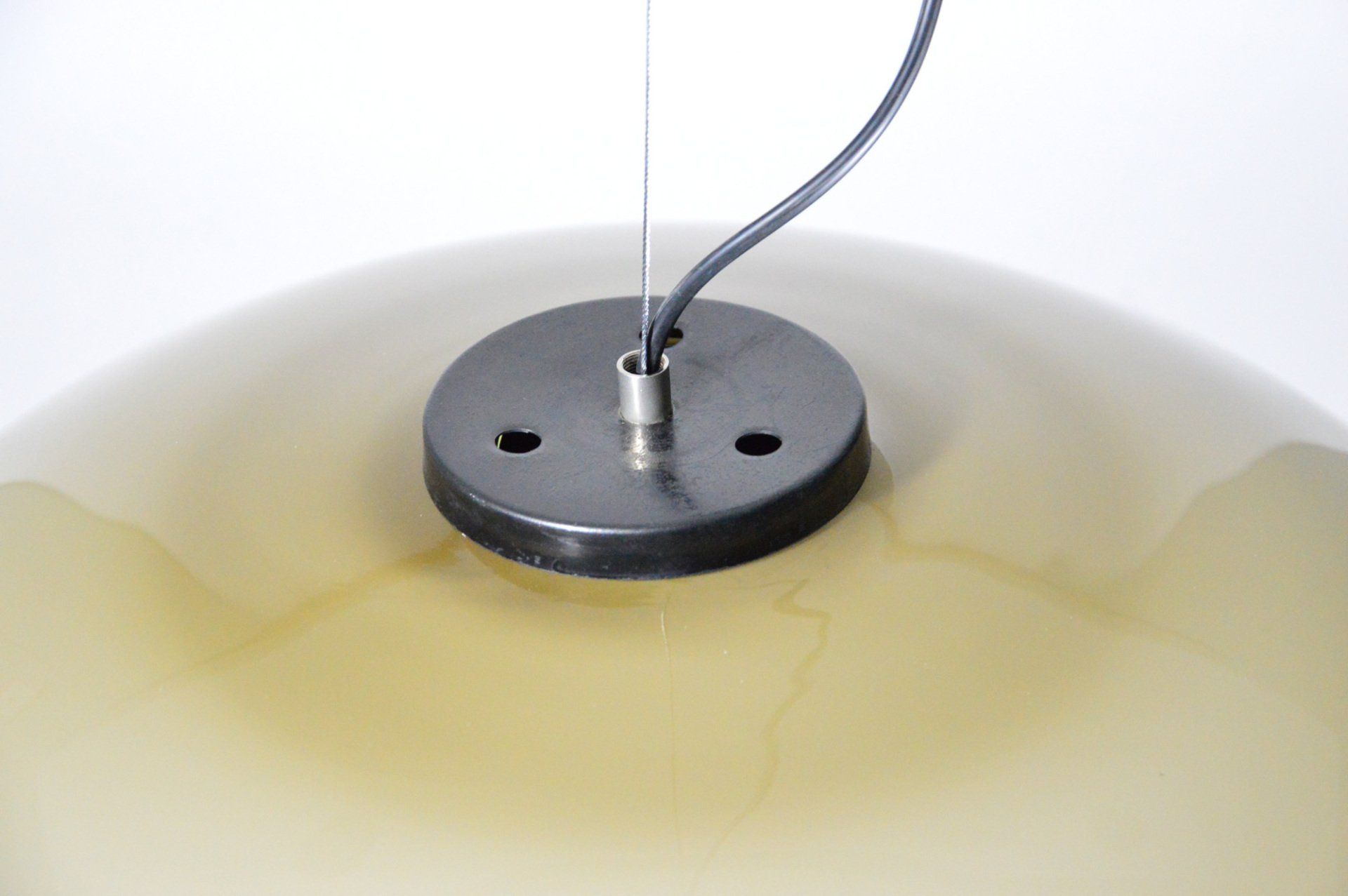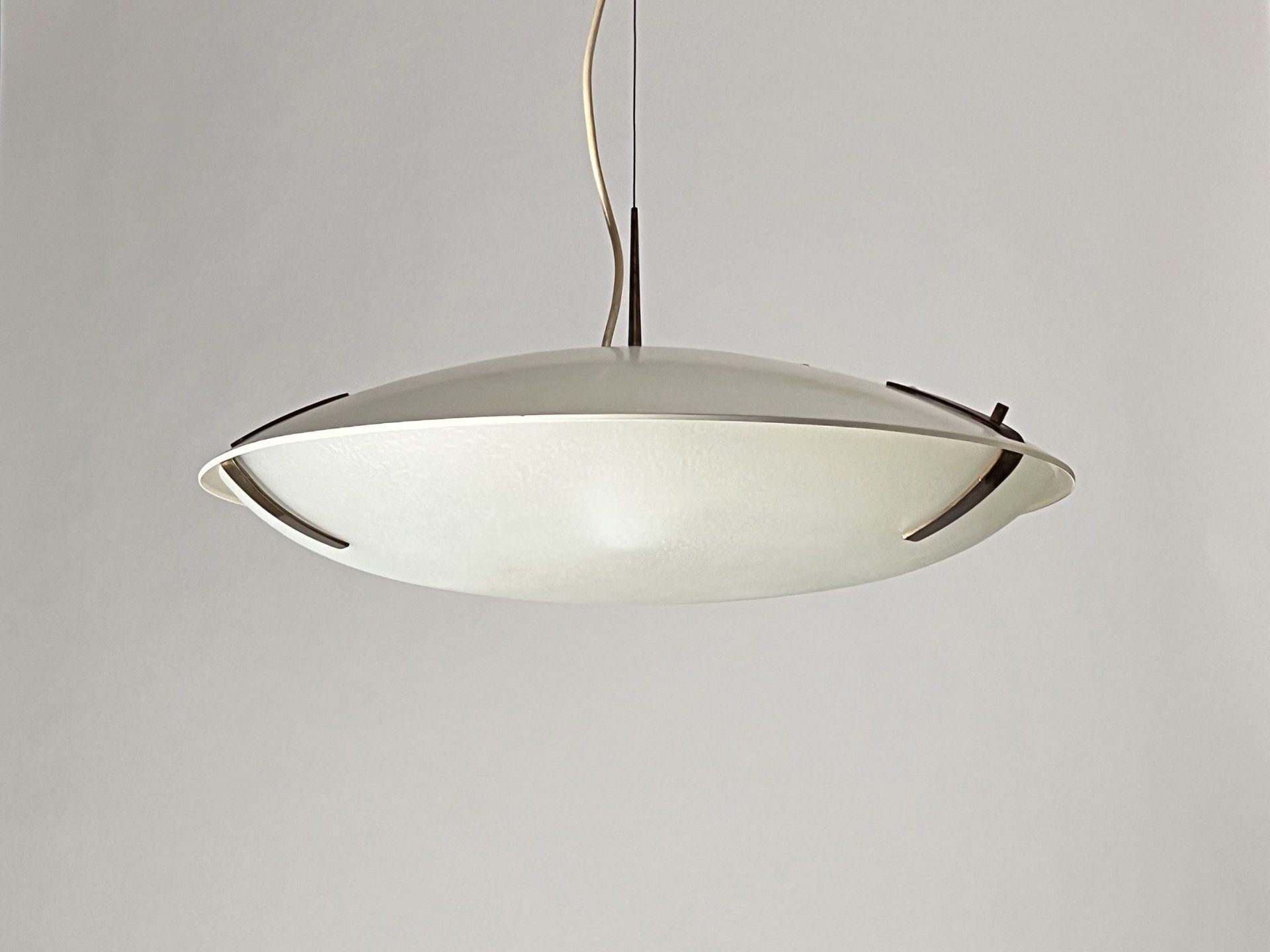 This pendant lamp produced by Stilnovo in the 1960s consists of two caps, the lower cap in etched glass, the upper cap in enamelled metal.