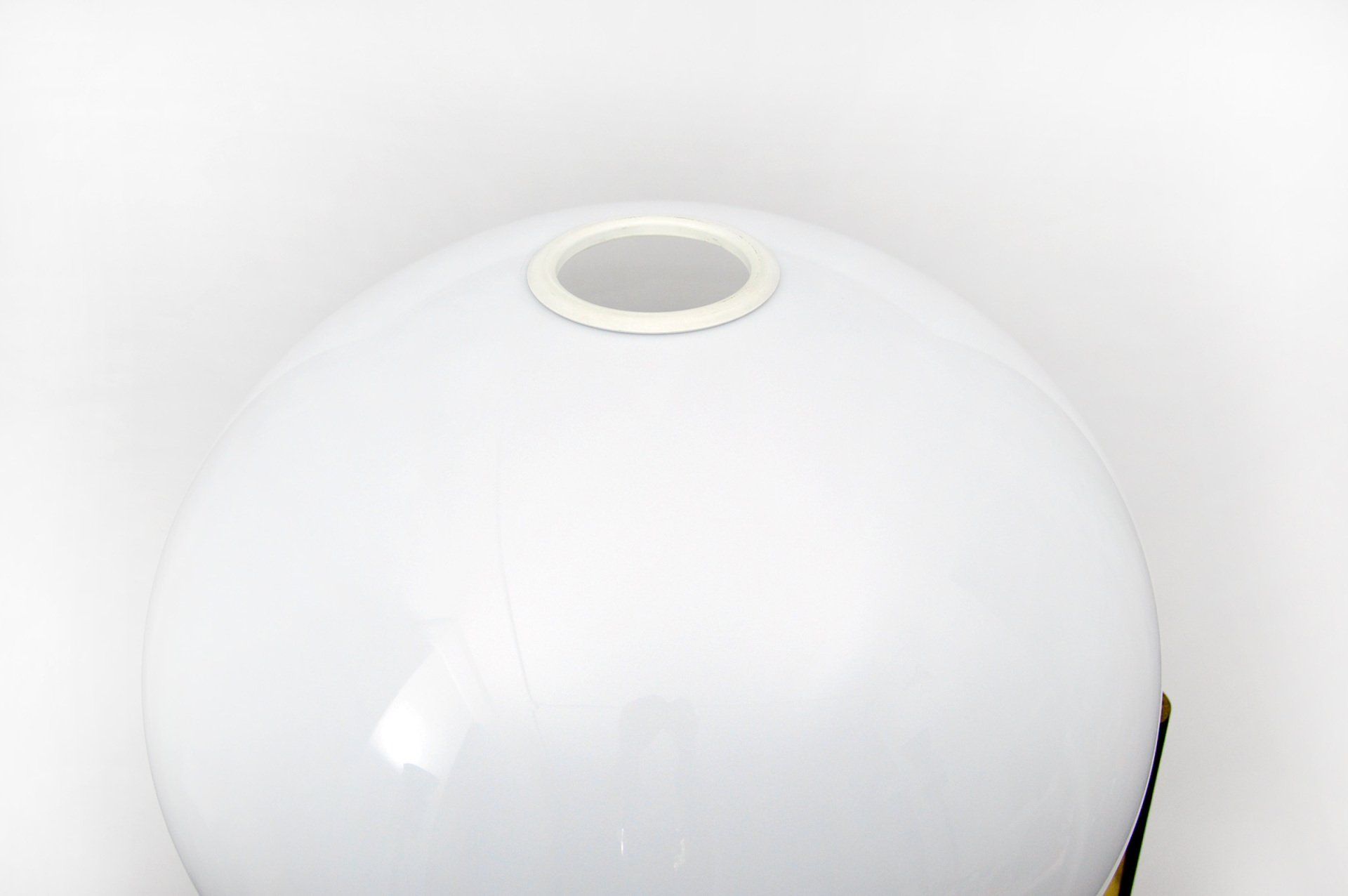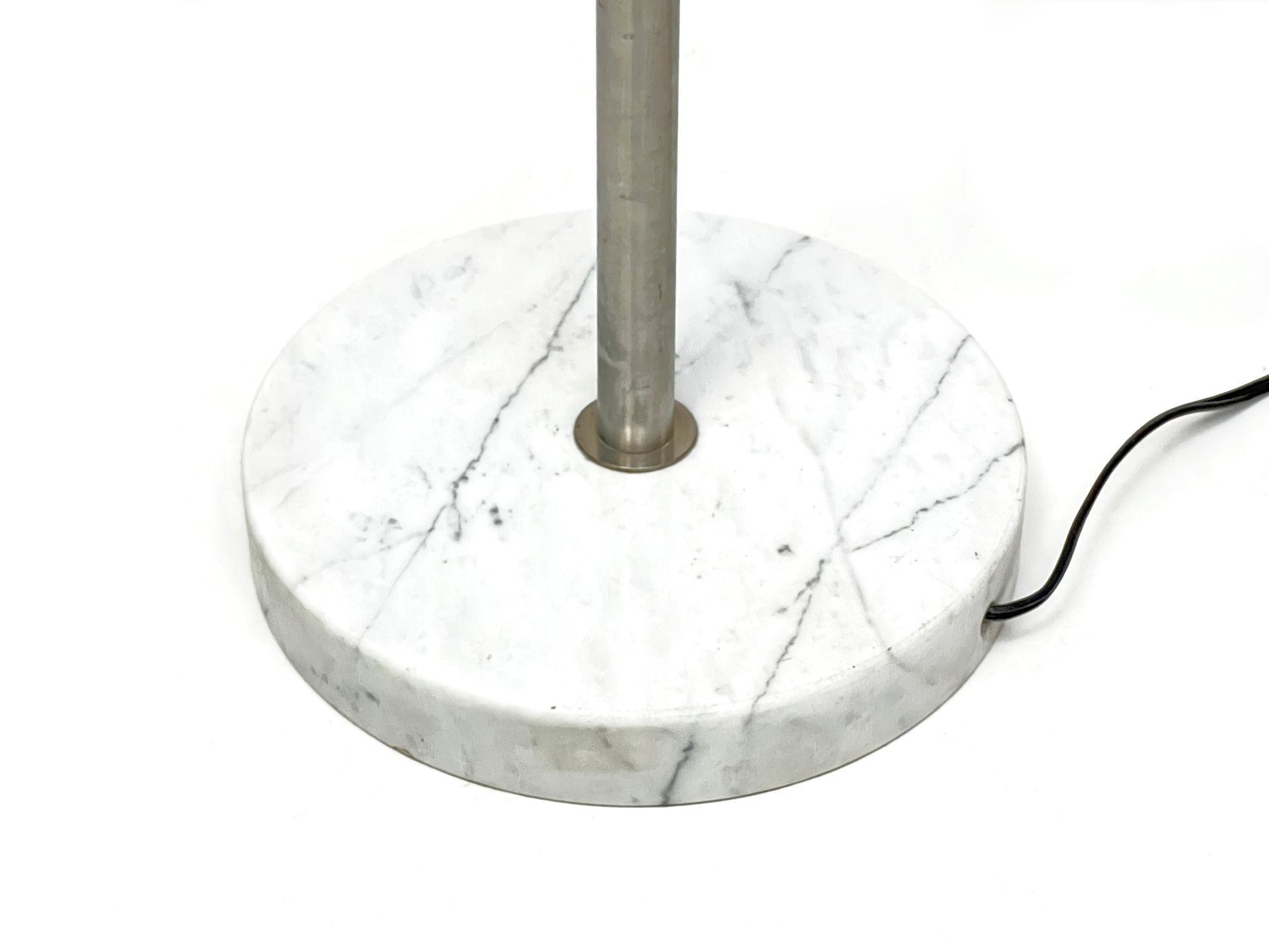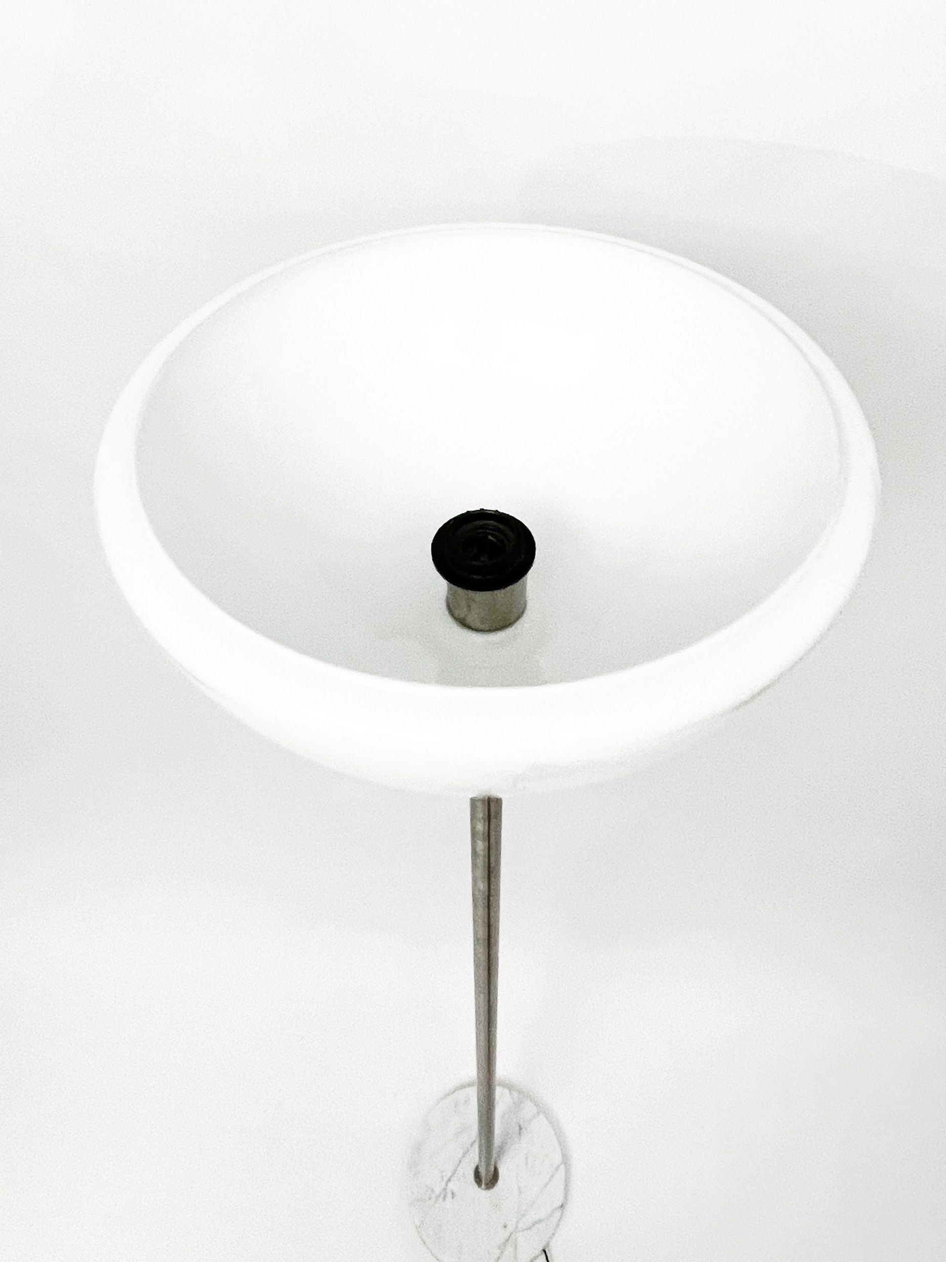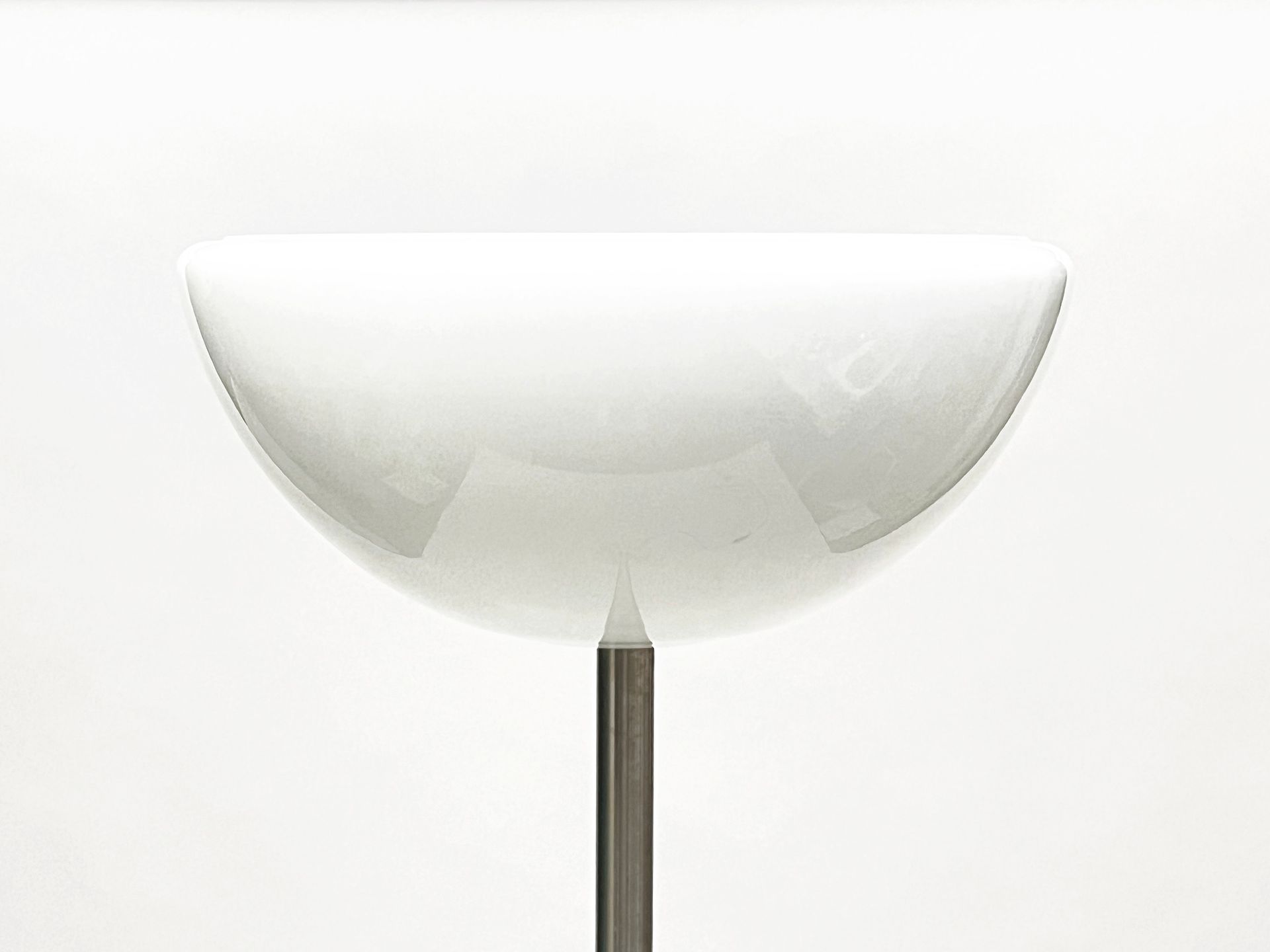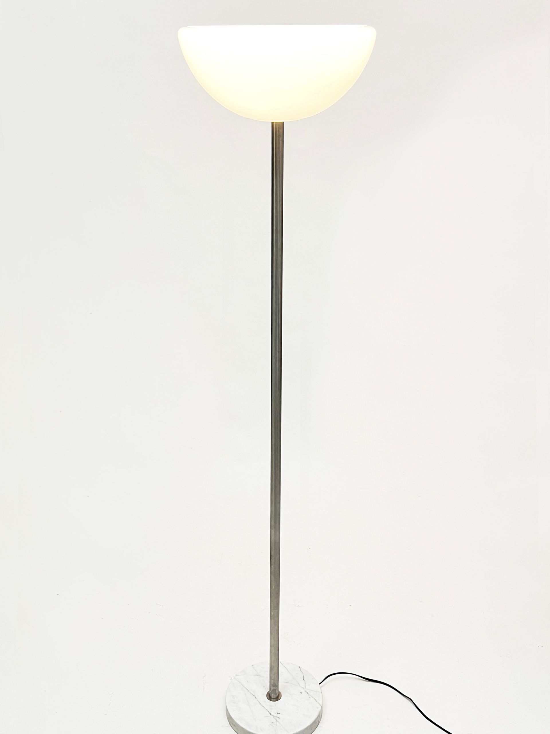 The lamp consists of an opaline glass diffuser, a brushed metal rod and a Carrara marble base. The diffuser is formed by a double blown cap which makes the shade soft and finished both outside and inside the cap. The design is minimalist but the quality of the materials and light make it a timeless classic. The condition of the floor lamp is very good apart from some slight chipping on the marble base, the flaws are highlighted in the photos but in reality are hardly visible, also because they are in the lower part of the base. The item is published in Domus issue 421 (December 1964), p. 33 - cm