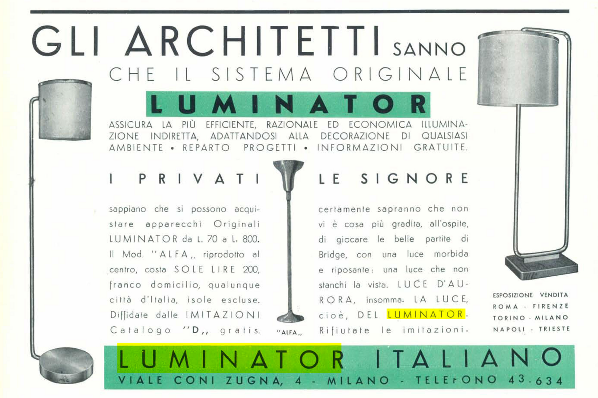 The floor lamp mod. Alfa produced by luminator italiano in the 1930s has become a true typology, And many manufacturers have copied its design in more or less detail, some such as fontana arte and flos have named their models after the company in homage to this historic model. The bulb socket is e40, but it is nevertheless fitted with an e27 adapter. Bibliography: Domus 87, march 1935, p. 22. The lamp is in good condition but has patina, small dents and signs of wear, consistent with its age, highlighted in the photos. cm H176 x W32 x D32