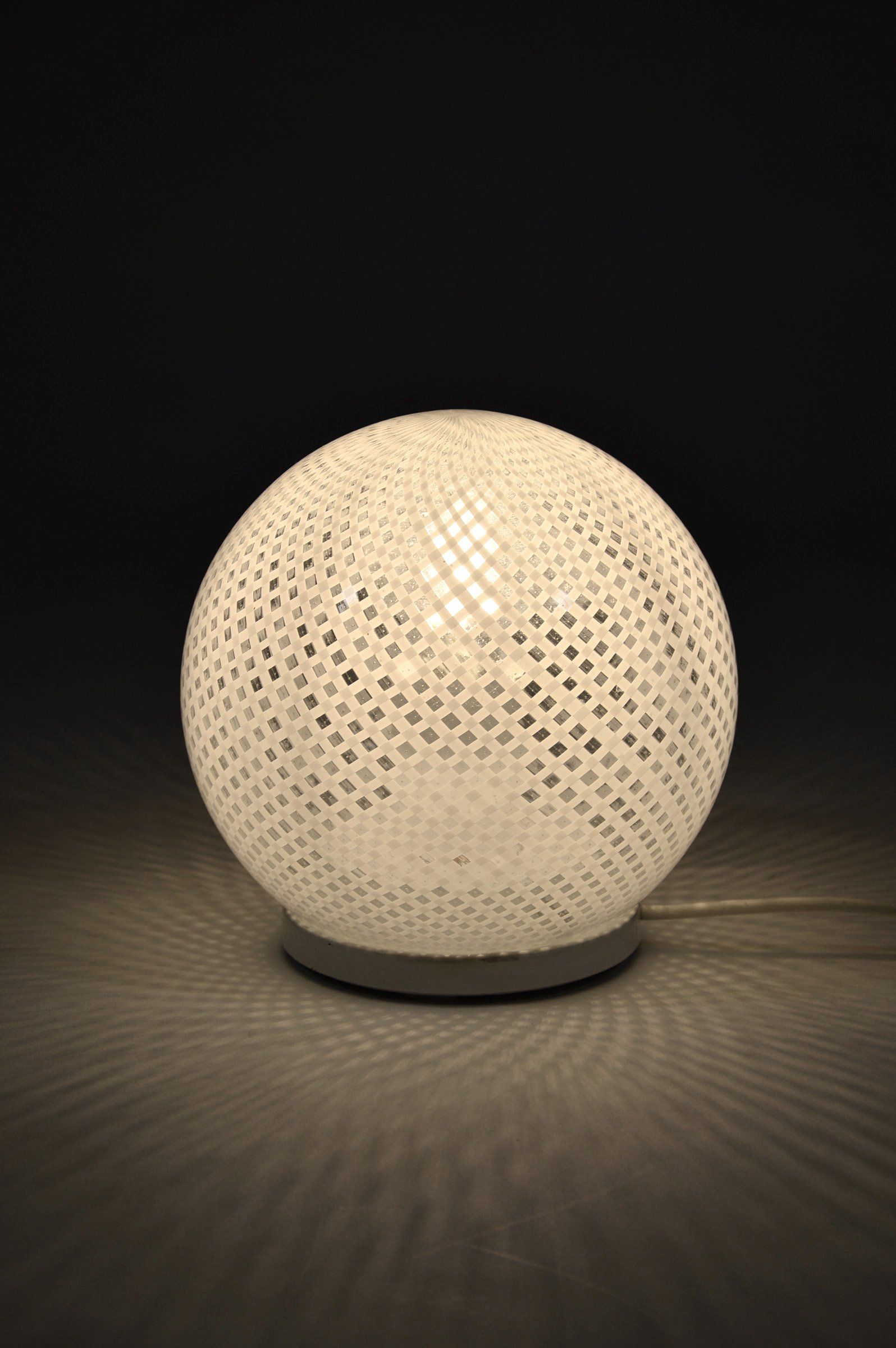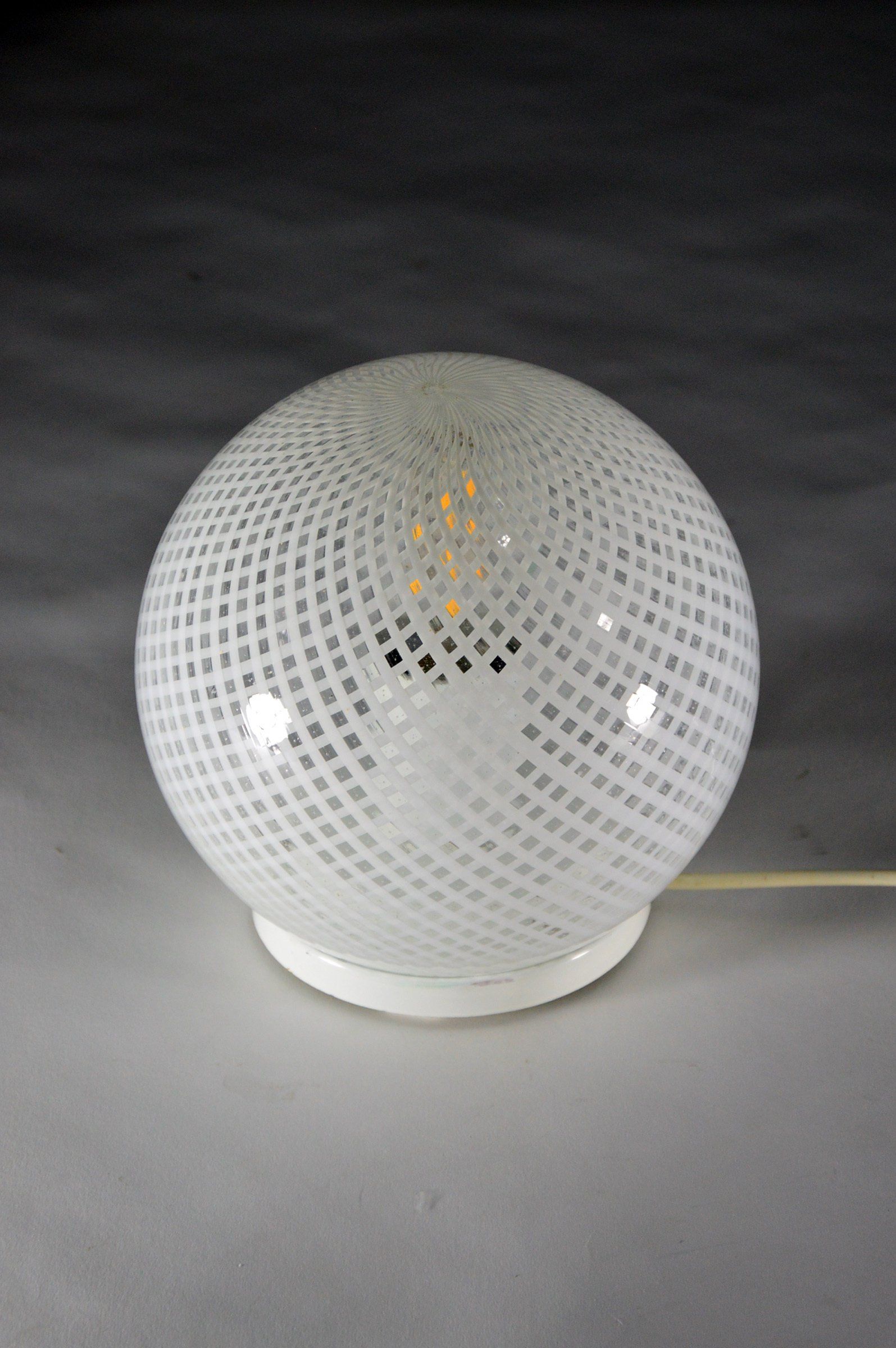 Murano glass table lamp made using the technique known as Reticello or Doppia Filigrana, one of the most difficult hot techniques to perform, invented in Murano around the middle of the 16th century. The Reticello technique is a variant of Filigrana, obtained from the double interlacing of the canes used for decoration. In practice, two overlapping and crossed rows of canes are formed and then fused together. Good Condition